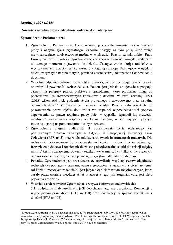 Rezolucja 2079 (2015)1 Równość i wspólna odpowiedzialność rodzicielska: rola ojców Zgromadzenie Parlamentarne 1. Zgromadzenie Parlamentarne konsekwentnie promowało równość płci w miejscu pracy i obrębie życia prywatnego. Znaczne postępy na tym polu, choć wciąż niewystarczające, zaobserwować można w większości Państw członkowskich Rady Europy. W rodzinie należy zagwarantować i promować równość pomiędzy rodzicami od samego momentu pojawienia się dziecka. Zaangażowanie obojga rodziców w wychowanie ich dziecka jest korzystne dla jego/jej rozwoju. Rola ojców względem dzieci, w tym tych bardzo małych, powinna zostać szerzej dostrzeżona i odpowiednio doceniona. 2. Wspólna odpowiedzialność rodzicielska oznacza, iż rodzice mają pewne prawa, obowiązki i powinności wobec dziecka. Faktem jest jednak, że ojcowie napotykają czasem na przepisy prawa, praktykę i uprzedzenia, które prowadzić mogą do pozbawienia ich zrównoważonych kontaktów z dziećmi. W swej Rezolucji 1921 (2013) „Równość płci, godzenie życia prywatnego i zawodowego oraz wspólna odpowiedzialność” Zgromadzenie wezwało władze Państw członkowskich do poszanowania prawa ojców do udziału we wspólnej odpowiedzialności poprzez zapewnienie, że prawo rodzinne przewiduje, w wypadku separacji lub rozwodu, możliwość sprawowania wspólnej opieki na dziećmi, w ich najlepiej pojętym interesie, opartej na porozumieniu między rodzicami. 3. Zgromadzenie pragnie podkreślić, iż poszanowanie życia rodzinnego jest podstawowym prawem zawartym w Artykule 8 Europejskiej Konwencji Praw Człowieka (ETS nr 5) oraz wielu międzynarodowych instrumentach prawnych. Dla rodzica i dziecka możność bycia razem stanowi konieczny element życia rodzinnego. Rozdzielenie dziecka i rodzica niesie za sobą nieodwracalne skutki dla relacji między nimi. O takim rozdzieleniu powinny orzekać wyłącznie sądy i tylko w wyjątkowych okolicznościach wiążących się z poważnym ryzykiem dla interesu dziecka. 4. Ponadto, Zgromadzenie jest przekonane, że rozwijanie wspólnej odpowiedzialności rodzicielskiej pomaga w przełamywaniu stereotypów [związanych z płcią] na temat ról kobiet i mężczyzn w rodzinie i jest jedynie odbiciem zmian socjologicznych, które zaszły przez ostatnie pięćdziesiąt lat w zakresie tego, jak zorganizowana jest sfera prywatna i rodzinna. 5. W świetle tych rozważań Zgromadzenie wzywa Państwa członkowskie do: 5.1. podpisania i/lub ratyfikacji, jeśli dotychczas tego nie uczyniono, Konwencji o wykonywaniu praw dzieci (ETS nr 160) oraz Konwencji w sprawie kontaktów z dziećmi (ETS nr 192); Debata Zgromadzenia w dn. 2 października 2015 r. (36 posiedzenie) (zob. Dok. 13870, raport Komitetu ds. Równości i Niedyskryminacji, sprawozdawca: Pani Françoise Hetto-Gaasch; oraz Dok. 13896, opinia Komitetu ds. Spraw Społecznych, Zdrowia i Zrównoważonego Rozwoju, sprawozdawca: Mr Stefan Schennach). Tekst przyjęty przez Zgromadzenie w dn. 2 października 2015 r. (36 posiedzenie). 1 5.2. podpisania i/lub ratyfikacji, jeśli dotychczas tego nie uczyniono, Konwencji haskiej dotyczącej cywilnych aspektów uprowadzenia dziecka za granicę z 1980 r. i jej prawidłowego wdrożenia, zapewniając, by stosujące ją organy współpracowały i działały szybko; 5.3. zapewnienia, by rodzice mieli równe prawa względem ich dzieci w świetle prawa i praktyki administracyjnej gwarantujących każdemu z rodziców prawo do informacji i wpływu na ważne decyzje oddziałujące na życie i rozwój ich dziecka [działając] w najlepiej pojętym interesie dziecka; 5.4. usunięcia ze swego porządku prawnego wszelkich różnic związanych ze stanem cywilnym rodziców, którzy uznali swe dzieci; 5.5. wprowadzenia do prawa krajowego zasady wspólnego zamieszkiwania [z dzieckiem przez każdego z rodziców]i po separacji, ograniczając wszelkie wyjątki do przypadków nadużyć wobec dzieci lub ich zaniedbywania czy przemocy domowej, dostosowując czas, w którym dziecko zamieszkuje z każdym z rodziców adekwatnie do jego potrzeb i interesu; 5.6. poszanowania praw dzieci do bycia wysłuchanymi we wszystkich kwestiach, które ich dotyczą jeśli uznano, iż w wystarczającym stopniu te kwestie rozumieją; 5.7. brania pod uwagę porozumień dotyczących wspólnego zamieszkiwania [z dzieckiem przez każdego z rodziców] przy przyznawaniu świadczeń socjalnych; 5.8. podjęcia wszelkich niezbędnych kroków w celu zapewnienia pełnego wykonania decyzji dotyczących miejsca zamieszkania dziecka, w tym weryfikacji skarg na uchybienie tym decyzjom; 5.9. zachęcania [do korzystania] oraz, gdy to wskazane, ustanowienia mediacji w ramach postępowania sądowego w sprawach rodzinnych z udziałem dzieci, w tym zarządzonych przez sąd sesji informacyjnych, w celu uświadomienia rodzicom, iż wspólne zamieszkiwanie [z dzieckiem przez każdego z rodziców] może być odpowiednim rozwiązaniem w świetle najlepiej pojętego interesu dziecka, oraz podejmowania działań na rzecz takiego rozwiązania poprzez zapewnienie mediatorom odpowiedniego przeszkolenia, a także wspierania multidyscyplinarnej współpracy opartej na „modelu z Cochem”; 5.10. zapewnienia, że specjaliści mający kontakt z dziećmi w trakcie postępowania sądowego w sprawach rodzinnych przejdą odpowiednie szkolenie na temat szczególnych praw i potrzeb dzieci z różnych grup wiekowych, a także odpowiednio dostosowanych postępowań, zgodnie z Wytyczanymi Rady Europy w sprawie wymiaru sprawiedliwości przyjaznego dzieciom; 5.11. zachęcania [do tworzenia] planów rodzicielskich pozwalających rodzicom na samodzielne ustalenie podstawowych aspektów życia ich dzieci, a także umożliwienia dzieciom wnioskowania o rewizję ustaleń, które bezpośrednio ich dotyczą, w szczególności odnoszących się do och miejsca zamieszkania; 5.12. wprowadzenia płatnych urlopów wychowawczych dla ojców, preferując przy tym model ni