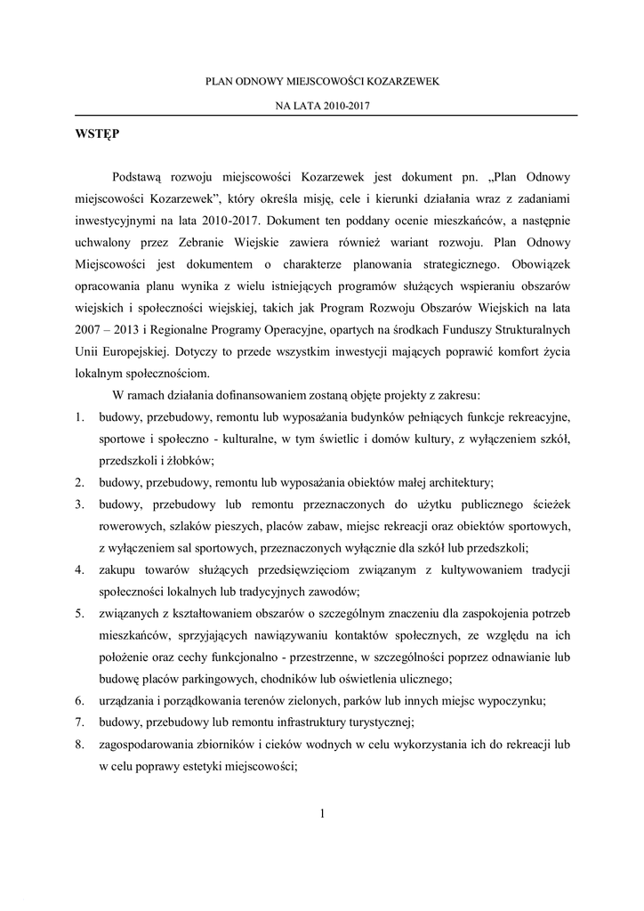 PLAN ODNOWY MIEJSCOWOŚCI KOZARZEWEK NA LATA 2010-2017 WSTĘP Podstawą rozwoju miejscowości Kozarzewek jest dokument pn. „Plan Odnowy miejscowości Kozarzewek”, który określa misję, cele i kierunki działania wraz z zadaniami inwestycyjnymi na lata 2010-2017. Dokument ten poddany ocenie mieszkańców, a następnie uchwalony przez Zebranie Wiejskie zawiera również wariant rozwoju. Plan Odnowy Miejscowości jest dokumentem o charakterze planowania strategicznego. Obowiązek opracowania planu wynika z wielu istniejących programów służących wspieraniu obszarów wiejskich i społeczności wiejskiej, takich jak Program Rozwoju Obszarów Wiejskich na lata 2007 – 2013 i Regionalne Programy Operacyjne, opartych na środkach Funduszy Strukturalnych Unii Europejskiej. Dotyczy to przede wszystkim inwestycji mających poprawić komfort życia lokalnym społecznościom. W ramach działania dofinansowaniem zostaną objęte projekty z zakresu: 1. budowy, przebudowy, remontu lub wyposażania budynków pełniących funkcje rekreacyjne, sportowe i społeczno - kulturalne, w tym świetlic i domów kultury, z wyłączeniem szkół, przedszkoli i żłobków; 2. budowy, przebudowy, remontu lub wyposażania obiektów małej architektury; 3. budowy, przebudowy lub remontu przeznaczonych do użytku publicznego ścieżek rowerowych, szlaków pieszych, placów zabaw, miejsc rekreacji oraz obiektów sportowych, z wyłączeniem sal sportowych, przeznaczonych wyłącznie dla szkół lub przedszkoli; 4. zakupu towarów służących przedsięwzięciom związanym z kultywowaniem tradycji społeczności lokalnych lub tradycyjnych zawodów; 5. związanych z kształtowaniem obszarów o szczególnym znaczeniu dla zaspokojenia potrzeb mieszkańców, sprzyjających nawiązywaniu kontaktów społecznych, ze względu na ich położenie oraz cechy funkcjonalno - przestrzenne, w szczególności poprzez odnawianie lub budowę placów parkingowych, chodników lub oświetlenia ulicznego; 6. urządzania i porządkowania terenów zielonych, parków lub innych miejsc wypoczynku; 7. budowy, przebudowy lub remontu infrastruktury turystycznej; 8. zagospodarowania zbiorników i cieków wodnych w celu wykorzystania ich do rekreacji lub w celu poprawy estetyki miejscowości; 1 PLAN ODNOWY MIEJSCOWOŚCI KOZARZEWEK NA LATA 2010-2017 9. rewitalizacji budynków wpisanych do rejestru zabytków lub objętych wojewódzką ewidencją zabytków, użytkowanych na cele publiczne oraz obiektów małej architektury, odnawiania lub konserwacji lokalnych pomników historycznych i miejsc pamięci; 10. zakupu i odnawiania obiektów charakterystycznych dla danego regionu lub tradycji budownictwa wiejskiego i ich adaptacji na cele publiczne; 11. budowy, przebudowy, remontu lub wyposażania obiektów budowlanych przeznaczonych na cele promocji lokalnych produktów i usług, w tym pawilonów, punktów wystawowych, sal ekspozycyjnych lub witryn; 12. odnawiania elewacji zewnętrznych i dachów w budynkach architektury sakralnej wpisanych do rejestru zabytków lub objętych wojewódzką ewidencją zabytków i odnawiania cmentarzy wpisanych do rejestru zabytków; 13. wyburzenia i rozbiórki zdewastowanych obiektów budowlanych w celu uporządkowania terenu w miejscowości, jeżeli niemożliwe jest ich odnowienie i dalsze użytkowanie – w zakresie koniecznym do realizacji operacji wymienionych w pkt 1-12; 14. zakupu materiału siewnego lub nasadzeniowego roślin wieloletnich — koniecznego do realizacji operacji; 15. zakupu sprzętu, materiałów i usług, służących realizacji operacji; 16. ogólnych, które są bezpośrednio związane z przygotowaniem i realizacją operacji Zapisy „Planu Odnowy Miejscowości Kozarzewek” są spójne z Narodową Strategią Spójności na lata 2007 – 2013, Strategią Rozwoju Obszarów Wiejskich i Rolnictwa na lata 2007 – 2013, Strategią Rozwoju Województwa Wielkopolskiego. Cele i działania zaproponowane w omawianym opracowaniu nawiązują do dokumentów strategicznych wyższego rzędu. W dalszej części opracowania przedstawiono analizę SWOT, wybrano misję, cele i kierunki działania oraz Plan Inwestycyjny dla miejscowości Kozarzewek. Niniejszy plan jest planem otwartym, stwarzającym możliwość aktualizacji w zależności od potrzeb społecznych, gospodarczych i uwarunkowań finansowych. Oznacza to, że mogą być dopisywane nowe zadania lub zmieniana ich kolejność realizacji w przedziale czasowym w zależności od możliwości finansowych (dostępu do funduszy zewnętrznych). Głównym celem opracowania jest określenie potrzeb inwestycyjnych, kluczowych obszarów odnowy wsi i analiza planowanych przedsięwzięć. 2 PLAN ODNOWY MIEJSCOWOŚCI KOZARZEWEK NA LATA 2010-2017 Potrzeba opracowania Planu Odnowy Miejscowości Kozarzewek wynika z kilku przesłanek. Najważniejszą z nich jest konieczność zaprogramowania skoordynowanych działań, które w określonej przestrzeni, czasie i sytuacji społeczno-politycznej, uwzględniając środki, jakimi dysponuje społeczność gminy oraz możliwe do pozyskania dofinansowanie ze środków Unii Europejskiej, dadzą oczekiwane efekty. Plan Odnowy Miejscowości Kozarzewek ma się przyczyniać do poprawy jakości życia na obszarach wiejskich przez zaspokojenie potrzeb społecznych i kulturalnych mieszkańców wsi oraz promowanie obszarów wiejskich. Podejmowane działania umożliwią rozwój tożsamości społeczności wiejskiej, zachowanie dziedzictwa kulturowego i specyfiki obszarów wiejskich oraz wpłyną na wzrost atrakcyjności turystycznej i inwestycyjnej obszarów wiejskich. Plan ma stanowić z jednej strony program działania, formułujący cele strategiczne władz lokalnych, z drugiej zaś ma stać się formalną podstawą, umożliwiającą ubieganie się o środki wsparcia z budżetu państwa, jak i o środki pomocowe Unii Europejskiej i międzynarodowych instytucji finansowych. Plan Odnowy Miejscowości Kozarzewek: Ø formułuje cele strategi