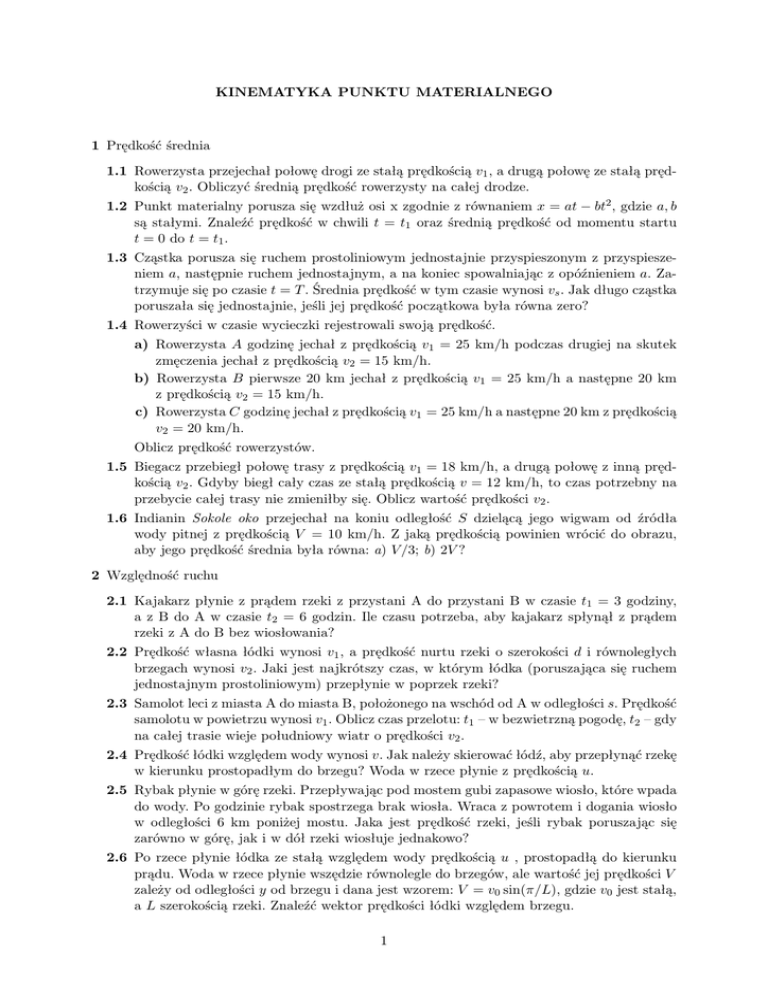 KINEMATYKA PUNKTU MATERIALNEGO 1 Prędkość średnia 1.1 Rowerzysta przejechał połowę drogi ze stałą prędkością v1 , a drugą połowę ze stałą prędkością v2 . Obliczyć średnią prędkość rowerzysty na całej drodze. 1.2 Punkt materialny porusza się wzdłuż osi x zgodnie z równaniem x = at − bt2 , gdzie a, b są stałymi. Znaleźć prędkość w chwili t = t1 oraz średnią prędkość od momentu startu t = 0 do t = t1 . 1.3 Cząstka porusza się ruchem prostoliniowym jednostajnie przyspieszonym z przyspieszeniem a, następnie ruchem jednostajnym, a na koniec spowalniając z opóźnieniem a. Zatrzymuje się po czasie t = T . Średnia prędkość w tym czasie wynosi vs . Jak długo cząstka poruszała się jednostajnie, jeśli jej prędkość początkowa była równa zero? 1.4 Rowerzyści w czasie wycieczki rejestrowali swoją prędkość. a) Rowerzysta A godzinę jechał z prędkością v1 = 25 km/h podczas drugiej na skutek zmęczenia jechał z prędkością v2 = 15 km/h. b) Rowerzysta B pierwsze 20 km jechał z prędkością v1 = 25 km/h a następne 20 km z prędkością v2 = 15 km/h. c) Rowerzysta C godzinę jechał z prędkością v1 = 25 km/h a następne 20 km z prędkością v2 = 20 km/h. Oblicz prędkość rowerzystów. 1.5 Biegacz przebiegł połowę trasy z prędkością v1 = 18 km/h, a drugą połowę z inną prędkością v2 . Gdyby biegł cały czas ze stałą prędkością v = 12 km/h, to czas potrzebny na przebycie całej trasy nie zmieniłby się. Oblicz wartość prędkości v2 . 1.6 Indianin Sokole oko przejechał na koniu odległość S dzielącą jego wigwam od źródła wody pitnej z prędkością V = 10 km/h. Z jaką prędkością powinien wrócić do obrazu, aby jego prędkość średnia była równa: a) V /3; b) 2V ? 2 Względność ruchu 2.1 Kajakarz płynie z prądem rzeki z przystani A do przystani B w czasie t1 = 3 godziny, a z B do A w czasie t2 = 6 godzin. Ile czasu potrzeba, aby kajakarz spłynął z prądem rzeki z A do B bez wiosłowania? 2.2 Prędkość własna łódki wynosi v1 , a prędkość nurtu rzeki o szerokości d i równoległych brzegach wynosi v2 . Jaki jest najkrótszy czas, w którym łódka (poruszająca się ruchem jednostajnym prostoliniowym) przepłynie w poprzek rzeki? 2.3 Samolot leci z miasta A do miasta B, położonego na wschód od A w odległości s. Prędkość samolotu w powietrzu wynosi v1 . Oblicz czas przelotu: t1 – w bezwietrzną pogodę, t2 – gdy na całej trasie wieje południowy wiatr o prędkości v2 . 2.4 Prędkość łódki względem wody wynosi v. Jak należy skierować łódź, aby przepłynąć rzekę w kierunku prostopadłym do brzegu? Woda w rzece płynie z prędkością u. 2.5 Rybak płynie w górę rzeki. Przepływając pod mostem gubi zapasowe wiosło, które wpada do wody. Po godzinie rybak spostrzega brak wiosła. Wraca z powrotem i dogania wiosło w odległości 6 km poniżej mostu. Jaka jest prędkość rzeki, jeśli rybak poruszając się zarówno w górę, jak i w dół rzeki wiosłuje jednakowo? 2.6 Po rzece płynie łódka ze stałą względem wody prędkością u , prostopadłą do kierunku prądu. Woda w rzece płynie wszędzie równolegle do brzegów, ale wartość jej prędkości V zależy od odległości y od brzegu i dana jest wzorem: V = v0 sin(π/L), gdzie v0 jest stałą, a L szerokością rzeki. Znaleźć wektor prędkości łódki względem brzegu. 1 2.7 Dwa samochody poruszają się po dwóch prostoliniowych i wzajemnie prostopadłych drogach w kierunku ich przecięcia ze stałymi szybkościami v1 = 50 km/h i v2 = 100 km/h. Przed rozpoczęciem ruchu pierwszy samochód znajdował się w odległości s1 = 100 km od skrzyżowania dróg, a drugi w odległości s2 = 50 km od ich przecięcia. Po jakim czasie od chwili rozpoczęcia ruchu odległość miedzy samochodami będzie najmniejsza? 2.8 Krople deszczu spadają na ziemię z chmury znajdującej się na wysokości 1700 m. Oblicz, jaką wartość prędkości (w km/h) miałyby te krople w chwili upadku na ziemię, gdyby ich ruch nie był spowalniany w wyniku oporu powietrza. 2.9 Dwóch pływaków A i B skacze jednocześnie do rzeki, w której woda płynie z prędkością v. Prędkość c (c > v) każdego pływaka względem wody jest taka sama. Pływak A przepływa z prądem odległość L i zawraca do punktu startu. Pływak B płynie prostopadle do brzegów rzeki (pomimo znoszącego go prądu) i oddala się na odległość L, po czym zawraca do punktu startu. Który z nich wróci pierwszy? 3 Ruch jednostajnie przyspieszony 3.1 Elektron przyspiesza jednostajnie w lampie katodowej od prędkości 3, 0 · 104 m/s do prędkości 5, 0 · 106 m/s na odcinku drogi o długości 2, 0 cm. Ile czasu trwa przyspieszony ruch elektronu? 3.2 Z helikoptera wznoszącego się z przyspieszeniem a = 1 m/s2 na wysokości H = 450 m wypada lampa naftowa. Znaleźć szybkość końcową i czas spadku lampy na ziemię. 3.3 Prędkość ciała poruszającego się wzdłuż osi 0x dana jest równaniem v = (100 − 32x)1/2 m/s. Jakim ruchem porusza się to ciało? Jaka jest prędkość początkowa oraz przyspieszenie ciała? Ciało rozpoczęło ruch z punktu x = 0. 3.4 Szyszka spadająca swobodnie z czubka sosny podczas ostatniej sekundy ruchu przebyła połowę wysokości drzewa. Jak długo i z jakiej wysokości spadała szyszka? 3.5 Policz po jakim czasie znajdzie się na wysokości H piłka rzucona pionowo do góry z prędkością początkową v0 . Przedyskutuj możliwe rozwiązania. 3.6 Wiewiórka spada z drzewa. Gdy przebyła ona drogę d z drzewa zaczyna spadać informatyk, który zdołał wspiąć się na odległość h od wierzchołka. Wiewiórka i informatyk spadają na ziemię w tej samej chwili. Policz wysokość drzewa. 3.7 Biegacz, biegnąc po prostej, przyspiesza jednostajnie od stanu spoczynku do prędkości v1 = 5 m/s w czasie t1 = 2 s. Następnie biegnie jednostajnie z prędkością v1 przez czas t2 = 10 s. Jakie jest przyspieszenie bie