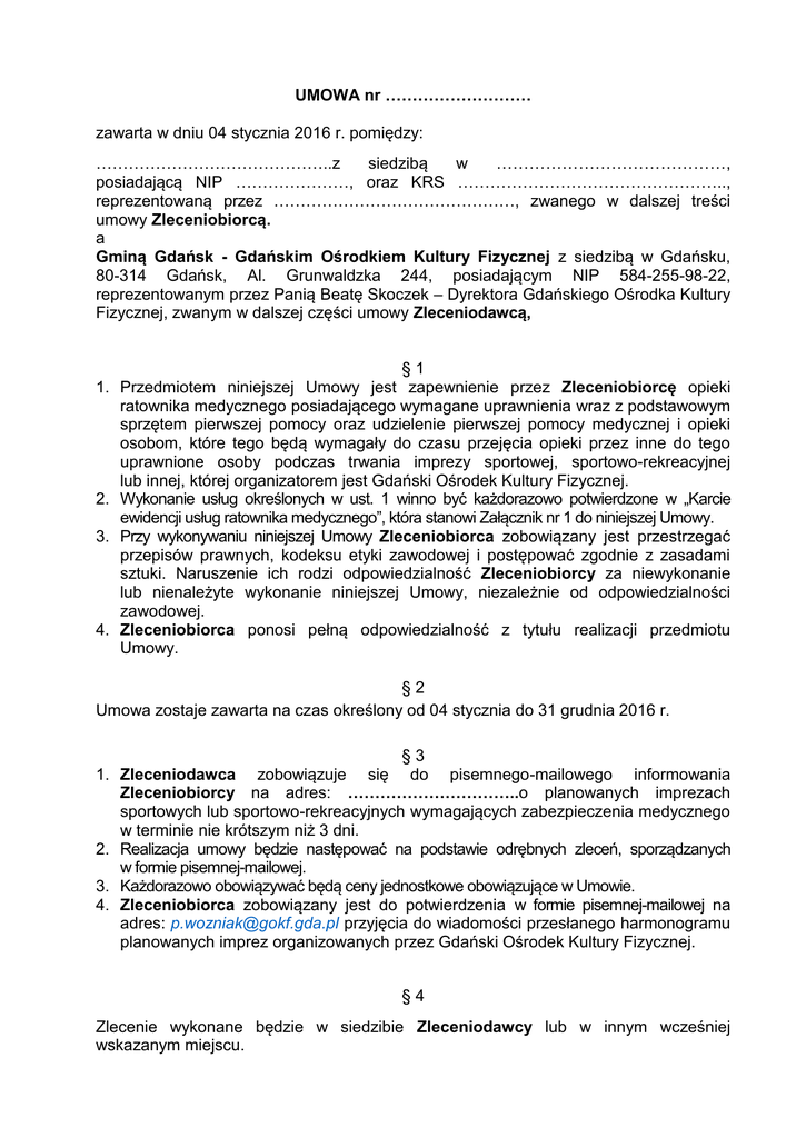 UMOWA nr ……………………… zawarta w dniu 04 stycznia 2016 r. pomiędzy: ……………………………………..z siedzibą w ……………………………………, posiadającą NIP …………………, oraz KRS ………………………………………….., reprezentowaną przez ………………………………………, zwanego w dalszej treści umowy Zleceniobiorcą. a Gminą Gdańsk - Gdańskim Ośrodkiem Kultury Fizycznej z siedzibą w Gdańsku, 80-314 Gdańsk, Al. Grunwaldzka 244, posiadającym NIP 584-255-98-22, reprezentowanym przez Panią Beatę Skoczek – Dyrektora Gdańskiego Ośrodka Kultury Fizycznej, zwanym w dalszej części umowy Zleceniodawcą, §1 1. Przedmiotem niniejszej Umowy jest zapewnienie przez Zleceniobiorcę opieki ratownika medycznego posiadającego wymagane uprawnienia wraz z podstawowym sprzętem pierwszej pomocy oraz udzielenie pierwszej pomocy medycznej i opieki osobom, które tego będą wymagały do czasu przejęcia opieki przez inne do tego uprawnione osoby podczas trwania imprezy sportowej, sportowo-rekreacyjnej lub innej, której organizatorem jest Gdański Ośrodek Kultury Fizycznej. 2. Wykonanie usług określonych w ust. 1 winno być każdorazowo potwierdzone w „Karcie ewidencji usług ratownika medycznego”, która stanowi Załącznik nr 1 do niniejszej Umowy. 3. Przy wykonywaniu niniejszej Umowy Zleceniobiorca zobowiązany jest przestrzegać przepisów prawnych, kodeksu etyki zawodowej i postępować zgodnie z zasadami sztuki. Naruszenie ich rodzi odpowiedzialność Zleceniobiorcy za niewykonanie lub nienależyte wykonanie niniejszej Umowy, niezależnie od odpowiedzialności zawodowej. 4. Zleceniobiorca ponosi pełną odpowiedzialność z tytułu realizacji przedmiotu Umowy. §2 Umowa zostaje zawarta na czas określony od 04 stycznia do 31 grudnia 2016 r. 1. 2. 3. 4. §3 Zleceniodawca zobowiązuje się do pisemnego-mailowego informowania Zleceniobiorcy na adres: …………………………..o planowanych imprezach sportowych lub sportowo-rekreacyjnych wymagających zabezpieczenia medycznego w terminie nie krótszym niż 3 dni. Realizacja umowy będzie następować na podstawie odrębnych zleceń, sporządzanych w formie pisemnej-mailowej. Każdorazowo obowiązywać będą ceny jednostkowe obowiązujące w Umowie. Zleceniobiorca zobowiązany jest do potwierdzenia w formie pisemnej-mailowej na adres: [email protected] przyjęcia do wiadomości przesłanego harmonogramu planowanych imprez organizowanych przez Gdański Ośrodek Kultury Fizycznej. §4 Zlecenie wykonane będzie w siedzibie Zleceniodawcy lub w innym wcześniej wskazanym miejscu. 1. 2. 3. 4. §5 Za wykonane czynności zgodnie z §1 Zleceniobiorcy przysługuje wynagrodzenie brutto w wysokości…………….. zł/godz. (słownie: ……………………………………). Usługa świadczona przez niepełną godzinę będzie płatna proporcjonalnie do stawki podstawowej. Każde nie odwołane zlecenie wykonania usługi (mimo nie odbycia się imprezy) będzie płatne w wysokości …………….. (2 godziny zegarowe). Wynagrodzenie miesięczne stanowić będzie iloczyn sumy godzin i minut zaewidencjonowanych i zatwierdzonych przez Zleceniodawcę z „Kart ewidencji usług ratownika medycznego” wymienionych w § 1 ust. 3 oraz stawki za 1 godzinę określoną w § 5 ust. 1. Wypłata wynagrodzenia za usługi świadczone przez Zleceniobiorcę będzie dokonywana przez Zleceniodawcę przelewem bankowym raz w miesiącu na konto bankowe nr XX XXXX XXXX XXXX XXXX XXXX XXXX po przedstawieniu przez Zleceniobiorcę rachunku wraz z zestawieniem godzinowym wynikającym z „Kart ewidencji usług ratownika medycznego”. §6 Niepełna realizacja przez Zleceniobiorcę zlecenia/obowiązków zawartych w §1 spowoduje pomniejszenie lub całkowite pozbawienie ustalonego wyżej wynagrodzenia w zależności od stopnia stwierdzonych niedociągnięć. §7 Zleceniobiorca ponosi pełną odpowiedzialność za nie wywiązanie się z powyższej Umowy włącznie z odpowiedzialnością cywilną za nie zapewnienie opieki medycznej. §8 Zmiany niniejszej Umowy wymagają formy pisemnej. §9 Do spraw nieuregulowanych Umową stosuje się przepisy Kodeksu Cywilnego. § 10 1. Spory wynikające ze skutku zawarcia niniejszej Umowy, będą rozstrzygane na drodze mediacji pomiędzy stronami. 2. W przypadku braku ugody strony poddadzą się rozstrzygnięciu sporu przez Sąd właściwy dla Zleceniodawcy. § 11 Niniejsza Umowa nie rodzi żadnych skutków w zakresie uprawnień pracowniczych wynikających ze stosunku pracy. § 12 Umowę sporządzono w dwóch jednobrzmiących egzemplarzach po jednym dla każdej ze stron. ZLECENIOBIORCA: ZLECENIODAWCA: Załącznik nr 1 KARTA EWIDENCJI USŁUG RATOWNIKA MEDYCZNEGO nr /2016 NAZWA FIRMY ADRES SIEDZIBY Rodzaj imprezy: Miejsce imprezy: Imię i Nazwisko Ratownika: Data: Łączna ilość godzin: Planowany czas trwania imprezy: od Rzeczywisty czas trwania imprezy: od do do Opis zdarzeń wymagających interwencji ratownika podczas imprezy: 1. Imię i nazwisko poszkodowanego: 2. Szkoła, klasa, wiek poszkodowanego: 3. Godzina i miejsce zdarzenia: 4. Przyczyny i rodzaj zdarzenia: 5. Opis wykonywanych czynności przy udzielaniu pierwszej pomocy: 6. Czytelny podpis opiekuna osoby poszkodowanej: Podpis ratownika: Podpis prowadzącego imprezę: ………………………………. ……………………………………………….