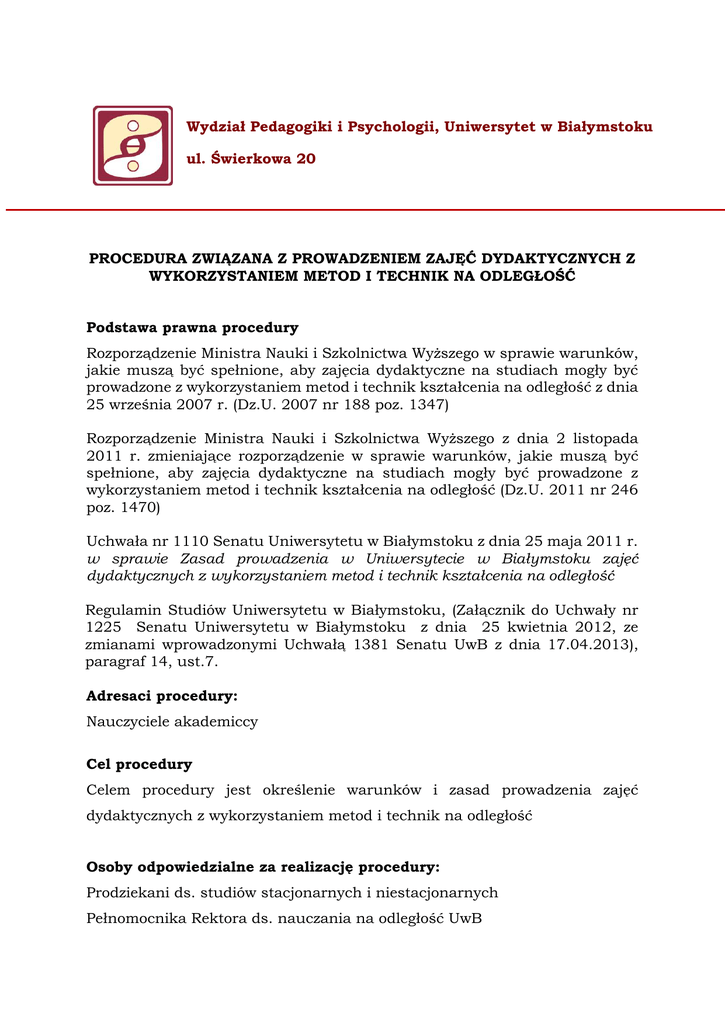 Wydział Pedagogiki i Psychologii, Uniwersytet w Białymstoku ul. Świerkowa 20 PROCEDURA ZWIĄZANA Z PROWADZENIEM ZAJĘĆ DYDAKTYCZNYCH Z WYKORZYSTANIEM METOD I TECHNIK NA ODLEGŁOŚĆ Podstawa prawna procedury Rozporządzenie Ministra Nauki i Szkolnictwa Wyższego w sprawie warunków, jakie muszą być spełnione, aby zajęcia dydaktyczne na studiach mogły być prowadzone z wykorzystaniem metod i technik kształcenia na odległość z dnia 25 września 2007 r. (Dz.U. 2007 nr 188 poz. 1347) Rozporządzenie Ministra Nauki i Szkolnictwa Wyższego z dnia 2 listopada 2011 r. zmieniające rozporządzenie w sprawie warunków, jakie muszą być spełnione, aby zajęcia dydaktyczne na studiach mogły być prowadzone z wykorzystaniem metod i technik kształcenia na odległość (Dz.U. 2011 nr 246 poz. 1470) Uchwała nr 1110 Senatu Uniwersytetu w Białymstoku z dnia 25 maja 2011 r. w sprawie Zasad prowadzenia w Uniwersytecie w Białymstoku zajęć dydaktycznych z wykorzystaniem metod i technik kształcenia na odległość Regulamin Studiów Uniwersytetu w Białymstoku, (Załącznik do Uchwały nr 1225 Senatu Uniwersytetu w Białymstoku z dnia 25 kwietnia 2012, ze zmianami wprowadzonymi Uchwałą 1381 Senatu UwB z dnia 17.04.2013), paragraf 14, ust.7. Adresaci procedury: Nauczyciele akademiccy Cel procedury Celem procedury jest określenie warunków i zasad prowadzenia zajęć dydaktycznych z wykorzystaniem metod i technik na odległość Osoby odpowiedzialne za realizację procedury: Prodziekani ds. studiów stacjonarnych i niestacjonarnych Pełnomocnika Rektora ds. nauczania na odległość UwB Sekcja Multimedialna UwB Zakres procedury Procedura dotyczy studentów studiów stacjonarnych i niestacjonarnych pierwszego i drugiego stopnia oraz studiów podyplomowych. Opis procedury: 1. E-zajęcia mogą odbywać się w ramach studiów pierwszego, drugiego i studiów podyplomowych. 2. E-zajęcia prowadzone są w ramach godzin przewidzianych planem studiów dla danego przedmiotu. 3. Liczba godzin zajęć dydaktycznych na studiach stacjonarnych i niestacjonarnych, prowadzonych z wykorzystaniem metod i technik kształcenia na odległość, nie może być większa niż 60% ogólnej liczby godzin zajęć dydaktycznych określonych w programach kształcenia dla poszczególnych kierunków studiów oraz poziomów kształcenia. 4. Liczbę godzin e-zajęć realizowanych w ramach danego przedmiotu ustala kierownik jednostki organizacyjnej Uniwersytetu na wniosek prowadzącego przedmiot. 5. Kontrola postępów w nauce studentów, weryfikacja wiedzy, umiejętności i kompetencji społecznych, w tym również poprzez przeprowadzenie zaliczeń i egzaminów kończących zajęcia dydaktyczne z określonego przedmiotu musi odbywać się w siedzibie uczelni. 6. Kształcenie w zakresie zdobywania umiejętności praktycznych, w tym zajęcia laboratoryjne, terenowe i warsztatowe, powinno odbywać się w warunkach rzeczywistych, na zajęciach dydaktycznych wymagających bezpośredniego udziału nauczycieli akademickich i studentów. Metody i techniki kształcenia na odległość, w tym wirtualne laboratoria, mogą mieć w tym zakresie jedynie charakter wspomagający 7. Nauczyciel akademicki planujący realizację e-zajęć zobowiązany jest do odbycia szkolenia z zakresu tworzenia materiałów dydaktycznych w formie elektronicznej oraz obsługi wykorzystywanej platformy. 8. Studenci (doktoranci, słuchacze) przygotowujący się do udziału w ezajęciach zobowiązani są do odbycia szkolenia z zakresu obsługi wykorzystywanej platformy. 9. Przygotowanie i realizacja e-zajęć obejmują: przygotowanie przez nauczyciela akademickiego scenariusza zajęć z przedmiotu, który ma zostać w całości lub w części zrealizowany w formie e-zajęć; wzór scenariusza stanowi Załącznik do Zasad prowadzenia w Uniwersytecie w Białymstoku zajęć dydaktycznych z wykorzystaniem metod i technik kształcenia na odległość wprowadzonych Uchwałą nr 1110 Senatu Uniwersytetu w Białymstoku z dnia 5.05.2011 r akceptację scenariusza zajęć przez kierownika jednostki organizacyjnej Uniwersytetu, przekazanie przez kierownika jednostki organizacyjnej Uniwersytetu do Sekcji Multimedialnej informacji o planowanych e-zajęciach (scenariuszy), w terminach: o do 15 września poprzedniego roku akademickiego – jeżeli planowane zajęcia dotyczą semestru zimowego, o do 15 grudnia – jeżeli planowane zajęcia dotyczą semestru letniego, przygotowanie przez nauczyciela materiałów dydaktycznych do e-zajęć zgodnie z wytycznymi dostępnymi na stronie internetowej; przygotowanie poszczególnych modułów może następować sukcesywnie w ciągu semestru; moduł powinien być przygotowany i dostarczony do Sekcji Multimedialnej na trwałym nośniku danych (CD, DVD itp.) na 14 dni przed udostępnieniem go studentom, weryfikację przygotowanych materiałów pod względem technicznym przez pracowników Sekcji Multimedialnej, umieszczanie na platformie materiałów dydaktycznych w formie elektronicznej, moderowanie na platformie forum, czatu oraz prowadzenie za ich pośrednictwem dialogu między nauczycielem a studentem (doktorantem, słuchaczem), monitorowanie i ocenianie aktywności studentów (doktorantów, słuchaczy) na platformie, organizowanie procesu sprawdzania i oceniania wiedzy studentów (doktorantów, słuchaczy). 10. Nauczyciel akademicki realizuje godziny dydaktyczne przeznaczone na e-zajęcia: komunikując się ze studentami (doktorantami, słuchaczami) za pośrednictwem platformy, poczty elektronicznej i komunikatorów, moderując forum, czat, oceniając studentów (doktorantów, słuchaczy). 11. Nauczyciel akademicki prowadzący e-zajęcia odpowiada za treści merytoryczne zawarte w materiałach do tych zajęć oraz ich prawidłową realizację. 12. Nauczyciel akademicki prowadzący przedmiot realizowany w części lub całości w formie e-zajęć ma obowiązek uwzględnienia w sylabusie przedmiotu informacji dotyczących e-zajęć.