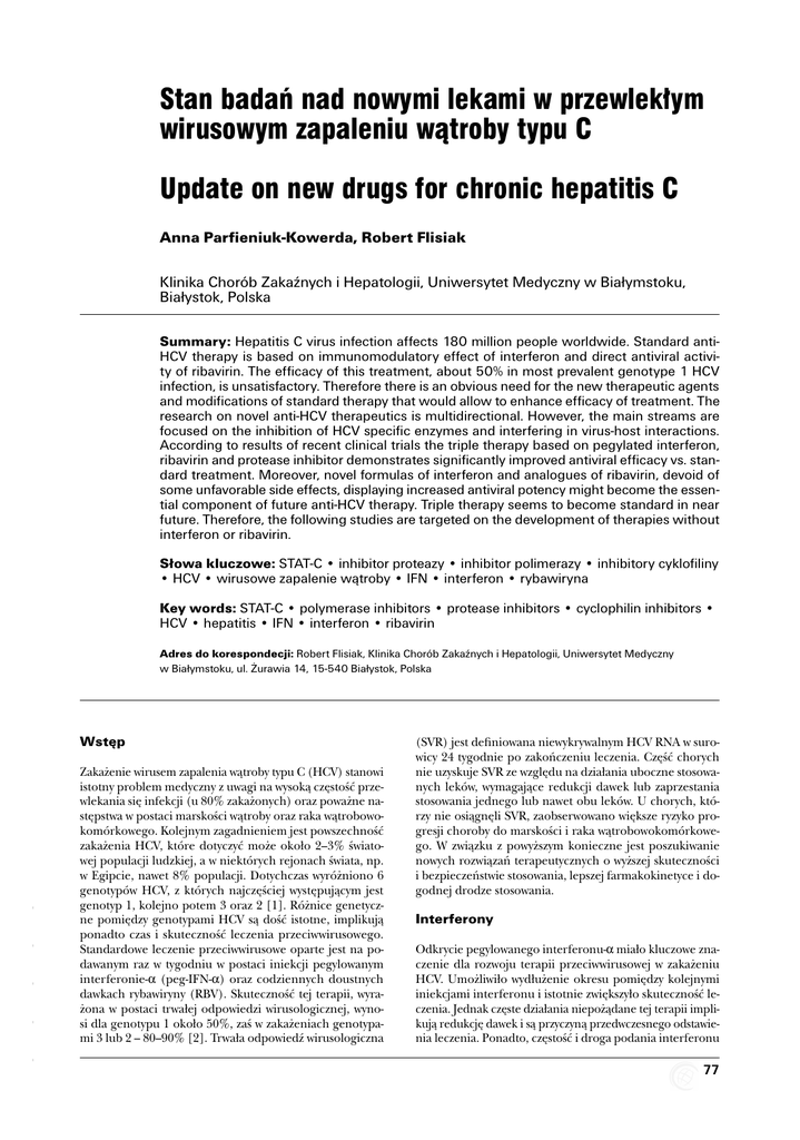 Stan badań nad nowymi lekami w przewlekłym wirusowym zapaleniu wątroby typu C Update on new drugs for chronic hepatitis C Anna Parfieniuk-Kowerda, Robert Flisiak Klinika Chorób Zakaźnych i Hepatologii, Uniwersytet Medyczny w Białymstoku, Białystok, Polska Summary: Hepatitis C virus infection affects 180 million people worldwide. Standard antiHCV therapy is based on immunomodulatory effect of interferon and direct antiviral activity of ribavirin. The efficacy of this treatment, about 50% in most prevalent genotype 1 HCV infection, is unsatisfactory. Therefore there is an obvious need for the new therapeutic agents and modifications of standard therapy that would allow to enhance efficacy of treatment. The research on novel anti-HCV therapeutics is multidirectional. However, the main streams are focused on the inhibition of HCV specific enzymes and interfering in virus-host interactions. According to results of recent clinical trials the triple therapy based on pegylated interferon, ribavirin and protease inhibitor demonstrates significantly improved antiviral efficacy vs. standard treatment. Moreover, novel formulas of interferon and analogues of ribavirin, devoid of some unfavorable side effects, displaying increased antiviral potency might become the essential component of future anti-HCV therapy. Triple therapy seems to become standard in near future. Therefore, the following studies are targeted on the development of therapies without interferon or ribavirin. Słowa kluczowe: STAT-C • inhibitor proteazy • inhibitor polimerazy • inhibitory cyklofiliny • HCV • wirusowe zapalenie wątroby • IFN • interferon • rybawiryna Key words: STAT-C • polymerase inhibitors • protease inhibitors • cyclophilin inhibitors • HCV • hepatitis • IFN • interferon • ribavirin Adres do korespondecji: Robert Flisiak, Klinika Chorób Zakaźnych i Hepatologii, Uniwersytet Medyczny w Białymstoku, ul. Żurawia 14, 15-540 Białystok, Polska Zakażenie wirusem zapalenia wątroby typu C (HCV) stanowi istotny problem medyczny z uwagi na wysoką częstość przewlekania się infekcji (u 80% zakażonych) oraz poważne następstwa w postaci marskości wątroby oraz raka wątrobowokomórkowego. Kolejnym zagadnieniem jest powszechność zakażenia HCV, które dotyczyć może około 2–3% światowej populacji ludzkiej, a w niektórych rejonach świata, np. w Egipcie, nawet 8% populacji. Dotychczas wyróżniono 6 genotypów HCV, z których najczęściej występującym jest genotyp 1, kolejno potem 3 oraz 2 [1]. Różnice genetyczne pomiędzy genotypami HCV są dość istotne, implikują ponadto czas i skuteczność leczenia przeciwwirusowego. Standardowe leczenie przeciwwirusowe oparte jest na podawanym raz w tygodniu w postaci iniekcji pegylowanym interferonie-a (peg-IFN-a) oraz codziennych doustnych dawkach rybawiryny (RBV). Skuteczność tej terapii, wyrażona w postaci trwałej odpowiedzi wirusologicznej, wynosi dla genotypu 1 około 50%, zaś w zakażeniach genotypami 3 lub 2 – 80–90% [2]. Trwała odpowiedź wirusologiczna (SVR) jest definiowana niewykrywalnym HCV RNA w surowicy 24 tygodnie po zakończeniu leczenia. Część chorych nie uzyskuje SVR ze względu na działania uboczne stosowanych leków, wymagające redukcji dawek lub zaprzestania stosowania jednego lub nawet obu leków. U chorych, którzy nie osiągnęli SVR, zaobserwowano większe ryzyko progresji choroby do marskości i raka wątrobowokomórkowego. W związku z powyższym konieczne jest poszukiwanie nowych rozwiązań terapeutycznych o wyższej skuteczności i bezpieczeństwie stosowania, lepszej farmakokinetyce i dogodnej drodze stosowania. Interferony Odkrycie pegylowanego interferonu-a miało kluczowe znaczenie dla rozwoju terapii przeciwwirusowej w zakażeniu HCV. Umożliwiło wydłużenie okresu pomiędzy kolejnymi iniekcjami interferonu i istotnie zwiększyło skuteczność leczenia. Jednak częste działania niepożądane tej terapii implikują redukcję dawek i są przyczyną przedwczesnego odstawienia leczenia. Ponadto, częstość i droga podania interferonu - - - - - Wstęp 77 (IFN) jest mało dogodna, zaś skuteczność leczenia niesatysfakcjonująca, zwłaszcza w odniesieniu do zakażeń genotypem 1. Z tego też powodu, kierunki badań skupiają się na innych typach IFN (IFN-b, IFN-g, IFN-l, IFN-w) oraz opracowaniu nowych form interferonu o lepszej farmakokinetyce, bądź dogodniejszym sposobie podania [3]. Albinterferon (alb-IFN, Joulferon®, Zalbin®) jest białkiem rekombinowanym, które powstało poprzez połączenie dwóch genów: ludzkiej albuminy (HSA: human serum albumin) oraz IFN-a-2b. Produkt tej fuzji genetycznej jest białkiem o masie cząsteczkowej 85,7-kDa, wykazującym wydłużony do około 141 godzin okres półtrwania charakterystyczny dla HSA oraz posiadającym przeciwwirusowe działanie IFN-a-2b [4]. Dwa badania kliniczne fazy III u nieleczonych dotychczas pacjentów zakażonych genotypami 1, 3 oraz 2, wykazały porównywalną do peg-IFN-a-2a skuteczność przeciwwirusową alb-IFN w dawkach 900 lub 1200 µg podawanych co 2 tygodnie w skojarzeniu z RBV. Odsetek SVR, oceniany 24 tygodnie po zakończeniu 48-tygodniowej terapii u 1323 chorych zakażonych genotypem 1 HCV (badanie ACHIEVE-1), osiągnął 48,2% i 47,3% w grupach leczonych wymienionymi powyżej dawkami alb-IFN oraz 51% w grupie leczonej pegIFN-a-2a [5]. W badaniu klinicznym III fazy ACHIEVE-2/3 u pacjentów zakażonych genotypami 3 lub 2 HCV, odsetek SVR wyniósł 79,8% i 80% w grupach leczonych alb-IFN oraz 84,8% u pacjentów leczonych peg-IFN-a-2a [6]. W obu badaniach ACHIEVE profil bezpieczeństwa i działań niepożądanych terapii z użyciem alb-IFN oceniono na porównywalny do peg-IFN-a-2a. W grupach leczonych alb-IFN wykazano jedynie większą częstość kaszlu i łysienia plackowatego. W trakcie badania zaprzestano podawania 1200 µg alb-IFN co 2 tygodnie z uwagi na działania niepożądane ze strony układu