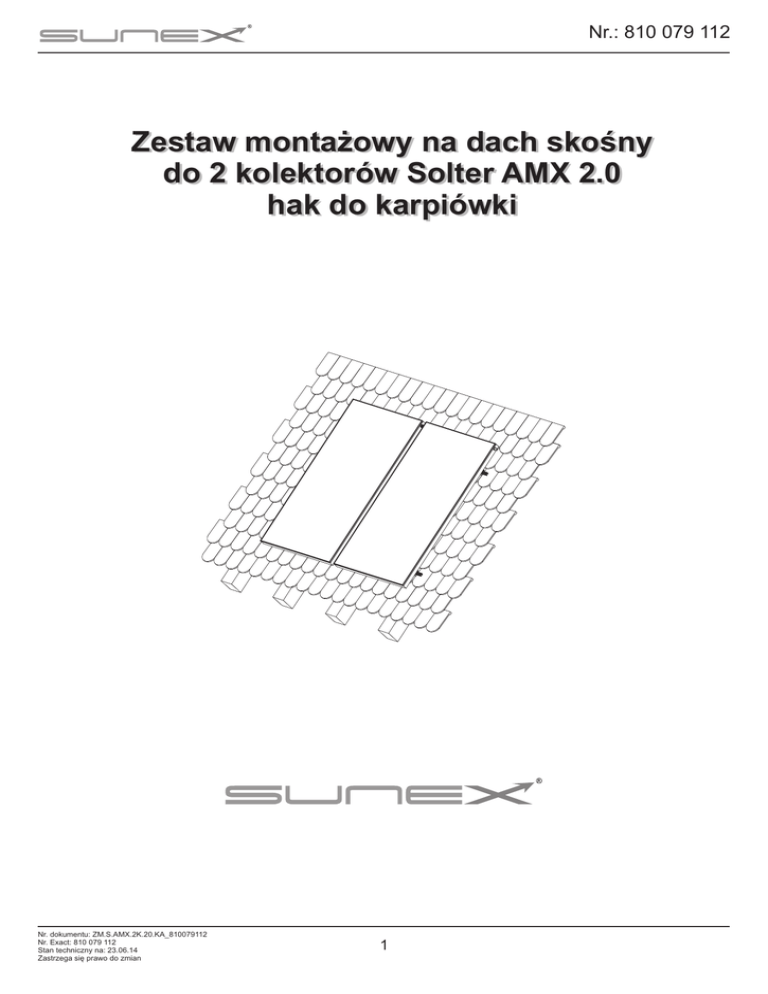 Nr.: 810 079 112 Zestaw montażowy na dach skośny do 2 kolektorów Solter AMX 2.0 hak do karpiówki Nr. dokumentu: ZM.S.AMX.2K.20.KA_810079112 Nr. Exact: 810 079 112 Stan techniczny na: 23.06.14 Zastrzega się prawo do zmian 1 50 Nr.: 810 079 112 240 8 2 60 15 00 ÷1 80 0 A Hak do karpiówki 1 2 ≈28 0 ≈17 00 226 0 ≈28 0 Wykaz elementów Poz. Opis Ilość 1 Hak (karpiówka) 4 szt. 2 Belka pozioma aluminiowa L=2260 mm 2 szt. 3 Wieszak kolektora dół 4 szt. 4 4 szt. 7 Wieszak kolektora góra Śruba młoteczkowa nierdzewna M8x20 + podkładka płaska + podkładka sprężysta + nakrętka Śruba zamkowa nierdzewna M10x30 + podkładka płaska + podkładka sprężysta + nakrętka Wkręt ocynkowany 6x80 16 szt. 8 Trzpień łączący* 2 szt. 5 6 * trzpień łączący ma zastosowanie przy wykorzystaniu zestawu Nr. dokumentu: ZM.S.AMX.2K.20.KA_810079112 Nr. Exact: 810 079 112 Stan techniczny na: 23.06.14 Zastrzega się prawo do zmian 2 jako rozszerzenie (patrz str. 6) 8 kpl. 4 kpl. Nr.: 810 079 112 1. Przygotowanie dachu do montażu zestawu. Usunąć dachówki w wyznaczonych miejscach. 15 00 ÷1 80 0 7 1 ≈17 00 Zamontować haki i uzupełnić dachówki. Nr. dokumentu: ZM.S.AMX.2K.20.KA_810079112 Nr. Exact: 810 079 112 Stan techniczny na: 23.06.14 Zastrzega się prawo do zmian 3 Nr.: 810 079 112 2. Montaż belek poziomych 2 do haków. 1 2 6 3 4. max 50 3. Montaż wieszaków kolektora Nakrętka M8 Podkładka sprężysta Podkładka płaska Wieszak kolektora góra A + 50 Śruba młoteczkowa nierdzewna M8x20 Zamocować wieszak górny używając śrub młoteczkowych M8x20 i lekko dokręcić. Śruba młoteczkowa nierdzewna M8x20 Wieszak kolektora dół Podkładka płaska Podkładka sprężysta Nakrętka M8 ! Uwaga: Podczas montażu wieszaków, kolektora nie można opierać na szybie! Zamocować wieszak dolny używając śrub młoteczkowych M8x20 i mocno dokręcić. Nr. dokumentu: ZM.S.AMX.2K.20.KA_810079112 Nr. Exact: 810 079 112 Stan techniczny na: 23.06.14 Zastrzega się prawo do zmian 4 Nr.: 810 079 112 4. Montaż kolektora na belkach poziomych 2 . 4 2 1 7 5 6 Poz. Opis 1 Hak (karpiówka) 2 Belka pozioma aluminiowa 3 Wieszak kolektora dół 4 Wieszak kolektora góra Śruba młoteczkowa nierdzewna M8x20 +podkładka płaska + podkładka sprężysta + nakrętka Śruba zamkowa nierdzewna M10x30 + podkładka płaska + podkładka sprężysta + nakrętka Wkręt ocynkowany 6x80 3 1 5 7 5 2 6 6 7 Nr. dokumentu: ZM.S.AMX.2K.20.KA_810079112 Nr. Exact: 810 079 112 Stan techniczny na: 23.06.14 Zastrzega się prawo do zmian 5 Nr.: 810 079 112 5. Montaż zestawu rozszerzającego. 2 2 8 Wsunąć trzpień łączący 8 w belki poziome 2 zestawów montażowych. 8 8 ≈56 0 Nr. dokumentu: ZM.S.AMX.2K.20.KA_810079112 Nr. Exact: 810 079 112 Stan techniczny na: 23.06.14 Zastrzega się prawo do zmian 6