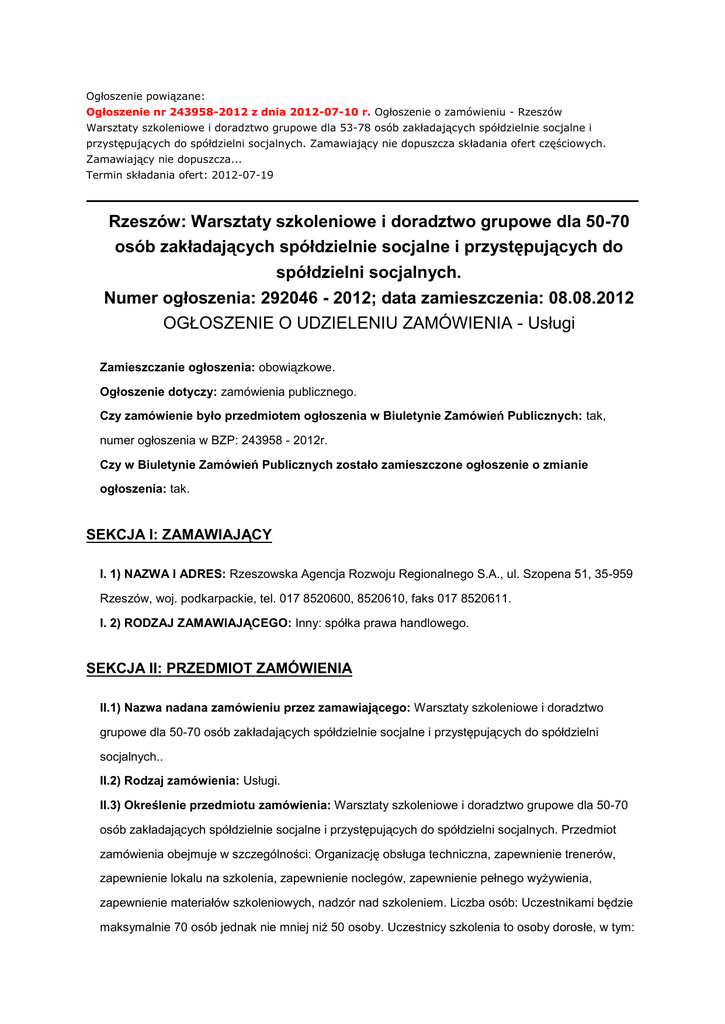 Ogłoszenie powiązane: Ogłoszenie nr 243958-2012 z dnia 2012-07-10 r. Ogłoszenie o zamówieniu - Rzeszów Warsztaty szkoleniowe i doradztwo grupowe dla 53-78 osób zakładających spółdzielnie socjalne i przystępujących do spółdzielni socjalnych. Zamawiający nie dopuszcza składania ofert częściowych. Zamawiający nie dopuszcza... Termin składania ofert: 2012-07-19 Rzeszów: Warsztaty szkoleniowe i doradztwo grupowe dla 50-70 osób zakładających spółdzielnie socjalne i przystępujących do spółdzielni socjalnych. Numer ogłoszenia: 292046 - 2012; data zamieszczenia: 08.08.2012 OGŁOSZENIE O UDZIELENIU ZAMÓWIENIA - Usługi Zamieszczanie ogłoszenia: obowiązkowe. Ogłoszenie dotyczy: zamówienia publicznego. Czy zamówienie było przedmiotem ogłoszenia w Biuletynie Zamówień Publicznych: tak, numer ogłoszenia w BZP: 243958 - 2012r. Czy w Biuletynie Zamówień Publicznych zostało zamieszczone ogłoszenie o zmianie ogłoszenia: tak. SEKCJA I: ZAMAWIAJĄCY I. 1) NAZWA I ADRES: Rzeszowska Agencja Rozwoju Regionalnego S.A., ul. Szopena 51, 35-959 Rzeszów, woj. podkarpackie, tel. 017 8520600, 8520610, faks 017 8520611. I. 2) RODZAJ ZAMAWIAJĄCEGO: Inny: spółka prawa handlowego. SEKCJA II: PRZEDMIOT ZAMÓWIENIA II.1) Nazwa nadana zamówieniu przez zamawiającego: Warsztaty szkoleniowe i doradztwo grupowe dla 50-70 osób zakładających spółdzielnie socjalne i przystępujących do spółdzielni socjalnych.. II.2) Rodzaj zamówienia: Usługi. II.3) Określenie przedmiotu zamówienia: Warsztaty szkoleniowe i doradztwo grupowe dla 50-70 osób zakładających spółdzielnie socjalne i przystępujących do spółdzielni socjalnych. Przedmiot zamówienia obejmuje w szczególności: Organizację obsługa techniczna, zapewnienie trenerów, zapewnienie lokalu na szkolenia, zapewnienie noclegów, zapewnienie pełnego wyżywienia, zapewnienie materiałów szkoleniowych, nadzór nad szkoleniem. Liczba osób: Uczestnikami będzie maksymalnie 70 osób jednak nie mniej niż 50 osoby. Uczestnicy szkolenia to osoby dorosłe, w tym: osoby długotrwale bezrobotne, osoby niepełnosprawne w tym również osoby o dużym poziomie niesprawności ruchowej, osoby uzależnione, osoby bezdomne. Szacunkowa liczba osób na wózku około 7. Ostateczna liczba osób zostanie podana przez Zamawiającego w dniu zawarcia umowy. Informacja zostanie przekazana drogą elektroniczną. Wynagrodzenie będzie odpowiednie do liczby osób podanych przez Zamawiającego w dniu zawarcia umowy. Liczba dni i godzin warsztatów szkoleniowych: 6 dni kolejnych, w tym 48 godzin szkolenia, nie więcej niż 8 godzin szkolenia na 1 dzień. 1 godzina szkolenia to 45 minut zegarowych. Liczba dni i godzin doradztwa: 50 godzin doradztwa, nie więcej niż 8 godzin na 1 dzień. 1 godzina szkolenia to 45 minut zegarowych. Przedmiotem zamówienia jest zorganizowanie i przeprowadzenie warsztatów szkoleniowych i doradztwa z zakresu zakładania i prowadzenia spółdzielni socjalnych. 1) Warsztaty szkoleniowe mają być złożone z 4 bloków tematycznych: a. Warsztaty integracyjno-motywacyjne, które pozwolą na wzmocnienie umiejętności z zakresu wyznaczania celów, pracy w zespole, motywowania siebie i innych itp. (12 h/grupę). b. Ekonomia Społeczna sposobem na zatrudnienie - obejmujące zagadnienia związane z Ekonomią Społeczną i zasady tworzenia i działalności spółdzielni socjalnych (12 h/grupę). c. Dobre praktyki - praktyczne aspekty funkcjonowania spółdzielni socjalnych oraz występujące bariery i zagrożenia (8 h/grupę). d. Mój pomysł - praktyczne tworzenie Planów Wydatkowania Środków Finansowych, będącego podstawa do otrzymania wsparcia finansowego w ramach projektu; zarządzanie finansami; podstawy zarządzania i marketingu (16 h/grupę). 2) Doradztwo grupowe ma składać się z następującej tematyki: a. opracowanie statutu i KRS - 15 godzin / 1 grupę, b. sporządzenie planu wydatkowania środków - 20 godzin / 1 grupę, c. kwestie podatkowe i prawne działania spółdzielni socjalnych - 10 godzin / 1 grupę. d. kwestie księgowe w tym opracowanie planu kont- 5 godzin/1 grupa e. powinno zakończyć się przygotowaniem poprawnego wniosku o przyznanie środków finansowych na założenie/przystąpienie do spółdzielni socjalnej wraz z kompletem załączników, przez każdą z grup inicjatywnych i osoby przystępujące do istniejących ss Zajęcia muszą odbywać się w grupach. W jednej grupie nie mniej niż 8 osób i nie więcej niż 16 osób. 2) Termin realizacji przedmiotu zamówienia: Przedmiot zamówienia musi być w całości wykonany nie wcześniej niż 30 lipca 2012 r., a nie później niż 7 września 2012 r. W tym jak następuje: Warsztaty szkoleniowe muszą odbyć się nie wcześniej niż 30 lipca 2012 r., a nie później niż 25 sierpnia 2012 r. Doradztwo grupowe musi odbyć się nie wcześniej niż 13 sierpnia 2012 r., a nie później niż 7 września 2012 r. Wykonawca musi przeprowadzić warsztaty szkoleniowe przed doradztwem grupowym. 3) Harmonogram a) Wykonawca zobowiązany jest do przygotowania szczegółowych harmonogramów szkoleń/doradztwa, z rozpisaniem na daty i godziny prowadzenia zajęć oraz dostarczenia ich zamawiającemu na co najmniej 3 dni przed rozpoczęciem szkolenia w celu akceptacji przez Zamawiającego. Zamawiający zastrzega sobie możliwość korekty przedstawionych dokumentów. b) Harmonogram zajęć powinien zawierać informacje dotyczące godzin, daty i miejsca realizacji poszczególnych szkoleń/doradztwa (w tym szczegółowy adres przeprowadzania szkoleń/doradztwa wraz z podaniem numerów sal). Zajęcia powinny odbywać się w godzinach od 8:00 do 20.00; nie więcej niż 8 godzin lekcyjnych dziennie (1 godzina lekcyjna = 45 minut). c) Harmonogram zajęć w trakcie trwania poszczególnych szkoleń/doradztwa nie powinien ulegać znaczącym zmianom. Wszystkie ewentualne zmiany w harmonogramie muszą zostać zgłoszone do Zamawiającego z wyprzedzeniem i mogą zo