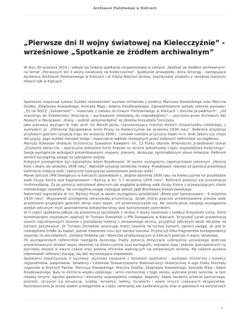 Archiwum Państwowe w Kielcach „Pierwsze dni II wojny światowej na Kielecczyźnie” wrześniowe „Spotkanie ze źródłem archiwalnym” W dniu 30 września 2015 r. odbyło się kolejne spotkanie zorganizowane w ramach „Spotkań ze źródłem archiwalnym" na temat „Pierwszych dni II wojny światowej na Kielecczyźnie". Spotkanie prowadziły: Anna Smorąg – zastępująca dyrektora Archiwum Państwowego w Kielcach i dr Edyta Majcher-Ociesa, koordynator projektu z ramienia Instytutu Historii UJK w Kielcach. Spotkanie rozpoczął Łukasz Guldon omówieniem wystaw militariów z kolekcji Mariusza Kowalskiego oraz Marcina Dzióba, Zbigniewa Kowalskiego, Konrada Maja i Adama Rzadkowskiego. Zaprezentowane zostały również wystawy: „35 lat NSZZ „Solidarność" – materiały z zasobu Archiwum Państwowego w Kielcach i zbiorów prywatnych"; „Od skautingu do Solidarności Walczącej – wychowanie młodzieży do niepodległości" – użyczona przez Archiwum Akt Nowych w Warszawie; „Kresy – podróż sentymentalna" ze zbiorów Krzysztofa Tomczyka. Jako pierwszy wystąpił dr hab. prof. UŁ Witold Jarno, reprezentujący Instytut Historii Uniwersytetu Łódzkiego, z wykładem pt. „Północne Zgrupowanie Armii Prusy na Kielecczyźnie we wrześniu 1939 roku". Referent przybliżył przybyłym gościom sytuację kraju we wrześniu 1939 r. i omówił niektóre przyczyny klęski m.in. brak taboru czy chaos decyzyjny. Jego wykład stanowił wstęp i rozpoczęcie wątków rozwijanych przez kolejnych referentów szczegółowo. Mariusz Kowalski (Kielecki Ochotniczy Szwadron Kawalerii im. 13 Pułku Ułanów Wileńskich) przedstawił temat „Działania taktyczno – operacyjne jednostek Armii Kraków na terenie południowej części województwa kieleckiego". Swoje wystąpienie wzbogacił prezentowanymi mapami, planami, obrazując zgromadzonym słowo mówione. Referent zwrócił szczególną uwagę na uzbrojenie wojska. Kolejnym prelegentem był regionalista Adam Rzadkowski. W swoim wystąpieniu zaprezentował zebranym „Obronę Kielc i okolic we wrześniu 1939 roku". Nakreślił sytuację obrońców miasta. Przedstawił, również za pomocą prezentacji konkretne miejsca walk i taktyczne rozwiązania zastosowane podczas walki. Marek Jończyk (IPN Delegatura w Kielcach) opowiedział o „Wojnie obronnej 1939 roku na Kielecczyźnie na przykładzie walk Grupy Kielce pod Kajetanowem i Barczą w dn. 5-7 września 1939 roku". Referent posłużył się prezentacją multimedialną. Za jej pomocą zobrazował obecnym jak wyglądał przebieg walk Grupy Kielce z przeważającymi siłami niemieckiego najeźdźcy. Na szczególną uwagę zasługuje postać ppłk Bronisława Kowalczewskiego. Natomiast regionalista dr inż. Bartosz Kozak w swoim wystąpieniu przedstawił „Bitwę pod Samsonowem – 6 września 1939 roku". Wypowiedź prelegenta obrazowała prezentacja, dzięki której poprzez przedstawienie planów walk przybliżono przybyłym gościom obraz starć wojsk, ich przemieszczanie się. Na zakończenie swojego wystąpienia poddał zebranym myśl upamiętnienia bohaterów bitwy pod Samsonowem pomnikiem. W II części spotkania odbyła się prezentacja pocztówek z okresu II wojny światowej z kolekcji Krzysztofa Lorka, którą komentarzem naukowym opatrzył dr Tomasz Domański z IPN Delegatura w Kielcach. Krzysztof Lorek prezentacją swoich najciekawszych zbiorów z posiadanej kolekcji z omawianego okresu, przybliżył zebranym świat obrazów na kartach pocztowych. Dr Tomasz Domański analizując treści zawarte na tychże kartach, zwrócił uwagę, że jest to niewątpliwie źródło do badań, jednak kwerenda musi być bardzo szeroka. Przytoczył kilka fragmentów korespondencji zawartej na pocztówkach, zarówno Polaków jak i Niemców przebywających w Kielcach podczas II wojny światowej. Po wystąpieniach referentów nastąpiła dyskusja. Padły pytania dotyczące uzbrojenia używanego podczas prezentowanych działań wojny obronnej na Kielecczyźnie oraz kartografii, rodzajów map i planów sporządzanych na potrzeby wojska w owym czasie oraz postaw oficerów walczących na omawianym terenie. Na zadane pytania odpowiadali referenci starając się dać wyczerpujące odpowiedzi. Spotkaniu towarzyszyły 4 wystawy: wystawa związana z tematem spotkania - wystawa militariów z kolekcji regionalistów, pasjonatów, działaczy i członków Stowarzyszenia Rekonstrukcji Historycznej 4–ego Pułku Piechoty Legionów w Kielcach Panów: Mariusza Kowalskiego, Marcina Dzióba, Zbigniewa Kowalskiego, Konrada Maja i Adam Rzadkowskiego. Były to militaria wojska polskiego i armii niemieckiej z tego okresu wybrane przez autorów, w tym między innymi: ogniwo gąsienicy i elementy wyposażenia czołgów, bagnety, kopia karabinu przeciw pancernego, pistolet, skrzynki na amunicję, szabla, lornetka, hełmy, furażerki i wiele innych ciekawych eksponatów. Rozmieszczono je przed stołem prelegentów w części centralnej sali konferencyjnej oraz w gablotach na korytarzach 1 Archiwum Państwowe w Kielcach w holu głównym archiwum. Kolejna wystawa towarzyszyła gościom również na sali konferencyjnej podczas wystąpień prelegentów. Rozmieszczona na jej ścianach dawała możliwość zaznajomienia się z tematyką Kresów na kartach pocztowych. Nosiła tytuł „Kresy – podróż sentymentalna", a jej autorem był Krzysztof Tomczyk – nauczyciel i regionalista. Na sali wystawowej natomiast, dostępne były 2 wystawy: „35 lat NSZZ „Solidarność". Materiały z zasobu AP w Kielcach i zbiorów prywatnych oraz „Od skautingu do Solidarności Walczącej – wychowanie młodzieży do niepodległości" – użyczona przez Archiwum Akt Nowych w Warszawie. Czynny był także punkt konsultacyjny pod nazwą „Archiwa Rodzinne", a przy stoisku wydawniczym w holu głównym archiwum można było zapoznać się i zakupić wybrane publikacje Kieleckiego Towarzystwa Naukowego, Wydawnictwa Biblioteki Publicznej w