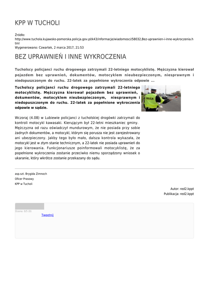 KPP W TUCHOLI Źródło: http://www.tuchola.kujawsko-pomorska.policja.gov.pl/k43/informacje/wiadomosci/58032,Bez-uprawnien-i-inne-wykroczenia.h tml Wygenerowano: Czwartek, 2 marca 2017, 21:53 BEZ UPRAWNIEŃ I INNE WYKROCZENIA Tucholscy policjanci ruchu drogowego zatrzymali 22-letniego motocyklistę. Mężczyzna kierował pojazdem bez uprawnień, dokumentów, motocyklem nieubezpieczonym, niesprawnym i niedopuszczonym do ruchu. 22-latek za popełnione wykroczenia odpowie ... Tucholscy policjanci ruchu drogowego zatrzymali 22-letniego motocyklistę. Mężczyzna kierował pojazdem bez uprawnień, dokumentów, motocyklem nieubezpieczonym, niesprawnym i niedopuszczonym do ruchu. 22-latek za popełnione wykroczenia odpowie w sądzie. Wczoraj (4.08) w Lubiewie policjanci z tucholskiej drogówki zatrzymali do kontroli motocykl kawasaki. Kierującym był 22-letni mieszkaniec gminy. Mężczyzna od razu oświadczył mundurowym, że nie posiada przy sobie żadnych dokumentów, a motocykl, którym się porusza nie jest zarejestrowany ani ubezpieczony. Jakby tego było mało, dalsza kontrola wykazała, że motocykl jest w złym stanie technicznym, a 22-latek nie posiada uprawnień do jego kierowania. Funkcjonariusze poinformowali motocyklistę, że za popełnione wykroczenia zostanie przeciwko niemu sporządzony wniosek o ukaranie, który wkrótce zostanie przekazany do sądu. asp.szt. Brygida Zimnoch Oficer Prasowy KPP w Tucholi Autor: red2.kppt Publikacja: red2.kppt Ocena: 0/5 (0) Tweetnij