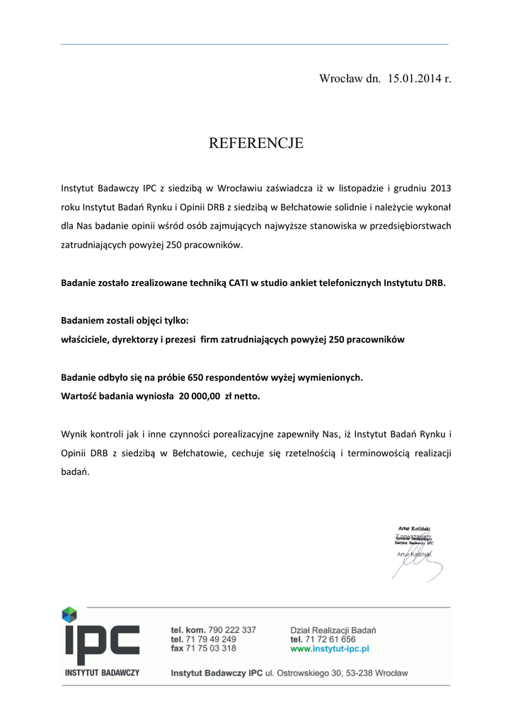 Wrocław dn. 15.01.2014 r. REFERENCJE Instytut Badawczy IPC z siedzibą w Wrocławiu zaświadcza iż w listopadzie i grudniu 2013 roku Instytut Badań Rynku i Opinii DRB z siedzibą w Bełchatowie solidnie i należycie wykonał dla Nas badanie opinii wśród osób zajmujących najwyższe stanowiska w przedsiębiorstwach zatrudniających powyżej 250 pracowników. Badanie zostało zrealizowane techniką CATI w studio ankiet telefonicznych Instytutu DRB. Badaniem zostali objęci tylko: właściciele, dyrektorzy i prezesi firm zatrudniających powyżej 250 pracowników Badanie odbyło się na próbie 650 respondentów wyżej wymienionych. Wartość badania wyniosła 20 000,00 zł netto. Wynik kontroli jak i inne czynności porealizacyjne zapewniły Nas, iż Instytut Badań Rynku i Opinii DRB z siedzibą w Bełchatowie, cechuje się rzetelnością i terminowością realizacji badań.