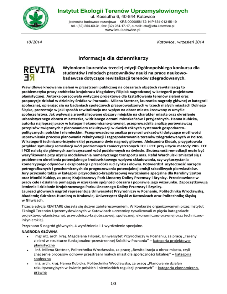 Instytut Ekologii Terenów Uprzemysłowionych ul. Kossutha 6, 40-844 Katowice jednostka badawczo-rozwojowa KRS 0000058172; NIP 634-012-55-19 tel.: (32) 254-60-31, fax: (32) 254-17-17, e-mail: [email protected] www.ietu.katowice.pl 10/2014 Katowice, wrzesień 2014 Informacja dla dziennikarzy Wyłoniono laureatów trzeciej edycji Ogólnopolskiego konkursu dla studentów i młodych pracowników nauki na prace naukowobadawcze dotyczące rewitalizacji terenów zdegradowanych. Prawidłowe kreowanie zieleni w przestrzeni publicznej na obszarach objętych rewitalizacją to problematyka pracy architekta krajobrazu Magdaleny Filipiak nagrodzonej w kategorii projektowoplanistycznej. Autorka opracowała wytyczne projektowe dla kształtowania terenów zieleni oraz propozycje działań w dzielnicy Śródka w Poznaniu. Milena Stettner, laureatka nagrody głównej w kategorii społecznej, opierając się na badaniach społecznych przeprowadzonych w trzech małych miastach Dolnego Śląska, prezentuje w jaki sposób rewitalizacja ma wpływ na obraz miasta kreowany w umyśle społeczeństwa. Jak wpływają zrewitalizowane obszary miejskie na charakter miasta oraz określenie urbanistycznego obrazu miasteczka, widzianego oczami mieszkańców i przyjezdnych. Hanna Kubicka, autorka najlepszej pracy w kategorii ekonomiczno-prawnej, przeprowadziła analizę porównawczą przepisów związanych z planowaniem rekultywacji w dwóch różnych systemach gospodarczopolitycznych: polskim i niemieckim. Przeprowadzona analiza przynosi wskazówki dotyczące możliwości usprawnienia procesu planowania rekultywacji i zagospodarowania terenów zdegradowanych w Polsce. W kategorii techniczno-inżynierskiej przyznano dwie nagrody główne. Aleksandra Kiecak, przygotowała przykład symulacji remediacji wód podziemnych zanieczyszczonych TCE i PCE przy użyciu metody PRB. TCE i PCE należą do głównych zanieczyszczeń wód podziemnych na świecie. Skuteczność remediacji może być weryfikowana przy użyciu modelowania numerycznego transportu mas. Rafał Warchulski zmierzył się z problemem określenia potencjalnego środowiskowego wpływu składowania, czy wykorzystania komercyjnego odpadów z eksploatacji i przeróbki rud cynku i ołowiu. Potwierdził użyteczność narzędzi petrograficznych i geochemicznych do prognozowania potencjalnej emisji szkodliwych pierwiastków. Jury przyznało także w kategorii przyrodniczo-krajobrazowej wyróżnienie specjalne dla Karoliny Szaton oraz Moniki Kubicy, za pracę Krajobrazowy Park Linearny Doliny Przemszy i Brynicy. Przedstawione w pracy cele i działania pomagają w uzyskaniu spójności obszaru i poprawie jego wizerunku. Zapoczątkowują istnienie i działanie Krajobrazowego Parku Linearnego Doliny Przemszy i Brynicy. Laureaci głównych nagród reprezentują Uniwersytet Przyrodniczy w Poznaniu, Politechnikę Wrocławską, Akademię Górniczo-Hutniczą w Krakowie, Uniwersytet Śląski w Katowicach oraz Politechnikę Śląską w Gliwicach. Trzecia edycja REVITARE cieszyła się dużym zainteresowaniem. W Konkursie organizowanym przez Instytut Ekologii Terenów Uprzemysłowionych w Katowicach uczestnicy rywalizowali w pięciu kategoriach: projektowo-planistycznej, przyrodniczo-krajobrazowej, społecznej, ekonomiczno-prawnej oraz technicznoinżynierskiej. Przyznano 5 nagród głównych, 4 wyróżnienia i 1 wyróżnienie specjalne. NAGRODA GŁÓWNA mgr inż. arch. kraj. Magdalena Filipiak, Uniwersytet Przyrodniczy w Poznaniu, za pracę „Tereny zieleni w strukturze funkcjonalno-przestrzennej Śródki w Poznaniu” – kategoria projektowoplanistyczna inż. Milena Stettner, Politechnika Wrocławska, za pracę „Rewitalizacja a obraz miasta, czyli znaczenie procesów odnowy przestrzeni małych miast dla społeczności lokalnej” – kategoria społeczna inż. arch. kraj. Hanna Kubicka, Politechnika Wrocławska, za pracę „Planowanie działań rekultywacyjnych w świetle polskich i niemieckich regulacji prawnych” – kategoria ekonomicznoprawna 1/3 mgr inż. Aleksandra Kiecak, Akademia Górniczo-Hutnicza w Krakowie, za pracę Model numeryczny remediacji wód podziemnych zanieczyszczonych TCE i PCE przy użyciu PRB” – kategoria technicznoinżynierska mgr Rafał Warchulski, Uniwersytet Śląski w Katowicach, Sosnowiec, za pracę „Prognozowanie emisji pierwiastków potencjalnie toksycznych ze składowanego materiału hutniczego Zn-Pb w świetle badań petrograficznych i geochemicznych” – kategoria techniczno-inżynierska WYRÓŻNIENIE inż. arch. Agata Wierzchoń, Politechnika Śląska w Gliwicach, za pracę „Chaos – ukryte piękno. Rewitalizacja obszaru Gliwickiej dzielnicy Sośnica przy potoku Guido” – kategoria projektowoplanistyczna mgr inż. arch. Paweł Rajca, Politechnika Śląska w Gliwicach, za pracę „Termy – Kielce: rewitalizacja kamieniołomu Ślichowice” – kategoria projektowo-planistyczna inż. Ryszard Nejman, Szkoła Główna Gospodarstwa Wiejskiego w Warszawie, za pracę „Wytyczne do programu rewitalizacji tarnowskiej dzielnicy Mościce” – kategoria społeczna mgr Wojciech Ozdoba, Uniwersytet Ekonomiczny w Krakowie, za pracę „Rewitalizacja północnej części Pustyni Błędowskiej” – kategoria ekonomiczno-prawna Jury przyznało także jedna nagrodę dodatkową. WYRÓŻNIENIE SPECJALNE inż. arch. Karolina Szaton, inż. arch. Monika Kubica, Politechnika Śląska w Gliwicach, za pracę „Krajobrazowy Park Linearny Doliny Przemszy i Brynicy” – kategoria przyrodniczo-krajobrazowa W REVITARE uczestniczyli studenci, absolwenci uczelni wyższych z lat 2010-2013 oraz doktoranci m.in. Akademii Górniczo-Hutniczej w Krakowie, Politechniki Białostockiej, Politechniki Gdańskiej, Politechniki Krakowskiej, Politechniki Łódzkiej, Politechniki Śląskiej, Politechniki Warszawskiej, Politechniki Wrocławskiej, Uniwersytetu Ekonomicznego w Krakowie, Uniwersytetu Ekonomicznego we Wrocławiu, Uniwersytetu Rolniczego w Krakowie, Uniwe