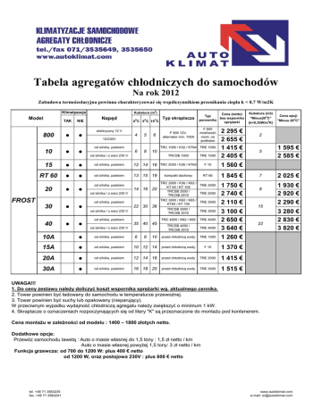 Tabela agregatów chłodniczych do samochodów Na rok 2012 Zabudowa termoizolacyjna powinna charakteryzować się współczynnikiem przenikania ciepła k < 0,7 W/m2K Kubatura (m3) Klimatyzacja Model TAK NIE Napęd 0OC 5OC 15OC elektryczny 12 V 800 ● ● 10 ● ● 15 ● ● od silnika, paskiem RT 60 ● ● od silnika, paskiem 20 ● ● 30 ● ● 4 5 6 6 8 10 12/230V od silnika, paskiem od silnika / z sieci 230 V ● ● F 800 12V, alternator min. 100A F 800 moŜliwość mont. na podłodze 2 295 € 2 655 € 1 415 € 2 405 € TRCSB 1000 TRE 1000 12 14 16 TRC 2000 / K36 / KT64 F 15 1 560 € 13 15 19 kompakt dachowy RT 60 1 845 € 14 16 20 od silnika / z sieci 230 V od silnika, paskiem 40 Cena (netto) Typ bez wspornika parownika spręŜarki TRC 1000 / K32 / KT64 TRE 1000 od silnika, paskiem FROST Typ skraplacza 22 30 36 TRC 2000 / K36 / K62 / TRE 2000 KT 64 / KT 105 TRCSB 2000 / TRE 2000 TRCSB 2010 TRC 3000 / K62 / K65 / TRE 3000 KT64 / KT 105 1 750 € 2 740 € 2 110 € od silnika / z sieci 230 V TRCSB 3000 / TRCSB 3010 TRE 3000 od silnika, paskiem TRC 4000 / K62 / K65 TRE 4000 TRCSB 4000 / TRCSB 3010 TRE 4000 3 100 € 2 650 € 3 640 € 10 przed chłodnicą wody TRE 1000 1 260 € 35 40 45 od silnika / z sieci 230 V 10A ● od silnika, paskiem 15A ● od silnika, paskiem 10 12 14 przed chłodnicą wody F 15 1 370 € 20A ● od silnika, paskiem 12 14 16 przed chłodnicą wody TRE 2000 1 415 € 30A ● od silnika, paskiem 16 18 20 przed chłodnicą wody TRE 3000 1 515 € 6 8 Kubatura (m3) o "Minus20 C" 2 (k<0,35W/m K) Cena opcji "Minus 20oC" 2 5 1 595 € 2 585 € 7 2 025 € 8 15 22 1 930 € 2 920 € 2 290 € 3 280 € 2 830 € 3 820 € UWAGA!!! 1. Do ceny zestawu naleŜy doliczyć koszt wspornika spręŜarki wg. aktualnego cennika. 2. Towar powinien być ładowany do samochodu w temperaturze przewoźnej. 3. Towar powinien być suchy lub opakowany (nieparujący). W przeciwnym wypadku wydajność chłodniczą agregatu naleŜy zwiększyć o minimum 1 kW. 4. Skraplacze o oznaczeniach rozpoczynających się od litery "K" są przeznaczone do montaŜu pod kontenerem. Cena montaŜu w zaleŜności od modelu : 1400 – 1800 złotych netto. Dodatkowe opcje: Przewóz samochodu lawetą : Auto o masie własnej do 1,5 tony : 1,5 zł netto / km Auto o masie własnej powyŜej 1,5 tony: 3 zł netto / km Funkcja grzewcza: od 700 do 1200 W: plus 400 € netto od 1200 W, oraz postojowa 230V : plus 600 € netto tel. +48 71 3583235 fax. +48 71 3583241 www.autoklimat.com e-mail: [email protected]