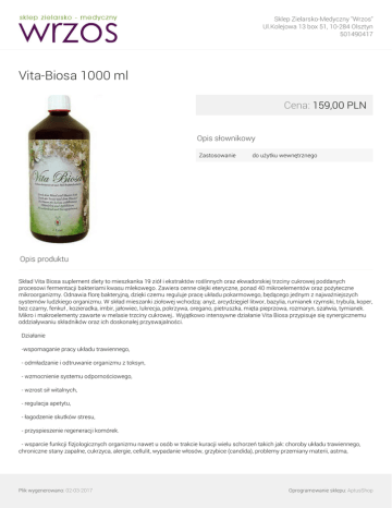 Sklep Zielarsko-Medyczny "Wrzos" Ul.Kolejowa 13 box 51, 10-284 Olsztyn 501490417 Vita-Biosa 1000 ml Cena: 159,00 PLN Opis słownikowy Zastosowanie do użytku wewnętrznego Opis produktu Skład Vita Biosa suplement diety to mieszkanka 19 ziół i ekstraktów roślinnych oraz ekwadorskiej trzciny cukrowej poddanych procesowi fermentacji bakteriami kwasu mlekowego. Zawiera cenne olejki eteryczne, ponad 40 mikroelementów oraz pożyteczne mikroorganizmy. Odnawia florę bakteryjną, dzięki czemu reguluje pracę układu pokarmowego, będącego jednym z najważniejszych systemów ludzkiego organizmu. W skład mieszanki ziołowej wchodzą: anyż, arcydzięgiel litwor, bazylia, rumianek rzymski, trybula, koper, bez czarny, fenkuł , kozieradka, imbir, jałowiec, lukrecja, pokrzywa, oregano, pietruszka, mięta pieprzowa, rozmaryn, szałwia, tymianek. Mikro i makroelementy zawarte w melasie trzciny cukrowej.. Wyjątkowo intensywne działanie Vita Biosa przypisuje się synergicznemu oddziaływaniu składników oraz ich doskonałej przyswajalności. Działanie -wspomaganie pracy układu trawiennego, - odmładzanie i odtruwanie organizmu z toksyn, - wzmocnienie systemu odpornościowego, - wzrost sił witalnych, - regulacja apetytu, - łagodzenie skutków stresu, - przyspieszenie regeneracji komórek. - wsparcie funkcji fizjologicznych organizmu nawet u osób w trakcie kuracji wielu schorzeń takich jak: choroby układu trawiennego, chroniczne stany zapalne, cukrzyca, alergie, cellulit, wypadanie włosów, grzybice (candida), problemy przemiany materii, astma, Plik wygenerowano: 02-03-2017 Oprogramowanie sklepu: AptusShop Sklep Zielarsko-Medyczny "Wrzos" Ul.Kolejowa 13 box 51, 10-284 Olsztyn 501490417 zapalenie jelit, reumatyzm, osteoporoza, nadciśnienie, bóle stawów, wrzody żołądka, Angina Pectoris, arytmia, zawały serca, trądzik, artretyzm, obrzęki ciała (nogi, twarz, "worki pod oczami") osłabienie i wyjałowienie organizmu, nadmiar gazów w układzie pokarmowym, zaburzenia wagi, nieprzyjemny zapach z ust i wiele innych. Wskazania do stosowania Vita Biosa - problemy z układem trawienny, - Za toksycznienie organizmu - Słaby system immunologiczny (skłonność do przeziębień) - Niewłaściwe odżywianie (dieta uboga w owoce i warzywa, nieregularne posiłki) - Chroniczne zmęczenie - Brak sił witalnych (ogólne osłabienie organizmu) - Wyjałowienie organizmu po kuracji antybiotykami i chemioterapią - Problemy przemiany materii - Siedzący tryb życia - Nadmierny stres - Przedwczesne starzenie się Preparat jest szczególnie polecany dla pracowników umysłowych, studentów i uczniów. Sposób użycia Przed użyciem lekko wstrząsnąć. Tworzenie się osadów, gazów oraz kwaśny smak są efektem naturalnego procesu fermentacji. Ilość przyjmowane produktu zależy od wieku, stanu zdrowia oraz okresu przyjmowania Vita BiosaR. Porcja dzienna wynosi od kilku łyżeczek dziennie, nawet do 100 ml. Zalecana porcja dzienna to 3 x10 ml. Vita BiosaR należy przyjmować rozcieńczone letnią (nie gorącą!) wodą lub sokiem w czasie posiłków lub pomiędzy nimi. Przed rozpoczęciem kuracji właściwej należy przyjmować zmniejszoną ilość produktu celem przygotowania organizmu. Faza wstępna (pierwsze 3-7 dni) - 3 razy dziennie po 2-5 ml rozcieńczone 100 ml letniej wody Faza właściwa - 3 razy dziennie po 10 ml rozcieńczone w wodzie Kuracja intensywna - niektóre osoby decydują się na zwiększenie kuracji do około 30 ml 3 razy dziennie rozcieńczone w około 200 ml letniej wody. Dzieci powinny przyjmować 5-10 ml dziennie podzielone na 3 dawki. Małe dzieci powinny przyjmować 5-10 ml dziennie podzielone na 3 dawki. Sposób przechowywania Vita Biosa® posiada ok. 12 miesięcy trwałości od daty produkcji. Przed otwarciem należy przechowywać butelkę w ciemnym i chłodnym miejscu. Po otwarciu należy ją przechowywać w lodówce i spożyć w ciągu 8 tygodni. Uwaga producenta U niektórych osób w momencie rozpoczęcia procesu przyjmowania Vita Biosa może wystąpić tzw. zjawisko homeopatyczne (nasilenie objawów schorzenia). Należy wówczas okresowo zredukować ilość przyjmowanego preparatu. Plik wygenerowano: 02-03-2017 Powered by TCPDF (www.tcpdf.org) Oprogramowanie sklepu: AptusShop