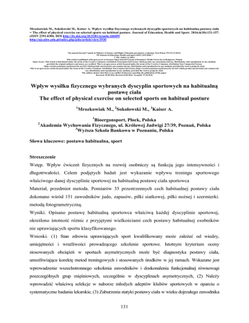 Mrozkowiak M., Sokołowski M., Kaiser A. Wpływ wysiłku fizycznego wybranych dyscyplin sportowych na habitualną postawę ciała = The effect of physical exercise on selected sports on habitual posture. Journal of Education, Health and Sport. 2016;6(10):131-157. eISSN 2391-8306. DOI http://dx.doi.org/10.5281/zenodo.160499 http://ojs.ukw.edu.pl/index.php/johs/article/view/3930 The journal has had 7 points in Ministry of Science and Higher Education parametric evaluation. Part B item 755 (23.12.2015). 755 Journal of Education, Health and Sport eISSN 2391-8306 7 © The Author (s) 2016; This article is published with open access at Licensee Open Journal Systems of Kazimierz Wielki University in Bydgoszcz, Poland Open Access. This article is distributed under the terms of the Creative Commons Attribution Noncommercial License which permits any noncommercial use, distribution, and reproduction in any medium, provided the original author(s) and source are credited. This is an open access article licensed under the terms of the Creative Commons Attribution Non Commercial License (http://creativecommons.org/licenses/by-nc/4.0/) which permits unrestricted, non commercial use, distribution and reproduction in any medium, provided the work is properly cited. This is an open access article licensed under the terms of the Creative Commons Attribution Non Commercial License (http://creativecommons.org/licenses/by-nc/4.0/) which permits unrestricted, non commercial use, distribution and reproduction in any medium, provided the work is properly cited. The authors declare that there is no conflict of interests regarding the publication of this paper. Received: 02.09.2016. Revised 24.09.2016. Accepted: 12.10.2016. Wpływ wysiłku fizycznego wybranych dyscyplin sportowych na habitualną postawę ciała The effect of physical exercise on selected sports on habitual posture 1 Mrozkowiak M., 2Sokołowski M., 3Kaiser A. 1 2 Bioergonsport, Płock, Polska Akademia Wychowania Fizycznego, ul. Królowej Jadwigi 27/39, Poznań, Polska 3 Wyższa Szkoła Bankowa w Poznaniu, Polska Słowa kluczowe: postawa habitualna, sport Streszczenie Wstęp. Wpływ ćwiczeń fizycznych na rozwój osobniczy są funkcją jego intensywności i długotrwałości. Celem podjętych badań jest wykazanie wpływu treningu sportowego właściwego danej dyscyplinie sportowej na habitualną postawę ciała sportowca Materiał, przedmiot metoda. Pomiarów 35 przestrzennych cech habitualnej postawy ciała dokonano wśród 151 zawodników judo, zapasów, piłki siatkowej, piłki nożnej i szermierki. metodą fotogrametryczną. Wyniki. Opisano postawę habitualną sportowca właściwą każdej dyscyplinie sportowej, określono istotność różnic z przyjętymi wielkościami cech postawy habitualnej osobników nie uprawiających sportu klasyfikowanego. Wnioski. (1) Stan zdrowia uprawiających sport kwalifikowany może zależeć od wiedzy, umiejętności i wrażliwości prowadzącego szkolenie sportowe. Istotnym kryterium oceny stosowanych obciążeń w sportach asymetrycznych może być diagnostyka postawy ciała, umożliwiająca korektę metod treningowych i stosowanych środków w jej ramach. Wskazane jest wprowadzenie wszechstronnego szkolenia zawodników i doskonalenia funkcjonalnej równowagi poszczególnych grup mięśniowych, szczególnie w dyscyplinach asymetrycznych, (2) Należy wprowadzić właściwą selekcje w naborze młodych adeptów klubów sportowych w oparciu o systematyczne badania lekarskie, (3) Zaburzenia statyki postawy ciała w wieku dojrzałego zawodnika 131 mogą być konsekwencją nie stosowania zasad treningu holistycznego i błędów w początkowym etapie szkolenia, błędów w rozgrzewce i braku ćwiczeń kształtujących nawyk postawy prawidłowej w jej ramach, (4) Zrealizowane badania nie dają pełnego obrazu zmian w postawie ciała po wpływem pracy charakterystycznej dla danej dyscypliny sportowej. Keywords: habitual posture, sport Summary Admission. The impact of physical exercise on the development of the individual are a function of its intensity and duration. The aim of the study is to demonstrate the influence of sports training appropriate for their sport habitual posture athlete The material object of the method. Measurements 35 spatial characteristics of habitual posture made of 151 players judo, wrestling, volleyball, football and fencing. photogrammetric method. Results. Described the attitude of habitual athlete right every sports discipline, defined the significance of differences of values accepted traits of habitual attitudes of individuals not engaged in sport classified. Conclusions. (1) The health status of athletes qualified may depend on the knowledge, skills and sensitivity leading sports training. An important criterion for evaluating the load in sports may be asymmetric diagnostics of body posture, enabling correction of training methods and means used within it. It is the introduction of comprehensive training of players and improve functional balance of individual muscle groups, especially in the disciplines of asymmetric (2) Enter the correct selections in recruiting young students of sports clubs based on regular medical examinations, (3) disorders static posture in adulthood player may be the consequence of not applying the principles of training holistic and errors in the initial training phase, errors in the warm-up and lack of exercise forming the habit of correct posture within it, (4) Realized studies do not give a complete picture of changes in body posture the influence of labor characteristic of the sport. 132 1. Wprowadzenie Przyjęto, że zwiększona aktywności fizyczna jest jednym z kluczowych zadań w promocji zdrowia. Wiele ośrodków zajmujących się tą problematyką oparło się na modelu Toronto (HRF – Heath Related Fitness), opracowanym przez C. Boucharda i R.J. Shepharda [1], który zakłada, że składowe wydolności fizycznej są podstawą zdrowia i mogą być dod