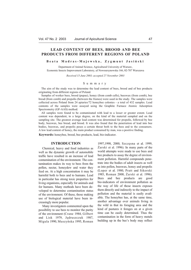 ʱ´ň ěé ұň î îđđí Ö±«®˛ż´ ±ş ß°·˝«´¬«®ż´ Í˝·»˛˝» ěé ÔŰßÜ ÝŃŇĚŰŇĚ ŃÚ ŢŰŰÍô ŢÎŃŃÜ ßŇÜ ŢŰŰ ĐÎŃÜËÝĚÍ ÚÎŃÓ Ü×ÚÚŰÎŰŇĚ ÎŰŮ×ŃŇÍ ŃÚ ĐŃÔßŇÜ Ţ»ż¬ż ÓżĽ®żóÓż¶»©µżô Ć§ął«˛¬ Öż·/µ· Ü»°ż®¬ł»˛¬ ±ş ߲·łż´ Í˝·»˛˝»ô ßą®·˝«´¬«®ż´ ˲·Ş»®·¬§ ±ş Éż®ż©ô Ű˝±˛±ł·˝ ײ»˝¬ ׳°®±Ş»ł»˛¬ Ôżľ±®ż¬±®§ô «´ ұ©±«®§˛±©µż ďęęô đîóéčé Éż®¦ż©ż λ˝»·Ş»Ľ ďë Ö«˛» îđđíĺ ż˝˝»°¬»Ľ îé Ň±Ş»łľ»® îđđí Í « ł ł ż ® § ̸» ż·ł ±ş ¬¸» ¬«Ľ§ ©ż ¬± Ľ»¬»®ł·˛» ¬¸» ´»żĽ ˝±˛¬»˛¬ ±ş ľ»»ô ľ®±±Ľ ż˛Ľ ±ş ľ»» °®±Ľ«˝¬ ±®·ą·˛ż¬·˛ą ş®±ł Ľ·şş»®»˛¬ ®»ą·±˛ ±ş б´ż˛Ľň Íżł°´» ±ş ©±®µ»® ľ»»ô ľ®±±Ľ ř°«°ż»÷ô ¸±˛»§ řş®±ł ˝±łľ ˝»´´÷ô ľ»»©ż¨ řş®±ł ˝±łľ÷ô ľ»» ľ®»żĽ řş®±ł ˝±łľ÷ ż˛Ľ °®±°±´· řľ»¬©»»˛ ¬¸» ş®żł»÷ ©»®» «»Ľ ·˛ ¬¸» ¬«Ľ§ň ̸» żł°´» ©»®» ˝±´´»˝¬»Ľ ż˝®± б´ż˛Ľ ş®±ł îě ż°·ż®·»ńéî ¸±˛»§ľ»» ˝±´±˛·» ó ż ¬±¬ż´ ±ş ěíî żł°´»ň Ô»żĽ ˝±˛¬»˛¬ ±ş ¬¸» żł°´» ©»®» żż§»Ľ «·˛ą ¬¸» Ů®ż°¸·¬» Ú«®˛ż˝» ߬±ł·˝ ߼±®°¬·±˛ Ͱ»˝¬®±ł»¬®§ řŮÚóßßÍ÷ ł»¬¸±Ľň ß´´ żł°´» ©»®» ş±«˛Ľ ¬± ľ» ˝±˛¬żł·˛ż¬»Ľ ©·¬¸ ´»żĽ ¬± ż ´»»® ±® ą®»ż¬»® »¨¬»˛¬ň Ô»żĽ ˝±˛¬»˛¬ ©ż Ľ»°»˛Ľ»˛¬ô ¬± ż ´ż®ą» Ľ»ą®»»ô ±˛ ¬¸» µ·˛Ľ ±ş ¬¸» łż¬»®·ż´ żł°´»Ľ ż˛Ľ ±˛ ¬¸» żł°´·˛ą ·¬»ň ̸» ą®»ż¬»¬ żŞ»®żą» ´»żĽ ˝±˛¬»˛¬ ©ż Ľ»¬»®ł·˛»Ľ ş±® °®±°±´·ô ş±´´±©»Ľ ľ§ ľ»» ľ±Ľ§ô ľ»»©ż¨ô ľ»» ľ®»żĽô ż˛Ľ ľ®±±Ľň ׬ ©ż ż´± ş±«˛Ľ ¬¸ż¬ ¬¸» °»˛»¬®ż¬·±˛ ±ş ´»żĽ ·˛¬± ľ»» ľ±Ľ·»ô ľ»»©ż¨ô ż˛Ľ °®±°±´· °±» ż ˝»®¬ż·˛ ¬¸®»ż¬ ľ±¬¸ ¬± ¬¸» ľ»» ż˛Ľ ¬± ¬¸» ˝±˛«ł»®ň ß ´±© ´»żĽ ˝±˛¬»˛¬ ±ş ¸±˛»§ô ¬¸» łż·˛ °®±Ľ«˝¬ ˝±˛«ł»Ľ ľ§ łż˛ô ©ż ż °±·¬·Ş» ş·˛Ľ·˛ąň Ő»§©±®Ľć ¸±˛»§ľ»»ô ľ®±±Ľô ľ»» °®±Ľ«˝¬ô ´»żĽô ľ·±ó·˛Ľ·˝ż¬±®ň ×ŇĚÎŃÜËÝĚ×ŃŇ Ý¸»ł·˝ż´ô ¸»żŞ§ ż˛Ľ ş±±Ľ ·˛Ľ«¬®·» ż ©»´´ ż ¬¸» Ľ§˛żł·˝ ą®±©¬¸ ±ş ż«¬±ł±ľ·´» ¬®żşş·˝ ¸żŞ» ®»«´¬»Ľ ·˛ ż˛ ·˛˝®»ż» ±ş ´»żĽ ˝±˛¬żł·˛ż¬·±˛ ±ş ¬¸» »˛Ş·®±˛ł»˛¬ň ̸» ˝±˛ó ¬żł·˛ż¬·±˛ łżµ» ·¬ ©ż§ ¬± ľ»» ş®±ł ¬¸» °±´´»˛ô ˛»˝¬ż®ô ¸±˛»§Ľ»© ż˛Ľ ©ż¬»® ¬¸»§ ş»»Ľ ±˛ň ߬ ż ¸·ą¸ ˝±˛˝»˛¬®ż¬·±˛ ·¬ łż§ ľ» ¸ż®łş«´ ľ±¬¸ ¬± ľ»» ż˛Ľ ¬± ¸«łż˛ň Ô»żĽ ·˛ °ż®¬·˝«´ż® ¸ż ¬®±˛ą ¬±¨·˝ °®±°»®¬·» ş±® ´·Ş·˛ą ±®ąż˛·łô »°»˝·ż´´§ ş±® ż˛·łż´ ż˛Ľ ş±® ¸«łż˛ň Óż˛§ ł»¬¸±Ľ ¸żŞ» ľ»»˛ Ľ»ó Ş»´±°»Ľ ¬± Ľ»¬»®ł·˛» ˝±˛¬żł·˛ż¬·±˛ ¬ż¬« ±ş ¬¸» »˛Ş·®±˛ł»˛¬ň Ńş ¬¸»»ô ¬¸±» łżµ·˛ą «» ±ş ľ·±´±ą·˝ż´ łż¬»®·ż´ ¸żŞ» ľ»»˛ ·˛ó ˝®»ż·˛ą´§ ł±®» °±°«´ż®ň Óż˛§ ·˛Ş»¬·ąż¬±® ˝±łł»˛¬»Ľ «°±˛ ¬¸» °±·ľ·´·¬§ ¬± «» ľ»» ¬± ł±˛·¬±® ¬¸» °«®·¬§ ±ş ¬¸» »˛Ş·®±˛ł»˛¬ řÝ®ż˛» ďçčěô Ů·´ľ»®¬ ż˛Ľ Ô·µ ďçéçô Ö6Ľ®«¦˝¦«µ ďçčéô Ó·ą«´ż ďççđô Ó«¦§/µż ďççëô αłż˛ ďççéôďççčô îđđđô ͦ˝¦6˛ż »¬ ż´ň ďçççô qż®µ· »¬ ż´ň ďççę÷ň ײ łż˛§ °ż®¬ ±ş ¬¸» ©±®´Ľ ż¬¬»ł°¬ ©»®» łżĽ» ¬± «» ľ»» ż˛Ľ ľ»» °®±Ľ«˝¬ ¬± żż§ ¬¸» Ľ»ą®»» ±ş »˛Ş·®±˛ó ł»˛¬ °±´´«¬·±˛ň Řż®łş«´ ˝±ł°±«˛Ľ °»˛»ó ¬®ż¬» ·˛¬± ¬¸» ľ±Ľ·» ±ş żĽ«´¬ ·˛»˝¬ ż ©»´´ ż ·˛¬± °±´´»˛ô ľ»»©ż¨ô ¸±˛»§ ż˛Ľ °®±°±´· řÔ±°»® »¬ ż´ň ďçčđô Đ®ż¬¬ ż˛Ľ Í·µ±®µ· ďçčëô αłż˛ îđđđô qż®µ· »¬ ż´ň ďççę÷ň Ţ»» ż˛Ľ ľ»» °®±Ľ«˝¬ ż®» ą±±Ľ ľ·±ó·˛Ľ·˝ż¬±® ±ş »˛Ş·®±˛ł»˛¬ °±´´«¬·±˛ ż ¬¸» ©ż§ ±ş ´·ş» ±ş ¬¸±» ·˛»˝¬ »¨°±» ¬¸»ł Ľ·®»˝¬´§ ż˛Ľ ·˛Ľ·®»˝¬´§ ¬± ¬¸» ·ł°ż˝¬ ±ş °±´´«¬·±˛ ż˛Ľ ¬¸» łż¬»®·ż´ · »ż·´§ żŞż·´ó żľ´»ň ̸» ¸±˛»§ľ»» ¸żô ż¬ ¬¸» żł» ¬·ł»ô ż˛±¬¸»® żĽŞż˛¬żą» ±Ş»® ż˛·łż´ ´·Ş·˛ą ·˛ ¬¸» ©·´Ľ ·˛ ¬¸ż¬ ·¬ ş±®żą·˛ą ż®»ż ż˛Ľ ¬¸» µ·˛Ľ ±ş °ż¬«®» ·¬ ş±®żą» ±˛ ż¬ ż ą·Ş»˛ ¬·ł» ˝ż˛ ľ» »ż·´§ Ľ»¬»®ł·˛»Ľň ̸« ¬¸» ˝±˛¬żł·˛ż¬·±˛ ·˛ ¬¸» ş±®ł ±ş ¸»żŞ§ ł»¬ż´ ľ«·´Ľ·˛ą «° ·˛ ¬¸» ľ»» ľ±Ľ§ łż§ ®»ş´»˝¬ ěč Ěżľ´» ď Ô»żĽ ˝±˛¬»˛¬ ·˛ ¬¸» ¬»¬»Ľ żł°´» ľ®±µ»˛ Ľ±©˛ ż˝®± ¬¸» ş±«® ®»ą·±˛ ±ş б´ż˛Ľ řłąńµą÷ Ţ»» ľ±Ľ§ ¬ż˛Ľż®Ľ Ľ»Ş·ż¬·±˛ đňëîď đňíçî Şż®·ż˛˝» ˝±»şş·˝·»˛¬ éçňčçę éďňéëď đňëëđ żô ß ďňéęď ľô Ţ đňčîé đňéîé ďňçîç ďňďđě ďíîňîďí ďđçňëěę ďííňëîč đňđď đňđďé đňđîę đňđîî