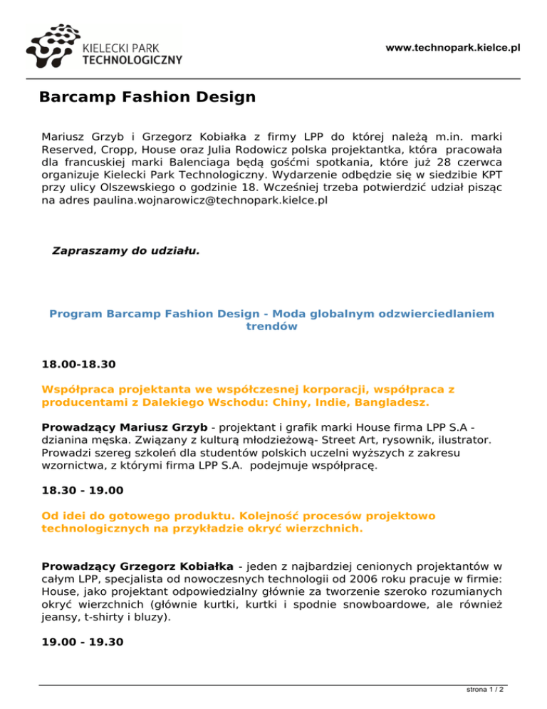 www.technopark.kielce.pl Barcamp Fashion Design Mariusz Grzyb i Grzegorz Kobiałka z firmy LPP do której należą m.in. marki Reserved, Cropp, House oraz Julia Rodowicz polska projektantka, która pracowała dla francuskiej marki Balenciaga będą gośćmi spotkania, które już 28 czerwca organizuje Kielecki Park Technologiczny. Wydarzenie odbędzie się w siedzibie KPT przy ulicy Olszewskiego o godzinie 18. Wcześniej trzeba potwierdzić udział pisząc na adres [email protected] Zapraszamy do udziału. Program Barcamp Fashion Design - Moda globalnym odzwierciedlaniem trendów 18.00-18.30 Współpraca projektanta we współczesnej korporacji, współpraca z producentami z Dalekiego Wschodu: Chiny, Indie, Bangladesz. Prowadzący Mariusz Grzyb - projektant i grafik marki House firma LPP S.A dzianina męska. Związany z kulturą młodzieżową- Street Art, rysownik, ilustrator. Prowadzi szereg szkoleń dla studentów polskich uczelni wyższych z zakresu wzornictwa, z którymi firma LPP S.A. podejmuje współpracę. 18.30 - 19.00 Od idei do gotowego produktu. Kolejność procesów projektowo technologicznych na przykładzie okryć wierzchnich. Prowadzący Grzegorz Kobiałka - jeden z najbardziej cenionych projektantów w całym LPP, specjalista od nowoczesnych technologii od 2006 roku pracuje w firmie: House, jako projektant odpowiedzialny głównie za tworzenie szeroko rozumianych okryć wierzchnich (głównie kurtki, kurtki i spodnie snowboardowe, ale również jeansy, t-shirty i bluzy). 19.00 - 19.30 strona 1 / 2 www.technopark.kielce.pl Kreacja, realizacja i promocja koncepcji mody na przykładzie autorskiej marki odzieżowej Zemełka&Pirowska Prowadząca Agata Zemełka - niezależny fashion designer, stylista. Organizator imprez modowych m.in. podczas Yard Cracow Vibe Project, Platinum Fashion Night, Fashion Week Poland. Współpracowała m.innymi z Weroniką Marczuk "You Can dance/Rochstar"; Magdą Mołek "Dzień Dobry TVN"; Mają Sablewską "X Factor"; Małgorzatą Foremniak "Mam talent" a także showroomami m.in. Casamoda, Pomada, Aliganza. 19.30 - 20.00 Fashion Designer - praca projektanta odzieży w marce luksusowej na przykładzie Domu Mody BALENCIAGA (Paryż). Prowadząca Julia Rodowicz - Fashion Designer. Główny projektant w departamencie Dzianiny Domu Mody Balenciaga - odpowiedzialna za linię ubrań kobiecych, współpracowała m.in. z Maman Montres Intern, Yves Saint Laurent, KOKON TO ZAI. Fotostylistka - współpracowała m.in. z Paris Area, France, Photo Styling for Photographer Krzysztof Kozanowski. strona 2 / 2 Powered by TCPDF (www.tcpdf.org)