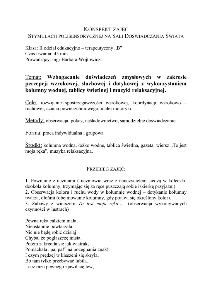 KONSPEKT ZAJĘĆ STYMULACJI POLISENSORYCZNEJ NA SALI DOŚWIADCZANIA ŚWIATA Klasa: II odział edukacyjno – terapeutyczny „B” Czas trwania: 45 min. Prowadzący: mgr Barbara Wojtowicz Temat: Wzbogacanie doświadczeń zmysłowych w zakresie percepcji wzrokowej, słuchowej i dotykowej z wykorzystaniem kolumny wodnej, tablicy świetlnej i muzyki relaksacyjnej. Cele: rozwijanie spostrzegawczości wzrokowej, koordynacji wzrokowo – ruchowej, czucia powierzchniowego, małej motoryki Metody: obserwacja, pokaz, naśladownictwo, samodzielne doświadczanie Forma: praca indywidualna i grupowa Środki: kolumna wodna, łóżko wodne, tablica świetlna, gazeta, wiersz „To jest moja ręka”, muzyka relaksacyjna. PRZEBIEG ZAJĘĆ: 1. Powitanie z uczniami ( uczniowie wraz z nauczycielem siedzą w kółeczku dookoła kolumny, trzymając się za ręce puszczają sobie iskierkę przyjaźni). 2. Obserwacja koloru i ruchu wody w kolumnie wodnej – dotykanie kolumny twarzą, dłońmi (obejmowanie kolumny, gdy pojawi się określony kolor). 3. Zabawy z wierszem To jest moja ręka... (obserwacja wykonywanych czynności w lustrach) Pewna ręka całkiem mała, Nieustannie powtarzała: Nic nie będę robić dzisiaj! Chyba, że pogłaszczę misia. Potem zakręciła się jak wiatrak, Pomachała „pa, pa!” na pożegnania znak! I czym prędzej w kieszeni się skryła, Bo tam tylko przebywać lubiła. Lecz razu pewnego zjawił się lew, Odważny, silny i mądry zwierz. Zgrabnie wskoczył na lewą rękę I zaśpiewał jej lwią piosenkę: Lewa ręko! W górę leć jak jaskółka, Zatocz w locie cztery kółka! Niech każdy paluszek lewej dłoni Przywita kolegę – palec z prawej strony. Potem chwyć gazetę – najlepiej starą, Kolorową lub czarno-białą I gnieć ją, aż straci wygląd płaski I stanie się kulą w ciapki i paski. Podrzuć ją do góry razy kilka Jak z NBA koszykarz piłkę! Teraz wyobraź sobie, zamykając oczy, Jak twa ręka w wodzie się moczy I pływa, i zanurza się w morskiej toni... Ale już czas, by strzepnąć wodę z dłoni. A na koniec podnieś lewą rękę w górę I zawołaj z lwią radością: HURRRAAA! Moja ręka siłę ma! TRA – LA – LA– LA–LA! Wykonywanie czynności wskazywanych w wierszu: – głaskanie rąk, dłoni na przemian (naśladowanie głaskania misia – rolę misia pełnią dłonie dziecka), – obroty rąk: raz jednej, raz drugiej, następnie małe obroty dłoni, – wykonywanie ruchów pionowych ręką, a następnie dłonią, – zakrywanie, chowanie, głaskanie jednej ręki drugą (ze zmianą ról), – unoszenie rąk do góry (najpierw jedna ręka, później druga), – kreślenie w powietrzu dużych kół, – łączenie kolejno palców lewej dłoni z palcami prawej dłoni, – gniecenie, ściskanie, podrzucanie gazety, – naśladowanie ręką ruchu pływania w wodzie, – wykonywanie ruchów strzepywania wody z rąk. 4. Ćwiczenia przy tablicy świetlnej – zabawa w łapanie zajączków. 5. Zakończenie zajęć- relaks na łóżku wodnym, pożegnanie z uczniami.