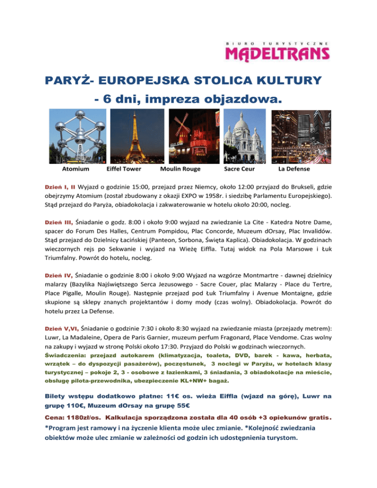 PARYŻ- EUROPEJSKA STOLICA KULTURY - 6 dni, impreza objazdowa. Atomium Eiffel Tower Moulin Rouge Sacre Ceur La Defense Dzień I, II Wyjazd o godzinie 15:00, przejazd przez Niemcy, około 12:00 przyjazd do Brukseli, gdzie obejrzymy Atomium (został zbudowany z okazji EXPO w 1958r. i siedzibę Parlamentu Europejskiego). Stąd przejazd do Paryża, obiadokolacja i zakwaterowanie w hotelu około 20:00, nocleg. Dzień III, Śniadanie o godz. 8:00 i około 9:00 wyjazd na zwiedzanie La Cite - Katedra Notre Dame, spacer do Forum Des Halles, Centrum Pompidou, Plac Concorde, Muzeum dOrsay, Plac Invalidów. Stąd przejazd do Dzielnicy Łacińskiej (Panteon, Sorbona, Święta Kaplica). Obiadokolacja. W godzinach wieczornych rejs po Sekwanie i wyjazd na Wieżę Eiffla. Tutaj widok na Pola Marsowe i Łuk Triumfalny. Powrót do hotelu, nocleg. Dzień IV, Śniadanie o godzinie 8:00 i około 9:00 Wyjazd na wzgórze Montmartre - dawnej dzielnicy malarzy (Bazylika Najświętszego Serca Jezusowego - Sacre Couer, plac Malarzy - Place du Tertre, Place Pigalle, Moulin Rouge). Następnie przejazd pod Łuk Triumfalny i Avenue Montaigne, gdzie skupione są sklepy znanych projektantów i domy mody (czas wolny). Obiadokolacja. Powrót do hotelu przez La Defense. Dzień V,VI, Śniadanie o godzinie 7:30 i około 8:30 wyjazd na zwiedzanie miasta (przejazdy metrem): Luwr, La Madaleine, Opera de Paris Garnier, muzeum perfum Fragonard, Place Vendome. Czas wolny na zakupy i wyjazd w stronę Polski około 17:30. Przyjazd do Polski w godzinach wieczornych. Świadczenia: przejazd autokarem (klimatyzacja, toaleta, DVD, barek - kawa, herbata, wrzątek – do dyspozycji pasażerów), poczęstunek, 3 noclegi w Paryżu, w hotelach klasy turystycznej – pokoje 2, 3 - osobowe z łazienkami, 3 śniadania, 3 obiadokolacje na mieście, obsługę pilota-przewodnika, ubezpieczenie KL+NW+ bagaż. Bilety wstępu dodatkowo płatne: 11€ os. wieża Eiffla (wjazd na górę), Luwr na grupę 110€, Muzeum dOrsay na grupę 55€ Cena: 1180zł/os. Kalkulacja sporządzona została dla 40 osób +3 opiekunów gratis *Program jest ramowy i na życzenie klienta może ulec zmianie. *Kolejność zwiedzania obiektów może ulec zmianie w zależności od godzin ich udostępnienia turystom. .