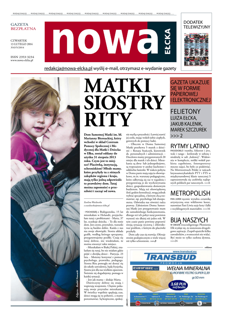 podaj dalej....... podaj dalej....... podaj dalej....... podaj dalej....... podaj dalej....... podaj dalej....... podaj dalej....... podaj dalej....... podaj dalej....... Dodatek Telewizyjny GAZETA BEZPŁATNA czwartek 13 LUTEGO 2014 3(4)/5/2014 ISSN 2353-3234 www.nowa-elcka.pl [email protected] wyślij e-mail, otrzymasz e-wydanie gazety matki siostry rity Ewelina Wasilewska [email protected] z Białegostoku, 15 lat mieszkałam w Holandii, przyjechałam tutaj z problemami - Marta, 37 lat, oczekuje dziecka. - To dla mnie dom. Jest czysto, przytulnie, warunki życia są bardzo dobre. Każda z nas ma swoje obowiązki. Siostra układa grafik, według którego sprzątamy, przygotowujemy posiłki. Czuję się tutaj dobrze, nie wiedziałam, że można stworzyć takie miejsce. - Mieszkałam w Białej Piskiej, znalazłam się tutaj, bo nie miałam gdzie pójść z dwójką dzieci - Patrycja, 23 lata. - Możemy korzystać z pomocy psychologa, prawnika, pedagoga. Siostra Rita pomogła mi dostać się do szkoły zawodowej, będę fryzjerką. Siostra jest dla nas wielkim oparciem. Świetnie się dogadujemy, pomaga w każdej sytuacji. - Jest jak mama – dodaje Marta. Dziewczyny dobrze się znają i wspierają wzajemnie. Chętnie pokazują swoje przytulne mieszkania. W świetlicy wspólnie spędzają czas, dzieci mogą się tu pobawić, a mamy porozmawiać. Są bezpieczne, spokoj- Zdjęcia - Radek Nowacki - Pochodzę nie myślą o przyszłości. Łatwiej stawić jej czoła, mając wokół siebie ciepłych, gotowych do pomocy ludzi. - Obecnie w Domu Samotnej Matki przebywa 5 matek z dziećmi – Renata Stańczyk, kierownik ds. personalnych i administracji. Docelowo mamy przygotowanych 20 miejsc dla matek i ich dzieci. Mieszkania są dwu- lub jednopokojowe, są wyposażone w aneksy kuchenne i oddzielne łazienki. W trakcie pobytu w Domu panie mają zajęcia obowiązkowe, m.in. warsztaty pedagogiczne, które odbywają się raz w tygodniu i przygotowują je do wychowywania dzieci, gospodarowania domowym budżetem. Mają też obowiązkową ilość godzin konsultacji, mogą jednak wybrać specjalistę, z którym chcą rozmawiać, np. psychologa lub duszpasterza. Odwiedza nas również radca prawny. Założeniem Domu Samotnej Matki jest przygotowanie mam do samodzielnego funkcjonowania, dlatego też ich pobyt tutaj powinien wynosić nie dłużej niż jeden rok. W tym czasie panie powinny poprawić swoją sytuację życiową i zlikwidować problem, z którym do placówki przybyły. Dom cały czas się rozwija. Oferuje swoim podopiecznym o wiele więcej niż tylko schronienie. >>>3 Felietony Luiza Ełcka, Jakub kalenik, Marek Szczurek >>> 2 rytmy latino rumba, fokstrot i jive, Pasodoble i walc i tango - królowały w sobotę i niedzielę w sali „balowej”. Widownia w komplecie, stoliki wokół parkietu zapełnione, fotoreporterzy mocno zajęci, bo było co podziwiać. Na Mistrzostwach Polski w tańcach latynoamerykańskich PTT i FTS w międzynarodowej klasie tanecznej S zaprezentowała się czołówka najlepszych polskich par tanecznych. >>>6 metropolish Pan Jurek ręcznie wyrabia ceramikę artystyczną oraz wiklinowe kosze, natomiast Pani Liwia szyje koty i lalki z recyklingowych materiałów. >>>16 biją naszych W obozie trzecioligowego Płomienia Ełk wydaje się, że stonowano drugoligowe aspiracje. Zespół opuściło kilku zawodników, a wzmocnień nie widać. Być może to tylko zasłona dymna. >>>24 reklama [R011P] Dom Samotnej Matki im. bł. Marianny Biernackiej, który wchodzi w skład Centrum Pomocy Społecznej i Medycznej dla Matki i Dziecka w Ełku, został oddany do użytku 31 sierpnia 2013 roku. Czym jest to miejsce? Placówką, instytucją, schroniskiem? Młode mamy, które przybyły tu z różnych zakątków regionu i kraju, mają tylko jedną odpowiedź: to prawdziwy dom. Tutaj można zapomnieć o przeszłości i zacząć od nowa. gazeta ukazuje się w formie papierowej i Elektronicznej felieton(Y), przemyślenia, słowa... 2 NOWA EŁCKA 3(4)/5/2014 czwartek 13 lutego 2014 Dobre opowiedzenie samego siebie N arracje wizerunkowe dwóch absolwentów ełckich szkół posłużą do szacowania efektów pozytywnej i negatywnej kampanii wizerunkowej. Tomasz Makowski, absolwent Mechaniaka, w telewizji kłamie o przyszłości swojej szkoły. Wywołuje nieprawdziwe wrażenie upadku szkoły. Kładzie w ten sposób na swoją szkołę cień czarnej legendy. Komunikat dla gimnazjalistów: wybierz inną szkołę. Tomasz Andrukiewicz, absolwent Czerwonego, składa gratulacje swojej szkole za najwyższe osiągnięcia w rankingu szkół. Dzieli się przez to ze swoją szkołą blaskiem popularności. Komunikat dla gimnazjalistów: wybierz tę szkołę. Tomasz Andrukiewicz – piar miły dla wszystkich. Tomasz Makowski – piar miły rzadko komu. Kształt postaw wobec szkół to wycinek całościowej opowieści wizerunkowej. Tomasz Andrukiewicz prowadzi narrację pozytywną. Sam walczy za wszyst- kich. Wskazuje szanse miłe każdemu elektoratowi. Tomasz Makowski kreśli narrację negatywną wobec otoczenia. Sam walczy ze wszystkimi. Wskazuje wydumane winy, szczególnie tych, którym spodziewa się odebrać elektorat. Ulubionym orężem obu są konferencje prasowe, w porównaniu których tym bardziej obserwujemy dychotomię. Luiza Ełcka Tomasz Andrukiewicz informuje media o kolejnych sukcesach miłych dla każdego, Tomasz Makowski zawiadamia o kolejnych osobach do politycznego odstrzału. Przekaz jednego i drugiego narratora mówi o sprawach, na które nie mają Z cyklu: Słowo z ambony wpływu bezpośrednio, ale kształtują styl opowieści o nich. Obie strategie wizerunkowe choć tak różne w charakterze pozornie trącają te same nuty: mówią o trosce, dodają otuchy. Jednak elektorat jasnej strony podnosi się na duchu, bo jest ktoś, kto myśli za wszystkich i daruje winy, zaś elektoratowi ciemnej strony podsyca się nadzieję straszeniem, że jest ktoś, kto zemści się za nich na wszystkich. Co da l