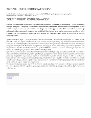 WYDZIAŁ RUCHU DROGOWEGO KSP Źródło: http://wrd.policja.waw.pl/wrd/pytania-i-odpowiedzi/11882,Zolty-quotkogutquot-ostrzegawczy.html Wygenerowano: Czwartek, 2 marca 2017, 21:54 ŻÓŁTY "KOGUT" OSTRZEGAWCZY? Planuję zainwestować w reklamę na samochodzie jednak mam pewne wątpliwości co do legalności mojego pomysłu. Z tego co zdołałem się dowiedzieć zabronione jest umieszczanie kogutów barwy niebieskiej i czerwonej niezależnie od tego czy działają czy nie. Nie znalazłem informacji zabraniającej umieszczania kogutów barwy żółtej. Nie planuję go w ogóle używać, ma on służyć tylko i wyłącznie jako element reklamy. Czy wolno mi zainstalować takie urządzenie w celach promocyjnych? Zgodnie z art. 66 ust. 1 pkt 1 i ust. 4 pkt 2 ustawy z dnia 20 czerwca 1997 r. Prawo o ruchu drogowy (Dz. U. z 2005 r., Nr 108, poz. 908 z późn. zm.) pojazd uczestniczący w ruchu powinien być tak wyposażony, aby nie zagrażał innym uczestnikom ruchu oraz nie zakłócał porządku ruchu na drodze, a zastosowane w nim wyposażenie odpowiadało warunkom określonym w przepisach szczegółowych. Przepisem szczegółowym określającym zakres niezbędnego wyposażenia pojazdów jest rozporządzenie Ministra Infrastruktury z dnia 31 grudnia 2002 roku w sprawie warunków technicznych pojazdów oraz zakresu ich niezbędnego wyposażenia (Dz. U. z 2003 r., Nr 32 poz. 262). Cytowane wyżej rozporządzenie przewiduje montaż na pojeździe światła błyskowego barwy żółtej oraz światła barwy białej z nazwą prowadzonej działalności jedynie dla specyficznych grup pojazdów takich jak np. taksówka, pojazd uprzywilejowany policji czy dla pojazdów wykonujących czynności na drodze lub pojazdów samochodowych, na które ze względu na bezpieczeństwo ruchu należy zwracać szczególną uwagę. W przedstawionym przypadku nie można zakwalifikować pojazdu do żadnej z powyższych kategorii pojazdów, co w naszej ocenie nie pozwala na montaż na pojeździe przedmiotowych świateł nawet w sytuacji, gdy nie miałyby być one używane. Nie ma natomiast przeciwskazań prawnych do oklejenia pojazdu z zastrzeżeniem sytuacji, w której umieszczenie z przodu lub z tyłu pojazdu znaków lub napisów mogłoby ograniczyć czytelność tablic rejestracyjnych (art. 60 ust. 1 pkt 3 cytowanej wyżej ustawy). Ocena: 5/5 (1) Tweetnij