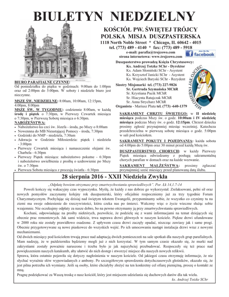 BIULETYN NIEDZIELNY KOĝCIÓà PW. ĝWIĉTEJ TRÓJCY POLSKA MISJA DUSZPASTERSKA 1118 North Noble Street * Chicago, IL 60642 - 4015 tel. (773) 489 - 4140 * fax: (773) 489 - 5918 BIURO PARAFIALNE CZYNNE: Od poniedziaáku do piątku w godzinach: 9:00am do 1:00pm oraz od 2:00pm do 5:00pm. W soboty i niedziele biuro jest nieczynne. MSZE ĝW. NIEDZIELNE: 8:00am, 10:00am, 12:15pm, 4:00pm, 8:00pm MSZE ĝW. W TYGODNIU: codziennie 8:00am, w kaĪdą ĞrodĊ i piątek o 7:30pm, w Pierwszy Czwartek miesiąca o 7:30pm, w Pierwszą SobotĊ miesiąca o 6:30pm. NABOĩEēSTWA: • NaboĪeĔstwo ku czci Ğw. Józefa - Ğroda, po Mszy o 8:00am • Nowennna do MB Nieustającej Pomocy - Ğroda, 7:30pm • Godzinki do NMP - niedziela, 7:30am • Adoracja w Godzinie Miáosierdzia: piątek i niedziela - 3:00pm • Pierwszy Czwartek miesiąca i namaszczenie olejami Ğw. Charbela - 6:30pm • Pierwszy Piątek miesiąca: naboĪeĔstwo pokutne - 6:30pm i naboĪeĔstwo uwielbienia z proĞbą o uzdrowienie po Mszy Ğw. o 7:30pm • Pierwsza Sobota miesiąca z procesją Ğwiatáa - 6:30pm e-mail: [email protected] strona internetowa: www.trojcowo.com Duszpasterstwo prowadzą KsiĊĪa Chrystusowcy: Ks. Andrzej Totzke SChr - Dyrektor Ks. Adam SáomiĔski SChr - Asystent Ks. Krzysztof Janicki SChr - Asystent Ks. Wojciech Baryski SChr - Rezydent Siostry Misjonarki tel. (773) 227-9826 Sr. Gertruda SzymaĔska MChR Sr. Krystiana Pucik MChR Sr. Hiacynta Ratajczak MChR Sr. Anna Strycharz MChR Organista - Mariusz Pluta tel. (773) -640-1379 SAKRAMENT CHRZTU ĝWIĉTEGO: w II niedzielĊ miesiąca podczas Mszy Ğw. o godz. 10:00am i IV niedzielĊ miesiąca podczas Mszy Ğw. o godz. 12:15pm. Chrzest dziecka prosimy zgáosiü przynajmniej miesiąc wczeĞniej. Katecheza przedchrzcielna w pierwszą sobotĊ miesiąca o godz. 5:00pm w sali pod koĞcioáem. SAKRAMENT POKUTY I POJEDNANIA: kaĪda sobota od 4:00pm do 5:00pm oraz 30 minut przed kaĪdą Mszą Ğw. DUSZPASTERSTWO CHORYCH: w kaĪdy Pierwszy Piątek miesiąca odwiedzamy z posáugą sakramentalną chorych parafian w domach oraz na kaĪde wezwanie. SAKRAMENT MAàĩEēSTWA: prosimy zgáaszaü przynajmniej szeĞü miesiĊcy przed planowaną datą Ğlubu. 28 sierpnia 2016 - XXII Niedziela Zwykáa „OdpáatĊ bowiem otrzymasz przy zmartwychwstaniu sprawiedliwych”. Por. àk 14,1.7-14 Powoli koĔczy siĊ wakacyjny czas wypoczynku. MyĞlĊ, Īe kaĪdy z nas dobrze go wykorzystaá. Zrelaksowani, peáni siá oraz nowych pomysáów zaczynamy kolejny rok duszpasterski, który oficjalnie rozpoczniemy juĪ za trzy tygodnie Forum Charyzmatycznym. Pochylając siĊ dzisiaj nad ĞwiĊtym tekstem Ewangelii, przypominamy sobie, Īe wszystko co czynimy tu na ziemi ma swoje odniesienie do rzeczywistoĞci, która czeka nas po Ğmierci. Walczmy wiĊc o Īycie wieczne sáuĪąc sobie wzajemnie. Nie oczekujmy odpáaty za nasze dobro, bo na pewno otrzymamy ją przy zmartwychwstaniu sprawiedliwych. Kochani, odpowiadając na proĞby niektórych, pozwólcie, Īe podzielĊ siĊ z wami informacjami na temat dziejących siĊ obecnie prac remontowych. Jak sami widzicie, trwa naprawa drzwi gáównych w naszym koĞciele. PiĊkne drzwi ufundowane w 2000 roku nie zostaáy prawidáowo osadzone. Z upáywem czasu drzwi zaczĊáy opadaü, niszcząc zawiasy jak i same progi. Obecnie przygotowywane są nowe piaskowce do wszyskich wejĞü. Po ich umocowaniu nastąpi instalacja drzwi wraz z nowymi mechanizmami. Od dwóch miesiĊcy pod koĞcioáem trwają prace nad adaptacją dwóch pomieszczeĔ na sale spotkaĔ dla naszych grup parafialnych. Mam nadzejĊ, Īe w paĨdzierniku bĊdziemy mogli juĪ z nich korzystaü. W tym samym czasie okazaáo siĊ, Īe murki nad zakrystiami zostaáy powaĪnie naruszone i trzeba byáo je jak najszybciej przebudowaü. Rozpoczeáy siĊ teĪ prace nad powiĊkszeniem naszych katakumb, aby uáatwiü do nich dostĊp i stworzyü miejsce dla naszych nowych relikwii. Sprawa, która ostatnio pojawiáa siĊ dotyczy nagáoĞnienia w naszym koĞciele. Od jakiegoĞ czasu otrzymujĊ informacje, Īe nie sáychaü wyraĨnie sáów wypowiadanych z ambony. Po szczegóáowym sprawdzeniu dotychczasowych gáoĞników, okazaáo siĊ, Īe jest pilna potrzeba ich wymiany. JeĞli są osoby, które chciaáyby záoĪyü na ten konkretny cel ofiarĊ pieniĊĪną, proszĊ o kontakt ze mną. PragnĊ podziĊkowaü za Waszą troskĊ o nasz koĞcióá, który jest miejscem udzielania siĊ duchowych darów dla tak wielu. ks. Andrzej Totzke SChr I CZWARTEK MIESIĄCA i NABOĩEēSTWO KU CZCI ĝW. CHARBELA 1 wrzeĞnia 6:30pm - Godzina ĝwiĊta 7:30pm - Msza Ğw. Po Mszy Ğw. naboĪeĔstwo namaszczenia olejami Ğw. Charbela. I PIĄTEK MIESIĄCA i NABOĩEēSTWO UWIELBIENIA Z PROĝBĄ O UZDROWIENIE 2 wrzeĞnia 3:00pm - Adoracja NajĞwiĊtszego Sakramentu 6:30pm - NaboĪeĔstwo pokutne i spowiedĨ 7:30pm - Msza Ğw. i naboĪeĔstwo uwielbienia z proĞbą o uzdrowienie Jerycho RózaĔcowe - caáonocne czuwanie w intencji wynagradzającej za grzechy Narodu Polskiego i Krucjaty RóĪaĔcowej I SOBOTA MIESIĄCA Pragnąc odpowiedzieü na wezwanie Maryi wzywającej ludzkoĞü do nawrócenia, zapraszamy do uczestnictwa w naboĪeĔstwie pierwszych sobót miesiąca. W naszym koĞciele odbĊdzie siĊ ono w sobotĊ, 3 wrzeĞnia o godz. 6:30pm (róĪaniec, rozwaĪanie i Msza Ğw. z procesją Ğwiatáa na zewnątrz koĞcioáa). 77 ROCZNICA WYBUCHU II WOJNY ĝWIATOWEJ W najbliĪszy czwartek, 1 wrzeĞnia przypada 77 rocznica wybuchu drugiej wojny Ğwiatowej. Naszą powinnoĞcią jest pamiĊtaü o polegáych w obronie Ojczyzny w latach 1939 - 1945 na frontach i w obozach oraz o pomordowanych patriotach po skoĔczonej wojnie w wiĊzieniach politycznych. Chwaáa Bohaterom! Wieczny odpoczynek racz im daü Panie.... KATECHEZA NIEDZIELNA Serdecznie zapraszamy dzieci, które nie mają katechezy w szkole na zajĊcia katechetyczne. Katecheza dla uczniów w wieku od 3 lat do klasy 8 rozpocznie siĊ w niedzielĊ 11 wrzeĞnia o godz. 11:15am, w budynku szkoáy 