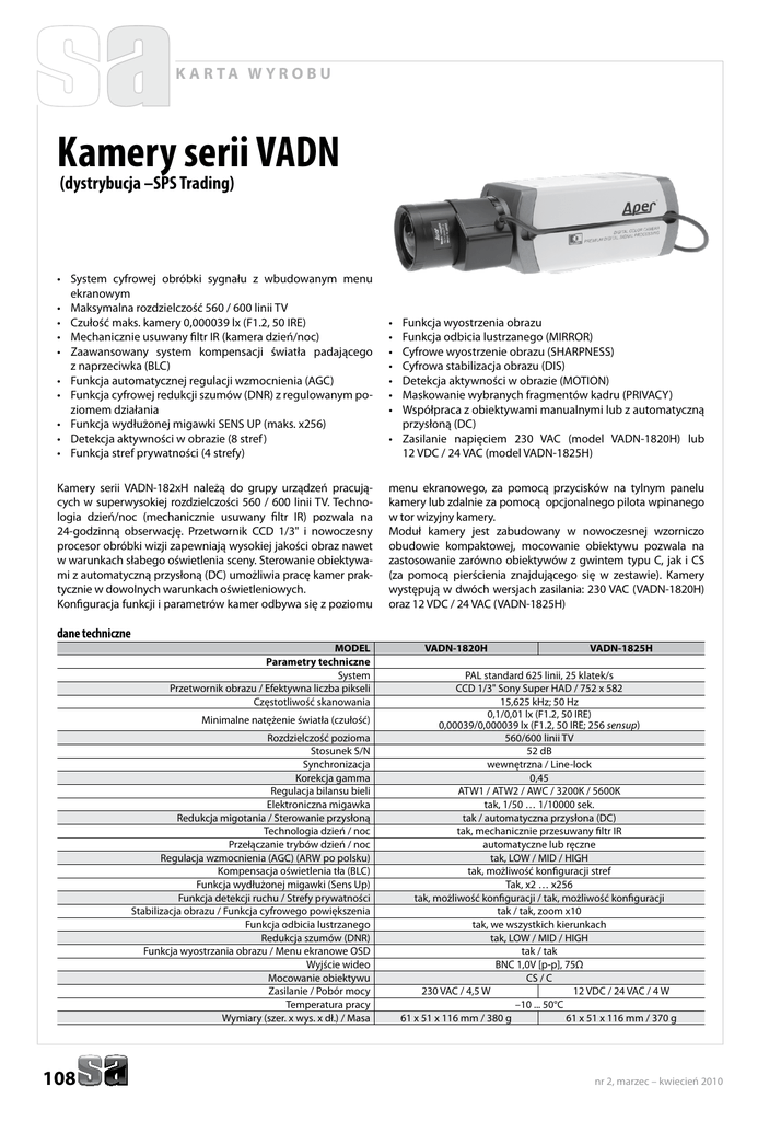k a r ta w y r o b u Kamery serii VADN (dystrybucja –SPS Trading) • System cyfrowej obróbki sygnału z wbudowanym menu ekranowym • Maksymalna rozdzielczość 560 / 600 linii TV • Czułość maks. kamery 0,000039 lx (F1.2, 50 IRE) • Mechanicznie usuwany filtr IR (kamera dzień/noc) • Zaawansowany system kompensacji światła padającego z naprzeciwka (BLC) • Funkcja automatycznej regulacji wzmocnienia (AGC) • Funkcja cyfrowej redukcji szumów (DNR) z regulowanym poziomem działania • Funkcja wydłużonej migawki SENS UP (maks. x256) • Detekcja aktywności w obrazie (8 stref ) • Funkcja stref prywatności (4 strefy) • • • • • • • Kamery serii VADN-182xH należą do grupy urządzeń pracujących w superwysokiej rozdzielczości 560 / 600 linii TV. Technologia dzień/noc (mechanicznie usuwany filtr IR) pozwala na 24-godzinną obserwację. Przetwornik CCD 1/3" i nowoczesny procesor obróbki wizji zapewniają wysokiej jakości obraz nawet w warunkach słabego oświetlenia sceny. Sterowanie obiektywami z automatyczną przysłoną (DC) umożliwia pracę kamer praktycznie w dowolnych warunkach oświetleniowych. Konfiguracja funkcji i parametrów kamer odbywa się z poziomu menu ekranowego, za pomocą przycisków na tylnym panelu kamery lub zdalnie za pomocą opcjonalnego pilota wpinanego w tor wizyjny kamery. Moduł kamery jest zabudowany w nowoczesnej wzorniczo obudowie kompaktowej, mocowanie obiektywu pozwala na zastosowanie zarówno obiektywów z gwintem typu C, jak i CS (za pomocą pierścienia znajdującego się w zestawie). Kamery występują w dwóch wersjach zasilania: 230 VAC (VADN-1820H) oraz 12 VDC / 24 VAC (VADN-1825H) Funkcja wyostrzenia obrazu Funkcja odbicia lustrzanego (MIRROR) Cyfrowe wyostrzenie obrazu (SHARPNESS) Cyfrowa stabilizacja obrazu (DIS) Detekcja aktywności w obrazie (MOTION) Maskowanie wybranych fragmentów kadru (PRIVACY) Współpraca z obiektywami manualnymi lub z automatyczną przysłoną (DC) • Zasilanie napięciem 230 VAC (model VADN-1820H) lub 12 VDC / 24 VAC (model VADN-1825H) dane techniczne MODEL Parametry techniczne System Przetwornik obrazu / Efektywna liczba pikseli Częstotliwość skanowania Minimalne natężenie światła (czułość) Rozdzielczość pozioma Stosunek S/N Synchronizacja Korekcja gamma Regulacja bilansu bieli Elektroniczna migawka Redukcja migotania / Sterowanie przysłoną Technologia dzień / noc Przełączanie trybów dzień / noc Regulacja wzmocnienia (AGC) (ARW po polsku) Kompensacja oświetlenia tła (BLC) Funkcja wydłużonej migawki (Sens Up) Funkcja detekcji ruchu / Strefy prywatności Stabilizacja obrazu / Funkcja cyfrowego powiększenia Funkcja odbicia lustrzanego Redukcja szumów (DNR) Funkcja wyostrzania obrazu / Menu ekranowe OSD Wyjście wideo Mocowanie obiektywu Zasilanie / Pobór mocy Temperatura pracy Wymiary (szer. x wys. x dł.) / Masa 108 VADN-1820H VADN-1825H PAL standard 625 linii, 25 klatek/s CCD 1/3" Sony Super HAD / 752 x 582 15,625 kHz; 50 Hz 0,1/0,01 lx (F1.2, 50 IRE) 0,00039/0,000039 lx (F1.2, 50 IRE; 256 sensup) 560/600 linii TV 52 dB wewnętrzna / Line-lock 0,45 ATW1 / ATW2 / AWC / 3200K / 5600K tak, 1/50 … 1/10000 sek. tak / automatyczna przysłona (DC) tak, mechanicznie przesuwany filtr IR automatyczne lub ręczne tak, LOW / MID / HIGH tak, możliwość konfiguracji stref Tak, x2 … x256 tak, możliwość konfiguracji / tak, możliwość konfiguracji tak / tak, zoom x10 tak, we wszystkich kierunkach tak, LOW / MID / HIGH tak / tak BNC 1,0V [p-p], 75Ω CS / C 230 VAC / 4,5 W 12 VDC / 24 VAC / 4 W –10 ... 50°C 61 x 51 x 116 mm / 380 g 61 x 51 x 116 mm / 370 g nr 2, marzec – kwiecień 2010