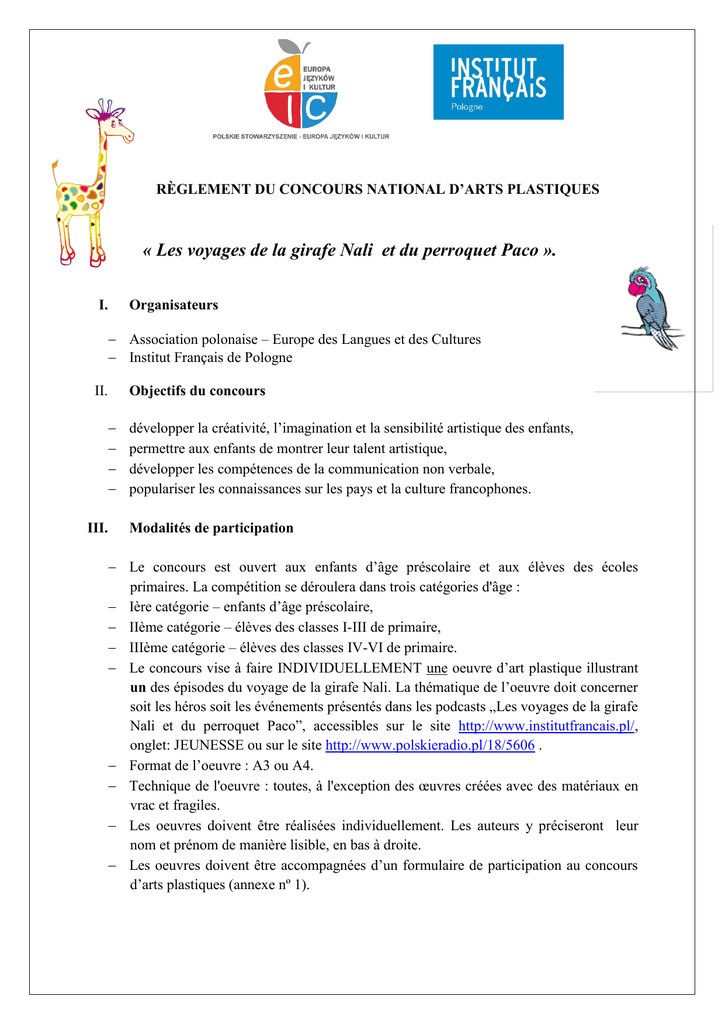 RÈGLEMENT DU CONCOURS NATIONAL D’ARTS PLASTIQUES « Les voyages de la girafe Nali et du perroquet Paco ». I. Organisateurs Association polonaise – Europe des Langues et des Cultures Institut Français de Pologne II. Objectifs du concours III. développer la créativité, l’imagination et la sensibilité artistique des enfants, permettre aux enfants de montrer leur talent artistique, développer les compétences de la communication non verbale, populariser les connaissances sur les pays et la culture francophones. Modalités de participation Le concours est ouvert aux enfants d’âge préscolaire et aux élèves des écoles primaires. La compétition se déroulera dans trois catégories d'âge : Ière catégorie – enfants d’âge préscolaire, IIème catégorie – élèves des classes I-III de primaire, IIIème catégorie – élèves des classes IV-VI de primaire. Le concours vise à faire INDIVIDUELLEMENT une oeuvre d’art plastique illustrant un des épisodes du voyage de la girafe Nali. La thématique de l’oeuvre doit concerner soit les héros soit les événements présentés dans les podcasts „Les voyages de la girafe Nali et du perroquet Paco”, accessibles sur le site http://www.institutfrancais.pl/, onglet: JEUNESSE ou sur le site http://www.polskieradio.pl/18/5606 . Format de l’oeuvre : A3 ou A4. Technique de l'oeuvre : toutes, à l'exception des œuvres créées avec des matériaux en vrac et fragiles. Les oeuvres doivent être réalisées individuellement. Les auteurs y préciseront leur nom et prénom de manière lisible, en bas à droite. Les oeuvres doivent être accompagnées d’un formulaire de participation au concours d’arts plastiques (annexe nº 1). Les travaux doivent être envoyés par voie postale à l'adresse suivante : Polskie Stowarzyszenie – Europa Języków i Kultur Patrycja Koźlik ul. Rozpłochowskiej 7e/4 42-600 Tarnowskie Góry CONCOURS : Les voyages de la girafe Nali et du perroquet Paco. IV. Dates du concours La date limite de dépôt des travaux est fixée au : 31 mars 2017 (le cachet de la poste faisant foi). La proclamation des résultats: le 18 avril 2017 sur le site www.frankofonia.pl et www.institutfrancais.pl Les prix seront envoyés par voie postale début mai 2017. Les oeuvres seront diffusées sur les sites www.frankofonia.pl, www.institutfrancais.pl ainsi que sur les pages facebook Francuskif et ELC. V. Les critères d`évaluation des dessins : Le jury sélectionnera les meilleurs dessins selon les critères suivants : la pertinence par rapport au thème, l’originalité, la créativité (interprétation du thème), le niveau de la technique choisie. Les organisateurs ont prévu des prix attrayants pour les lauréats. Les diplômes seront envoyés uniquement aux lauréats du concours et à leurs professeurs. Les questions doivent être adressées à : [email protected] Nous vous invitons à participer au concours et nous attendons vos travaux ! Załącznik nr 1 Karta zgłoszenia do udziału w konkursie plastycznym „Podróże żyrafy Nali i papugi Paco” Imię i nazwisko autora: . . . . . . . . . . . . . . . . . . . . . . . . . . . . . . . . . . . . . . . . . . . . . . . . . . . . . . . ........................................................................... Wiek/klasa: . . . . . . . . . . . . . . . . . . . . . . . . . . . . . . . . . . . . . . . . . . . . . . . . . . . . . . . . . . . . . . . . Adres zamieszkania: . . . . . . . . . . . . . . . . . . . . . . . . . . . . . . . . . . . . . . . . . . . . . . . . . . . . . . . . . ........................................................................... tel. /e-mail: . . . . . . . . . . . . . . . . . . . . . . . . . . . . . . . . . . . . . . . . . . . . . . . . . . . . . . . . . . . . . . . . Imię i nazwisko nauczyciela/opiekuna:. . . . . . . . . . . . . . . . . . . . . . . . . . . . . . . . . . . . . . . . . . Telefon kontaktowy (nauczyciela/opiekuna):. . . . . . . . . . . . . . . . . . . . . . . . . . . . . . . . . . . . . . e-mail (nauczyciela/opiekuna): . . . . . . . . . . . . . . . . . . . . . . . . . . . . . . . . . . . . . . . . . . . . . . . . . Przedszkole/szkoła – adres, telefon: . . . . . . . . . . . . . . . . . . . . . . . . . . . . . . . . . . . . . . . . . . . . . ........................................................................... ........................................................................... ........................................................................... Wyrażam zgodę na przetwarzanie swoich danych osobowych zgodnie z ustawą o Ochronie Danych Osobowych (Dz.U.Nr.133 pozycja 883) oraz na nieodpłatne wykorzystywanie przez Organizatora Konkursu nadesłanych prac w dowolnym czasie i formie dla celów promocyjnych Organizatora. ....................... Miejscowość, data . . . . . . . . . . . . . . . . . ……….. . . . . . . Podpis autora prac/ opiekuna prawnego