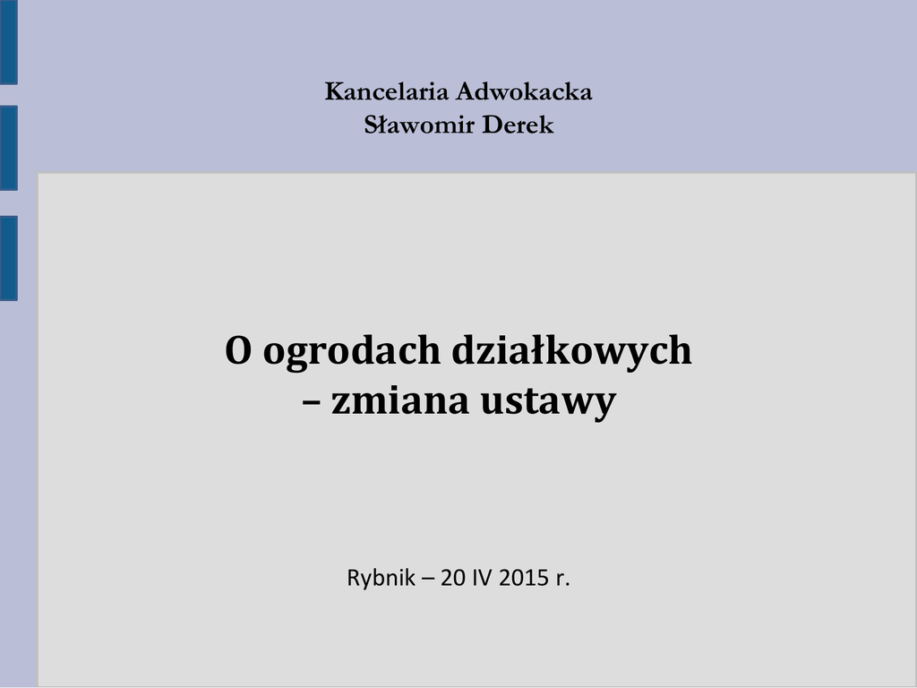Kancelaria Adwokacka Sławomir Derek O ogrodach działkowych – zmiana ustawy Rybnik – 20 IV 2015 r. Podstawa prawna funkcjonowania ogródków działkowych Aktualną podstawę funkcjonowania rodzinnych ogródków działkowych stanowi: ustawa z dnia z dnia 13 grudnia 2013 r. o rodzinnych ogrodach działkowych (Dz.U. z 2014 r. poz. 40) Niekonstytucyjność dotychczasowych przepisów Wyrok Trybunału Konstytucyjnego z dnia 11 lipca 2012 r. sygn. akt: K 8/10 Na skutek wejścia w życie wyroku TK o niezgodności 24 przepisów ustawy z dnia 8 lipca 2005 r. o rodzinnych ogrodach działkowych za niezgodne z Konstytucją, Polski Związek Działkowców stracił podstawę swojego istnienia. Zakres regulacji ustawy o rodzinnych ogrodach działkowych Ustawa reguluje: ● zasady zakładania, funkcjonowania i likwidacji rodzinnych ogrodów działkowych ● prawa i obowiązki działkowców ● zasady ich zrzeszania się działkowców ● zadania organizacji działkowców Zmiana formy organizacyjnej ogrodów działkowych Pozbawienie Polskiego Związku Działkowców monopolu na zarządzanie ogrodami działkowymi Przekształcenie Polskiego Związku Działkowców w stowarzyszenie ogrodowe Możliwość tworzenia nowych stowarzyszeń ogrodowych w celu zakładania i prowadzenia rodzinnych ogrodów działkowych Stowarzyszenia ogrodowe Stowarzyszenie ogrodowe jest to stowarzyszenie w rozumieniu przepisów ustawy z dnia 7 kwietnia 1989 r. - Prawo o stowarzyszeniach (Dz.U. z 2001 r. Nr 79, poz. 855, z późn. zm.2) powołane wyłącznie w celu zakładania i prowadzenia rodzinnych ogrodów działkowych Konsekwencje organizacji ogrodów w oparciu o stowarzyszenia: - dobrowolność - samorządność Wybór pomiędzy PZD a własnym stowarzyszeniem Podjęcie uchwały przez zebranie wszystkich działkowców korzystających z działek na terenie rodzinnego ogrodu działkowego o: - Utworzeniu nowego stowarzyszenia ogrodowego lub - pozostaniu w stowarzyszeniu ogrodowym PZD Możliwość zmiany po 2 latach od ostatniego głosowania nad wyborem stowarzyszenia zarządzającego ogrodem działkowym Jak można nabyć prawo do ogródka działkowego? Ustanowienie prawa do działki następuje na podstawie umowy dzierżawy działkowej. Umowa ta jest podpisywana pomiędzy stowarzyszeniem ogrodowym a pełnoletnią osobą fizyczną. Umowę można podpisać również z małżonkiem działkowca, jeżeli żąda ustanowienia prawa do działki wspólnie ze swoim współmałżonkiem. Umowa nie może być podpisana w celu ustanowienia prawa do więcej niż jednej działki (art. 27 i 28). prawo używania działki i pobierania z niej pożytków (użytkowanie działki) ustanowione na podstawie art. 14 ust. 1 ustawy z dnia 8 lipca 2005 r. o rodzinnych ogrodach działkowych (stara ustawa), przekształca się w prawo do działki w rozumieniu obecnej ustawy, ustanawiane w drodze umowy dzierżawy działkowej (art. 66 pkt 2). Treść umowy dzierżawy Przez umowę dzierżawy działkowej stowarzyszenie ogrodowe zobowiązuje się oddać działkowcowi działkę na czas nieoznaczony do używania i pobierania z niej pożytków, a działkowiec zobowiązuje się używać działkę zgodnie z jej przeznaczeniem, przestrzegać regulaminu oraz uiszczać opłaty ogrodowe (art. 28) Co z urządzeniami na działce nabytymi przez działkowca? Nasadzenia, urządzenia i obiekty znajdujące się na działce, wykonane lub nabyte ze środków finansowych działkowca stanowią jego własność. W razie wygaśnięcia prawa do działki, działkowcowi będzie przysługiwało wynagrodzenie za znajdujące się na działce nasadzenia, urządzenia i obiekty stanowiące jego własność. Wynagrodzenie nie będzie przysługiwało za nasadzenia, urządzenia i obiekty wykonane niezgodnie z prawem (art. 30). Czy działkowiec może przenieść prawa do działki? Działkowiec może przenieść na podstawie umowy prawa i obowiązki wynikające z prawa do działki na rzecz pełnoletniej osoby fizycznej (przeniesienie praw do działki). Umowę zawiera się w formie pisemnej z podpisami notarialnie poświadczonymi. Skuteczność przeniesienia praw do działki będzie zależała od zatwierdzenia przez stowarzyszenie ogrodowe. Odmowa zatwierdzenia przeniesienia praw do działki będzie mogła nastąpić z ważnych powodów (art. 41). Czy prawo do działki podlega dziedziczeniu? W razie śmierci jednego z małżonków prawo do działki, które przysługiwało obojgu małżonkom, przypada drugiemu małżonkowi. Jeżeli małżonek nie posiadał prawa do działki, może w terminie 6 miesięcy od dnia śmierci małżonka złożyć oświadczenie woli o wstąpieniu w stosunek prawny wynikający z tego prawa, pod rygorem wygaśnięcia prawa do działki. Z chwilą wygaśnięcia prawa do działki w następstwie niedokonania czynności, o której mowa w ust. 1, roszczenie o ustanowienie prawa do działki po zmarłym przysługuje innym osobom bliskim. Za co działkowiec musi płacić? Działkowiec jest obowiązany uczestniczyć w pokrywaniu kosztów funkcjonowania ROD w częściach przypadających na jego działkę, przez uiszczanie opłat ogrodowych. Zasady ustalania i uiszczania opłat ogrodowych określa statut stowarzyszenia ogrodowego. Na koszty funkcjonowania ROD składają się w szczególności: 1) wydatki na inwestycje, remonty i bieżącą konserwację infrastruktury ogrodowej; 2) opłaty za dostawę energii elektrycznej i cieplnej, gazu i wody, w części dotyczącej terenu ogólnego i infrastruktury ogrodowej; 3) ubezpieczenia, podatki i inne opłaty publicznoprawne; 4) wydatki na utrzymanie porządku i czystości; 5) wydatki związane z zarządzaniem ROD. Opłata ogrodowa O zmianie wysokości opłat ogrodowych stowarzyszenie ogrodowe jest obowiązane zawiadomić działkowców, w sposób określony w statucie, co najmniej 14 dni przed upływem terminu do wnoszenia opłat ogrodowych, nie później jednak niż do końca miesiąca poprzedzającego ten termin. W terminie 2 miesięcy od dnia zawi