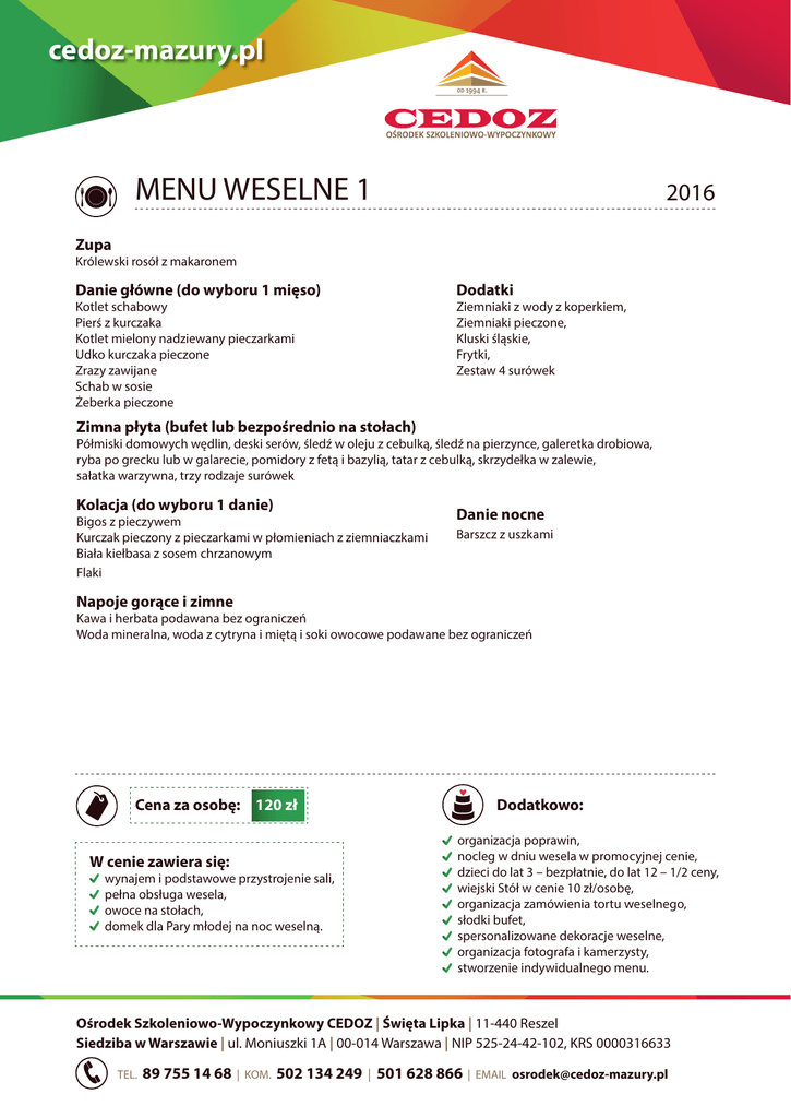 cedoz-mazury.pl MENU WESELNE 1 2016 Zupa Królewski rosół z makaronem Danie główne (do wyboru 1 mięso) Kotlet schabowy Pierś z kurczaka Kotlet mielony nadziewany pieczarkami Udko kurczaka pieczone Zrazy zawijane Schab w sosie Żeberka pieczone Dodatki Ziemniaki z wody z koperkiem, Ziemniaki pieczone, Kluski śląskie, Frytki, Zestaw 4 surówek Zimna płyta (bufet lub bezpośrednio na stołach) Półmiski domowych wędlin, deski serów, śledź w oleju z cebulką, śledź na pierzynce, galeretka drobiowa, ryba po grecku lub w galarecie, pomidory z fetą i bazylią, tatar z cebulką, skrzydełka w zalewie, sałatka warzywna, trzy rodzaje surówek Kolacja (do wyboru 1 danie) Bigos z pieczywem Kurczak pieczony z pieczarkami w płomieniach z ziemniaczkami Biała kiełbasa z sosem chrzanowym Flaki Danie nocne Barszcz z uszkami Napoje gorące i zimne Kawa i herbata podawana bez ograniczeń Woda mineralna, woda z cytryna i miętą i soki owocowe podawane bez ograniczeń Cena za osobę: 120 zł W cenie zawiera się: wynajem i podstawowe przystrojenie sali, pełna obsługa wesela, owoce na stołach, domek dla Pary młodej na noc weselną. Dodatkowo: organizacja poprawin, nocleg w dniu wesela w promocyjnej cenie, dzieci do lat 3 – bezpłatnie, do lat 12 – 1/2 ceny, wiejski Stół w cenie 10 zł/osobę, organizacja zamówienia tortu weselnego, słodki bufet, spersonalizowane dekoracje weselne, organizacja fotografa i kamerzysty, stworzenie indywidualnego menu. Ośrodek Szkoleniowo-Wypoczynkowy CEDOZ | Święta Lipka | 11-440 Reszel Siedziba w Warszawie | ul. Moniuszki 1A | 00-014 Warszawa | NIP 525-24-42-102, KRS 0000316633 TEL. 89 755 14 68 | KOM. 502 134 249 | 501 628 866 | EMAIL [email protected] cedoz-mazury.pl MENU WESELNE 2 Zupa (do wyboru 2 zupy) 2016 Krem z pieczarek z groszkiem ptysiowym Cebulowa z grzankami Królewski rosół z makaronem Żur z jajkiem Pomidorowa z makaronem Danie główne (do wyboru 2 mięsa) Kotlet schabowy Pierś z kurczaka Kotlet mielony nadziewany pieczarkami Udko kurczaka pieczone Zrazy zawijane Schab w sosie Żeberka pieczone Dodatki Ziemniaki z wody z koperkiem, Ziemniaki pieczone, Kluski śląskie, Frytki, Zestaw 4 surówek Zimna płyta (bufet lub bezpośrednio na stołach) Półmiski domowych wędlin, deski serów, śledź w oleju z cebulką, śledź na pierzynce, galeretka drobiowa, ryba po grecku lub w galarecie, pomidory z fetą i bazylią, tatar z cebulką, skrzydełka w zalewie, sałatka warzywna, trzy rodzaje surówek Kolacja 1 (do wyboru 1 danie) Bigos z pieczywem Kurczak pieczony z pieczarkami w płomieniach z ziemniaczkami Żeberka pieczone z ziemniaczkami Zrazy zawijane z ziemniaczkami Kolacja 2 (do wyboru 1 danie) Biała kiełbasa z sosem chrzanowym Bigos z pieczywem Flaki Danie nocne Barszcz z uszkami Napoje gorące i zimne Kawa i herbata podawana bez ograniczeń Woda mineralna, woda z cytryna i miętą i soki owocowe podawane bez ograniczeń Cena za osobę: 140 zł W cenie zawiera się: wynajem i podstawowe przystrojenie sali, pełna obsługa wesela, owoce na stołach, domek dla Pary młodej na noc weselną. Dodatkowo: organizacja poprawin, nocleg w dniu wesela w promocyjnej cenie, dzieci do lat 3 – bezpłatnie, do lat 12 – 1/2 ceny, wiejski Stół w cenie 10 zł/osobę, organizacja zamówienia tortu weselnego, słodki bufet, spersonalizowane dekoracje weselne, organizacja fotografa i kamerzysty, stworzenie indywidualnego menu. Ośrodek Szkoleniowo-Wypoczynkowy CEDOZ | Święta Lipka | 11-440 Reszel Siedziba w Warszawie | ul. Moniuszki 1A | 00-014 Warszawa | NIP 525-24-42-102, KRS 0000316633 TEL. 89 755 14 68 | KOM. 502 134 249 | 501 628 866 | EMAIL [email protected] cedoz-mazury.pl MENU WESELNE 3 Zupa (do wyboru 2 zupy) 2016 Krem z pieczarek z groszkiem ptysiowym Cebulowa z grzankami Królewski rosół z makaronem Żur z jajkiem Pomidorowa z makaronem Danie główne (do wyboru 2 mięsa) Kotlet schabowy Pierś z kurczaka Kotlet mielony nadziewany pieczarkami Udko kurczaka pieczone Zrazy zawijane Schab w sosie Żeberka pieczone Dodatki Ziemniaki z wody z koperkiem, Ziemniaki pieczone, Kluski śląskie, Frytki, Zestaw 4 surówek Zimna płyta (bufet lub bezpośrednio na stołach) Półmiski domowych wędlin, deski serów, śledź w oleju z cebulką, śledź na pierzynce, galeretka drobiowa, ryba po grecku lub w galarecie, pomidory z fetą i bazylią, tatar z cebulką, skrzydełka w zalewie, sałatka warzywna, trzy rodzaje surówek Kolacja 1 (do wyboru 1 danie) Bigos z pieczywem Kurczak pieczony z pieczarkami w płomieniach z ziemniaczkami Żeberka pieczone z ziemniaczkami Zrazy zawijane z ziemniaczkami Gołąbki z ziemniaczkami Boeuf strogonow Danie nocne Barszcz z uszkami Napoje gorące i zimne Kolacja 2 (do wyboru 1 danie) Żeberka pieczone z ziemniaczkami Zrazy zawijane z ziemniaczkami Gołąbki z ziemniaczkami Boeuf strogonow Kolacja 3 (do wyboru 1 danie) Gołąbki z ziemniaczkami Boeuf strogonow Biała kiełbasa z sosem chrzanowym Flaki Kawa i herbata podawana bez ograniczeń Woda mineralna, woda z cytryna i miętą i soki owocowe podawane bez ograniczeń Cena za osobę: 160 zł W cenie zawiera się: wynajem i podstawowe przystrojenie sali, pełna obsługa wesela, owoce na stołach, domek dla Pary młodej na noc weselną. Dodatkowo: organizacja poprawin, nocleg w dniu wesela w promocyjnej cenie, dzieci do lat 3 – bezpłatnie, do lat 12 – 1/2 ceny, wiejski Stół w cenie 10 zł/osobę, organizacja zamówienia tortu weselnego, słodki bufet, spersonalizowane dekoracje weselne, organizacja fotografa i kamerzysty, stworzenie indywidualnego menu. Ośrodek Szkoleniowo-Wypoczynkowy CEDOZ | Święta Lipka | 11-440 Reszel Siedziba w Warszawie | ul. Moniuszki 1A | 00-014 Warszawa | NIP 525-24-42-102, KRS 0000316633 TEL. 89 755 14 68 | KOM. 502 134 249 | 501 628 866 | EMAIL [email protected]