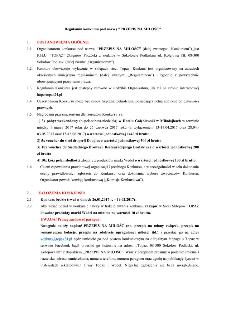 Regulamin konkursu pod nazwą "PRZEPIS NA MIŁOŚĆ" 1. POSTANOWIENIA OGÓLNE: 1.1. Organizatorem konkursu pod nazwą "PRZEPIS NA MIŁOŚĆ” (dalej zwanego: „Konkursem”) jest P.H.U. ”TOPAZ” Zbigniew Paczóski z siedzibą w Sokołowie Podlaskim ul. Kolejowa 8B, 08-300 Sokołów Podlaski (dalej zwana: „Organizatorem”). 1.2. Konkurs obowiązuje wyłącznie w sklepach sieci Topaz. Konkurs jest organizowany na zasadach określonych niniejszym regulaminem (dalej zwanym: „Regulaminem”) i zgodnie z powszechnie obowiązującymi przepisami prawa. 1.3. Regulamin Konkursu jest dostępny zarówno w siedzibie Organizatora, jak też na stronie internetowej http://topaz24.pl 1.4. Uczestnikiem Konkursu może być osoba fizyczna, pełnoletnia, posiadająca pełną zdolność do czynności prawnych. 1.5. Nagrodami przeznaczonymi dla laureatów Konkursu są: 1) 3x pobyt weekendowy (piątek-sobota-niedziela) w Hotelu Gołębiewski w Mikołajkach w terminie między 1 marca 2017 roku do 25 czerwca 2017 roku (z wyłączeniem 13-17.04.2017 oraz 28.04.03.05.2017 oraz 15-18.06.2017) o wartości jednostkowej 1440 zł brutto, 2) 5x voucher do sieci drogerii Douglas o wartości jednostkowej 500 zł brutto 3) 10x voucher do Siedleckiego Browaru Restauracyjnego Brofaktura o wartości jednostkowej 200 zł brutto 4) 10x kosz pełen słodkości złożony z produktów marki Wedel o wartości jednostkowej 100 zł brutto 1.6. Celem zapewnienia prawidłowej organizacji i przebiegu Konkursu, a w szczególności w celu dokonania oceny prawidłowości zgłoszeń do Konkursu oraz dokonania wyboru zwycięzców Konkursu, Organizator powoła komisję konkursową („Komisja Konkursowa”). 2. ZAŁOŻENIA KONKURSU: 2.1. Konkurs będzie trwał w dniach 26.01.2017 r. – 19.02.2017r. 2.2. Aby wziąć udział w konkursie należy w trakcie trwania konkursu zakupić w Sieci Sklepów TOPAZ dowolne produkty marki Wedel na minimalną wartości 10 zł brutto. UWAGA! Proszę zachować paragon! Następnie należy napisać PRZEPIS NA MIŁOŚĆ (np. przepis na udany związek, przepis na romantyczną kolację, przepis na zdobycie upragnionej miłości itd.) i przesłać go na adres [email protected] bądź umieścić go pod postem konkursowym na oficjalnym fanpage’u Topaz w serwisie Facebook bądź przesłać go listownie na adres: „Topaz, 08-300 Sokołów Podlaski, ul. Kolejowa 8b” z dopiskiem „PRZEPIS NA MIŁOŚĆ”. Wraz z przepisem prosimy o podanie: imienia i nazwiska, adresu zamieszkania, numeru telefonu, numeru paragonu oraz zgodę na publikację życzeń w materiałach reklamowych firmy Topaz i Wedel. Niepełne zgłoszenia nie będą uwzględniane. 3. ZASADY PROWADZENIA KONKURSU: 3.1. Organizator zamieści ogłoszenia o Konkursie, o których mowa w pkt 2.1 powyżej, informacje o zasadach Konkursu, nagrodach, oraz ramach czasowych Konkursu. Uczestnicy Konkursu są identyfikowani przez Organizatora na podstawie danych podanych w treści 3.2. wiadomości elektronicznej przesłanej na adres mailowy [email protected] bądź umieścić go pod postem konkursowym na oficjalnym fanpage’u Topaz w serwisie Facebook bądź przesłać go listownie na adres: „Topaz, 08-300 Sokołów Podlaski, ul. Kolejowa 8b” z dopiskiem „PRZEPIS NA MIŁOŚĆ”. Konkurs będzie składał się z jednego etapu. Konkurs polegać będzie na wykonaniu zadania konkursowego opisanego w ogłoszeniu o Konkursie 3.3. oraz przesłanie go na adres poczty elektronicznej [email protected] bądź umieścić go pod postem konkursowym na oficjalnym fanpage’u Topaz w serwisie Facebook bądź przesłać go listownie na adres: „Topaz, 08-300 Sokołów Podlaski, ul. Kolejowa 8b” z dopiskiem „PRZEPIS NA MIŁOŚĆ”. Komisja Konkursowa wybierze najciekawsze i najbardziej pomysłowe przepisy. Nie ma znaczenia kolejność zgłoszeń. 3.4. Wybrani przez Komisję Konkursową zwycięzcy w liczbie 28 osób zostaną poinformowani telefonicznie o wygranej w ciągu 7 dni od zakończenia zbierania zgłoszeń. 3.5. Uczestnik zobowiązany jest do przekazania swoich pełnych danych osobowych zawierających: imię, nazwisko (obowiązkowo), adres zamieszkania (obowiązkowo), numer telefonu kontaktowego (obowiązkowo), adres e-mail (nieobowiązkowo), numer paragonu (obowiązkowo), numer Karty Stałego Klienta Topaz (nieobowiązkowo) i zgodę na publikację życzeń w materiałach reklamowych Topaz i Wedel. 3.6. Nagrody wskazane w pkt. 1.6 zostaną przyznane po spełnieniu warunków określonych w niniejszym Regulaminie w tym warunku, o którym mowa w pkt 4.3 poniżej, jeśli dotyczy. 3.7. Jedna osoba może wziąć udział w Konkursie dowolną ilość razy, jednak może wygrać tylko jedną nagrodę, niezależnie od ilości swoich zgłoszeń. Laureaci będą identyfikowani za pomocą imienia, nazwiska jak i numeru telefonu, na który organizator będzie kontaktował się ze zwycięzcą / zwyciężczynią celem poinformowania o wynikach konkursu. W celu uniknięcia wątpliwości, ta sama osoba posługująca się różnymi adresami / telefonami może być laureatem tylko jednej nagrody. 3.8. Organizator oświadcza, że dane osobowe uczestnika w zakresie: imię i nazwisko, adres zamieszkania, numer telefonu, adres e-mail będą przetwarzane przez Organizatora Konkursu z siedzibą w Sokołowie Podlaski ul. Kolejowa 8 B w celu realizacji umowy przystąpienia do konkursu i jego prawidłowego przeprowadzenia. Gwarantujemy prawo wglądu do swoich danych osobowych oraz ich poprawiania. 4. 4.1. PRZYZNAWANIE NAGRÓD: Laureaci wyłonieni w konkursie zostaną w wyniku realizacji procedury opisanej w punkcie 3 powiadomieni w terminie najpóźniej do dnia 27.02.2017r. 4.2. Laureaci powiadomieni zostaną o wygranej telefonicznie najpóźniej w ciągu 7 dni od daty rozwiązania Konkursu. Warunkiem odbioru nagrody jest okazanie dowodu osobistego oraz paragonu, tj. dowód zakupu w sklepie sieci TOPAZ dowolnie wybranych produktów marki Wedel na minimalną kwotę 10 zł. 4.3. Zgodnie 
