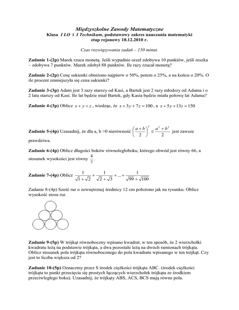 Międzyszkolne Zawody Matematyczne Klasa I LO i I Technikum, podstawowy zakres nauczania matematyki etap rejonowy 18.12.2010 r. Czas rozwiązywania zadań – 150 minut. Zadanie 1-(2p) Marek rzuca monetą. Jeśli wypadnie orzeł zdobywa 10 punktów, jeśli reszka – zdobywa 7 punktów. Marek zdobył 88 punktów. Ile razy rzucał monetą? Zadanie 2-(2p) Cenę sukienki obniżono najpierw o 50%, potem o 25%, a na końcu o 20%. O ile procent zmniejszyła się cena sukienki? Zadanie 3-(3p) Adam jest 3 razy starszy od Kasi, a Bartek jest 2 razy młodszy od Adama i o 2 lata starszy od Kasi. Ile lat będzie miał Bartek, gdy Kasia będzie miała połowę lat Adama? Zadanie 4-(3p) Oblicz x y z , wiedząc, że x 3 y 7 z 100 , a x 5 y 13z 150 a2 b2 ab Zadanie 5-(4p) Uzasadnij, że dla a, b >0 nierówność jest zawsze 2 2 prawdziwa. 2 Zadanie 6-(4p) Oblicz długości boków równoległoboku, którego obwód jest równy 66, a 4 stosunek wysokości jest równy . 7 Zadanie 7-(4p) Oblicz 1 1 2 1 2 3 ... 1 99 100 Zadanie 8-(4p) Sześć rur o zewnętrznej średnicy 12 cm położono jak na rysunku. Oblicz wysokość stosu rur. Zadanie 9-(5p) W trójkąt równoboczny wpisano kwadrat, w ten sposób, że 2 wierzchołki kwadratu leżą na podstawie trójkąta, a dwa pozostałe leżą na dwóch ramionach trójkąta. Oblicz stosunek pola trójkąta równobocznego do pola kwadratu wpisanego w ten trójkąt. Czy jest to liczba większa od 2? Zadanie 10-(5p) Oznaczmy przez S środek ciężkości trójkąta ABC. (środek ciężkości trójkąta to punkt przecięcia się prostych łączących wierzchołek trójkąta ze środkiem przeciwległego boku). Uzasadnij, że trójkąty ABS, ACS, BCS mają równe pola. Propozycja punktowania zadań dla klas I LO i I Technikum z podstawowym programem nauczania matematyki na etapie rejonowym Międzyszkolnych Zawodów Matematycznych (2010/2011). Nr zadania 1 2 3 4 5 czynność Oznaczenia: x- liczba orłów, y- liczba reszek i ułożenie równania 10x+7y=88 Zapisanie, że szukane rozwiązanie jest liczbą naturalną dodatnią Znalezienie jedynego rozwiązania spełniającego warunki zadania: x=6,y=4 i odpowiedź 10 rzutów Zapisanie ceny sukienki po obniżkach x=50%*75%*80% ceny początkowej lub obliczenie z proporcji : 25% z 50% to 12,5%, a 20% z 37,5 % to 7,5% Wyliczenie wyniku i podanie odpowiedzi: cenę obniżono o 70% Obliczenie wieku Kasi (4 lata), Bartka (6 lat) i Adama (12 lat) Obliczenie, że za 4 lata Adam będzie 2 razy starszy od Kasi Obliczenie wieku Bartka za 4 lata – 10 lat Odjęcie stronami danych równań i uzyskanie wyniku 2y+6z=50 Odjęcie stronami pierwszego z danych równań i równania 2y+6z=50 oraz otrzymanie wyniku x+y+z=50 Przekształcenie nierówności do postaci a 2 2ab b 2 0 ( lub obliczenie różnicy punkty 1 0,5 0,5 1 1 1 1 1 1 2 2 a2 b2 a b 1 2 1 1 2 a ab b ) 2 4 2 4 2 2 6 7 Skorzystanie ze wzoru skróconego mnożenia i uzasadnienie odpowiedzi Wykonanie rysunku, oznaczenie boków np. a,b oraz wysokości np. 4x, 7x Wykorzystanie wzoru na pole równoległoboku do uzasadnienia, że a/b=4/7 Wykorzystanie powyższej proporcji oraz wzoru na obwód równoległoboku do obliczenia długości boków 12, 21 Usunięcie niewymierności z mianowników do postaci 2 1,5 1 1,5 2 1 2 2 3 ... 99 99 100 8 Zredukowanie wyrazów i obliczenie wyniku 9 Zauważenie, że środki okręgów wyznaczają trójkąt równoboczny o boku 24 Obliczenie wysokości trójkąta z poprzedniego punktu 9 12 3 Obliczenie wysokości stosu 12 3 12 Wykonanie rysunku ze wszystkimi oznaczeniami, np. a - bok trójkąta, b – bok kwadratu a 3 a 3 b 2 Zapisanie proporcji z podobieństwa trójkątów 2 b a a 2 3 Znalezienie stosunku a/b z powyższej proporcji b 3 a2 3 2 3 12 7 3 a 4 Obliczenie stosunku pól i sprawdzenie, że jest on 2 12 b b 4 10 większy od 2 Wykonanie rysunku ze wszystkimi oznaczeniami Oznaczenie np. D-środek boku BC i uzasadnienie, że trójkąty ADB i DCA mają równe pola Uzasadnienie, że trójkąty BDS i DCS mają równe pola oraz wykorzystanie 2 ostatnich faktów do stwierdzenia, że pola trójkątów ABS i SCA są równe Przeprowadzenie analogicznego rozumowania do stwierdzenia równości pól innej pary trójkątów np. ACS i SCB oraz uzasadnienie tezy 2 2 1 1 0,5 1 1,5 2 1 1 1 2 Za poprawnie rozwiązane zadania metodą inną aniżeli opisana w schemacie punktowania należy przyznać maksymalną liczbę punktów. Jeżeli uczeń rozwiązał zadanie inną metodą i popełnił błędy to należy określić i ocenić czynności równoważne do wymienionych w schemacie. Można przyznawać połówki punktów.