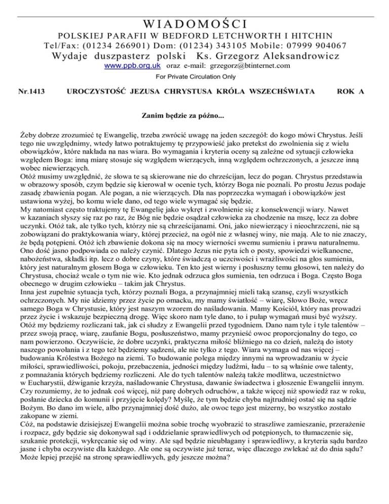 WIADOMOŚCI POLSKIEJ PARAFII W BEDFORD LETCHWORTH I HITCHIN Tel/Fax: (01234 266901) Dom: (01234) 343105 Mobile: 07999 904067 Wydaje duszpasterz polski Ks. Grzegorz Aleksandrowicz www.ppb.org.uk oraz e-mail: [email protected] For Private Circulation Only Nr.1413 UROCZYSTOŚĆ JEZUSA CHRYSTUSA KRÓLA WSZECHŚWIATA ROK A Zanim będzie za późno... Żeby dobrze zrozumieć tę Ewangelię, trzeba zwrócić uwagę na jeden szczegół: do kogo mówi Chrystus. Jeśli tego nie uwzględnimy, wtedy łatwo potraktujemy tę przypowieść jako pretekst do zwolnienia się z wielu obowiązków, które nakłada na nas wiara. Bo wymagania i kryteria oceny są zależne od sytuacji człowieka względem Boga: inną miarę stosuje się względem wierzących, inną względem ochrzczonych, a jeszcze inną wobec niewierzących. Otóż musimy uwzględnić, że słowa te są skierowane nie do chrześcijan, lecz do pogan. Chrystus przedstawia w obrazowy sposób, czym będzie się kierował w ocenie tych, którzy Boga nie poznali. Po prostu Jezus podaje zasadę zbawienia pogan. Ale pogan, a nie wierzących. Dla nas poprzeczka wymagań i obowiązków jest ustawiona wyżej, bo komu wiele dano, od tego wiele wymagać się będzie. My natomiast często traktujemy tę Ewangelię jako wykręt i zwolnienie się z konsekwencji wiary. Nawet w kazaniach słyszy się raz po raz, że Bóg nie będzie osądzał człowieka za chodzenie na mszę, lecz za dobre uczynki. Otóż tak, ale tylko tych, którzy nie są chrześcijanami. Oni, jako niewierzący i nieochrzczeni, nie są zobowiązani do praktykowania wiary, której przecież, na ogół nie z własnej winy, nie mają. Ale to nie znaczy, że będą potępieni. Otóż ich zbawienie dokona się na mocy wierności swemu sumieniu i prawu naturalnemu. Ono dość jasno podpowiada co należy czynić. Dlatego Jezus nie pyta ich o posty, spowiedzi wielkanocne, nabożeństwa, składki itp. lecz o dobre czyny, które świadczą o uczciwości i wrażliwości na głos sumienia, który jest naturalnym głosem Boga w człowieku. Ten kto jest wierny i posłuszny temu głosowi, ten należy do Chrystusa, chociaż wcale o tym nie wie. Kto jednak odrzuca głos sumienia, ten odrzuca i Boga. Często Boga obecnego w drugim człowieku – takim jak Chrystus. Inna jest zupełnie sytuacja tych, którzy poznali Boga, a przynajmniej mieli taką szansę, czyli wszystkich ochrzczonych. My nie idziemy przez życie po omacku, my mamy światłość – wiarę, Słowo Boże, wręcz samego Boga w Chrystusie, który jest naszym wzorem do naśladowania. Mamy Kościół, który nas prowadzi przez życie i wskazuje bezpieczną drogę. Więc skoro nam tyle dano, to i pułap wymagań musi być wyższy. Otóż my będziemy rozliczani tak, jak ci słudzy z Ewangelii przed tygodniem. Dano nam tyle i tyle talentów – przez swoją pracę, wiarę, zaufanie Bogu, posłuszeństwo, mamy przynieść owoc proporcjonalny do tego, co nam powierzono. Oczywiście, że dobre uczynki, praktyczna miłość bliźniego na co dzień, należą do istoty naszego powołania i z tego też będziemy sądzeni, ale nie tylko z tego. Wiara wymaga od nas więcej – budowania Królestwa Bożego na ziemi. To budowanie polega między innymi na wprowadzaniu w życie miłości, sprawiedliwości, pokoju, przebaczenia, jedności między ludźmi, ładu – to są właśnie owe talenty, z pomnażania których będziemy rozliczeni. Ale do tych talentów należą także modlitwa, uczestnictwo w Eucharystii, dźwiganie krzyża, naśladowanie Chrystusa, dawanie świadectwa i głoszenie Ewangelii innym. Czy rozumiemy, że to jednak coś więcej, niż parę dobrych odruchów, a także więcej niż spowiedź raz w roku, posłanie dziecka do komunii i przyjęcie kolędy? Myślę, że tym będzie chyba najtrudniej ostać się na sądzie Bożym. Bo dano im wiele, albo przynajmniej dość dużo, ale owoc tego jest mizerny, bo wszystko zostało zakopane w ziemi. Cóż, na podstawie dzisiejszej Ewangelii można sobie trochę wyobrazić to straszliwe zamieszanie, przerażenie i rozpacz, gdy będzie się dokonywał sąd i oddzielanie sprawiedliwych od potępionych, to tłumaczenie się, szukanie protekcji, wykręcanie się od winy. Ale sąd będzie nieubłagany i sprawiedliwy, a kryteria sądu bardzo jasne i chyba oczywiste dla każdego. Ale one są oczywiste już teraz, więc dlaczego zwlekać aż do dnia sądu? Może lepiej przejść na stronę sprawiedliwych, gdy jeszcze można? MSZE ŚWIĘTE I NABOŻEŃSTWA w BEDFORD: Charity Reg.No.1119423 Niedziela,23.11.2014 UROCZYSTOŚĆ JEZUSA CHRYSTUSA KRÓLA WSZECHŚWIATARok A Godz. 9.30 - za dusze ś.p. rodziców Józefa i Stefanii Betley - int. syna. Godz.11.00 - za dusze ś.p. dziadka Michała w 1-szą rocznicę śmierci - int. wnuczki. Godz.19.00 - za dusze ś.p. Joanny Boruckiej w 1-szą rocznicę śmierci - int. męża z rodziną. Poniedziałek, 24.11. Godz. 9.30 - za dusze ś.p. księży: Mleczyńskiego, Dobrzańskiego, Durdy i Grudzińskiego Wtorek, 25.11.2014 Godz. 9.30 - Intencja wolna. Środa, 26.11.2014 Godz 19.00 - za dusze ś.p. artystów - int. rodziny. Czwartek,27.11.2014 Godz. 9.30 - za dusze ś.p.Krystyny Kulesz - int. rodziny Szyszko. Piątek, 28.11.2014 Godz.15.00 - Intencja wolna. KORONKA DO MIŁOSIERDZIA BOŻEGO. Sobota, 29.11.2014 Godz. 9.30 - O błogosławieństwo Boże i zdrowie dla mamy i jej rodziny - int. córek. Godz.19.00 - Intencja wolna. Niedziela,30.11.2014 PIERWSZA NIEDZIELA ADWENTU Rok B Godz. 9.30 - Intencja wolna. Godz.11.00 18.00 - za ś.p. rodziców Ireny i Franciszka oraz ś.p. Leonarda – int. syna z rodziną. Godz.19.00 - za dusze ś.p. Wandy Ziemian - int. syna. Poniedziałek,1.12.14 Godz. DZIEŃ 9.30 - Intencja wolna. Wtorek, 2. 12. 2014 Godz. 9.30 - Mszy świętej w tym dniu nie będzie. Środa, 3. 12. 2014 Godz.19.00 - Intencja wolna. Czwartek,4. 12.2014 Godz. 9.30 - Intencja wolna. - PIERWSZY PIĄTEK miesiąca GRUDNIA Piątek, 5. 12.2014 Godz.15.00 - Intencja wolna. KORONKA DO