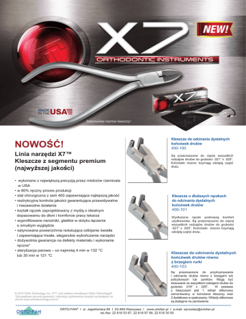TM Rzeczywisty rozmiar kleszczy* NOWOŚĆ! Kleszcze do odcinania dystalnych końcówek drutów 400-100 Linia narzędzi X7™ Kleszcze z segmentu premium (najwyższej jakości) Są przeznaczone do cięcia wszystkich rodzajów drutów do grubości .021” x .025”. Końcówki mocno trzymają odciętą część drutu. • wykonane z największą precyzją przez mistrzów rzemiosła w USA • w 80% ręczny proces produkcji • stal chirurgiczna z serii 400 zapewniająca najlepszą jakość • restrykcyjna kontrola jakości gwarantująca przewidywalne i niezawodne działanie • kształt rączek zaprojektowany z myślą o idealnym dopasowaniu do dłoni i komforcie pracy lekarza • wyprofilowane narożniki, gładkie w dotyku łączenia o smukłym wyglądzie • satynowana powierzchnia redukująca odbijanie światła i zapewniająca trwałe, eleganckie wykończenie narzędzi • dożywotnia gwarancja na defekty materiału i wykonanie ręczne* • sterylizacja parowa – co najmniej 4 min w 132 °C lub 30 min w 121 °C © 2014 Ortho Technology, Inc. X7™ jest znakiem handlowym Ortho Technology®. *Szczegółowe warunki gwarancji i instrukcja użytkowania narzędzi są dostępne na stronie www.orthotechnology.com/x7. Kleszcze o dłuższych rączkach do odcinania dystalnych końcówek drutów 400-101 Wydłużone rączki podnoszą komfort użytkownika. Są przeznaczone do cięcia wszystkich rodzajów drutów do grubości .021” x .025”. Końcówki mocno trzymają odciętą część drutu. Kleszcze do odcinania dystalnych końcówek drutów równo z brzegiem rurki 400-103 Są przeznaczone do przytrzymywania i odcinania drutów równo z brzegami tub policzkowych lub zamków. Mogą być stosowane ze wszystkimi rodzajami drutów do grubości .019” x .025”. W zestawie z kleszczami jest 1 wkład silikonowy zamontowany w końcówce kleszczy oraz 2 dodatkowe w opakowaniu. Wkłady silikonowe są dostępne na zamówienie. ORTO-FAN® I ul. Jagiellońska 66 I 03-468 Warszawa I www.ortofan.pl I e-mail: [email protected] tel./fax: 22 818 53 87, 22 818 97 99, 22 618 30 50 Kleszcze mikro do cięcia ligatur z 15o offsetem 400-108 Kleszcze mikro 400-099 Wyposażone w zwężane końcówki kleszcze przeznaczone są do cięcia miękkich drutów ligaturowych do grubości .012”. Smukłe, krótkie, wyprofilowane końcówki z 15° offsetem umożliwiają łatwy dostęp do trudnych obszarów. Długość krawędzi powierzchni tnącej wynosi .039” (9,87 mm). Widok z boku Widok z boku Kleszcze uniwersalne 400-106 Kleszcze mikro do cięcia drutu ligaturowego 400-104 Widok z boku Są przeznaczone do cięcia miękkich drutów ligaturowych do grubości .012”. Bardzo smukły profil i zaostrzone, zwężane końcówki dają dostęp do najtrudniejszych obszarów. Długość krawędzi powierzchni tnącej wynosi .050” (12,67 mm). Są przeznaczone do cięcia miękkich drutów do grubości .012”. Offset 15° oraz bardzo pracę umożliwiają profil smukły w najtrudniejszych obszarach. Długość krawędzi powierzchni tnącej wynosi .054” (13,72 mm). Służą do cięcia miękkich drutów i drutów ligaturowych do grubości .015”. Długość krawędzi powierzchni tnącej wynosi .050” (12,67 mm). Widok z boku Kleszcze do cięcia twardego drutu 400-107 Kleszcze do cięcia drutu ligaturowego 400-105 Służą do cięcia twardego drutu do grubości .021” x .025”. Długość krawędzi powierzchni tnącej wynosi .046” (11,70 mm). Są przeznaczone do cięcia cienkiego drutu ligaturowego do grubości .012”. Smukły profil umożliwia pracę w trudnych obszarach. Długość krawędzi powierzchni tnącej wynosi .050” (12,67 mm). Widok z boku Widok z boku Kleszcze zwężane „ptasie dzioby” 400-109 Kleszcze „ptasie dzioby” do cięcia 400-111 Są przeznaczone do doginania gładko różnorodnych pętli na drutach do grubości .021” x .025”. Są przeznaczone do formowania różnej wielkości pętelek i dodatkowo wyposażone w ostrą powierzchnię tnącą druty do grubości .021” x .025”. Kleszcze „ptasie dzioby” 400-110 Wyżłobione kleszcze „ptasie dzioby” 400-130 Służą do doginania pętli z drutów okrągłych do grubości .030”. Wyposażone w wydłużone końcówki, służą do formowania pętelek na cienkich drutach do grubości .020”. Wyżłobienie umożliwia łatwe umieszczanie i powielanie pętelek. ORTO-FAN® I ul. Jagiellońska 66 I 03-468 Warszawa I www.ortofan.pl I e-mail: [email protected] tel./fax: 22 818 53 87, 22 818 97 99, 22 618 30 50 Kleszcze „ptasie dzioby” do cienkiego drutu 400-136 Kleszcze o dłuższych rączkach do zdejmowania pierścieni 400-120 Wyposażone w wydłużone końcówki, są przeznaczone do formowania pętelek na cienkich drutach do grubości .020”. Zostały zaprojektowane z myślą o wygodzie użytkownika. Dzięki odpowiedniemu ułożeniu końcówki i podkładki po stronie zgryzowej zdejmowanie pierścieni jest wyjątkowo łatwe. Do końcówki kleszczy przytwierdzona jest podkładka 3/16”, w zestawie jest również dodatkowa podkładka 1/4” do celów próbnych. Dodatkowe podkładki są dostępne na zamówienie. Małe kleszcze Weingarta 400-114 Zakrzywione kleszcze do zdejmowania zamków 400-122 Wyposażone w smukłe, zwężane pod kątem 20°, ząbkowane końcówki kleszcze są bardzo wszechstronne. Umożliwiają łatwy dostęp i pewne trzymanie drutów i materiałów pomocniczych. Standardowe kleszcze Howa 400-115 Wyposażone w ząbkowane końcówki gwarantują precyzyjne zakładanie i zdejmowanie łuków i elementów pomocniczych. Kleszcze do formowania łuków krawężnych 400-116 Są przeznaczone do wykonywania pierwszo-, drugo- i trzeciorzędowych zagięć na drutach okrągłych do grubości .070" i krawężnych do grubości .021" x .025". Kleszcze do formowania łuków językowych 400-132 Zaprojektowane aby wykonywać podwójne i potrójne zagięcia na łukach lingwalnych o grubości od .030” do .036”. Dla komfortu użytkownika wyposa