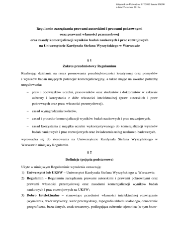 Załącznik do Uchwały nr 117/2013 Senatu UKSW z dnia 27 czerwca 2013 r. Regulamin zarządzania prawami autorskimi i prawami pokrewnymi oraz prawami własności przemysłowej oraz zasady komercjalizacji wyników badań naukowych i prac rozwojowych na Uniwersytecie Kardynała Stefana Wyszyńskiego w Warszawie §1 Zakres przedmiotowy Regulaminu Realizując działania na rzecz promowania przedsiębiorczości kreatywnej oraz pomysłów i wyników badań mających potencjał komercjalizacyjny, a także mając na uwadze potrzebę uregulowania: − praw i obowiązków uczelni, pracowników oraz studentów i doktorantów w zakresie ochrony i korzystania z dóbr własności intelektualnej (praw autorskich i praw pokrewnych oraz praw własności przemysłowej), − zasad wynagradzania twórców, − zasad i procedur komercjalizacji wyników badań naukowych i prac rozwojowych, − zasad korzystania z majątku uczelni wykorzystywanego do komercjalizacji wyników badań naukowych i prac rozwojowych oraz świadczenia usług naukowo-badawczych, wprowadza się do stosowania na Uniwersytecie Kardynała Stefana Wyszyńskiego w Warszawie niniejszy Regulamin. §2 Definicje (pojęcia podstawowe) Użyte w niniejszym Regulaminie wyrażenia oznaczają: 1) Uniwersytet lub UKSW – Uniwersytet Kardynała Stefana Wyszyńskiego w Warszawie; 2) Regulamin – Regulamin zarządzania prawami autorskimi i prawami pokrewnymi oraz prawami własności przemysłowej oraz zasadami komercjalizacji wyników badań naukowych i prac rozwojowych na UKSW; 3) Dobro Intelektualne – stanowiące przedmiot własności intelektualnej rozwiązanie (wynalazek, wzór użytkowy, wzór przemysłowy, topografia układu scalonego, oznaczenie geograficzne, baza danych, znak towarowy, podlegająca ochronie tajemnica (w tym know- how, tajemnica przedsiębiorstwa) lub Utwór bądź przedmiot praw pokrewnych, które podlegają ochronie prawnej na terytorium Rzeczypospolitej Polskiej; 4) Utwór – każdy przejaw działalności twórczej o indywidualnym charakterze, ustalony w jakiejkolwiek postaci, niezależnie od wartości, przeznaczenia i sposobu wyrażenia, w szczególności utwór: − wyrażony słowem, symbolami matematycznymi, znakami graficznymi m.in.: o literacki, o publicystyczny, o naukowy: artykuł, książka, o dydaktyczny: skrypt, podręcznik, test, bateria testów, o praca dyplomowa, praca doktorska, o wystąpienie, odczyt, wykład, o kartograficzny, o program komputerowy, − plastyczny, − fotograficzny, − lutniczy, − wzornictwa przemysłowego, − architektoniczny, architektoniczno-urbanistyczny i urbanistyczny, − muzyczny i słowno-muzyczny, − sceniczny, sceniczno-muzyczny, choreograficzny i pantomimiczny, audiowizualny (w tym filmowy); 5) Twórca – osoba, która jest autorem lub współautorem Dobra Intelektualnego, do której na podstawie Regulaminu lub umowy z Uniwersytetem albo przepisów powszechnie obowiązującego prawa Regulamin ma zastosowanie; 6) Pełnomocnik – Pełnomocnik Uniwersytetu ds. ochrony i komercjalizacji własności intelektualnej Uniwersytetu; 7) Pracownik – osoba pozostająca w stosunku pracy z UKSW, w tym także na podstawie powołania, wyboru lub mianowania, lub osoba, która zawarła z Uniwersytetem umowę o wykonanie usług lub stworzenie Dobra Intelektualnego, w szczególności umowę o dzieło lub umowę zlecenia; 8) Student – student studiów prowadzonych przez Uniwersytet (pierwszego lub drugiego stopnia) oraz słuchacz studiów podyplomowych; 9) Doktorant – słuchacz studiów trzeciego stopnia (studiów doktoranckich) prowadzonych przez Uniwersytet; 10) Pomoc Uniwersytetu – każde udzielone przez UKSW wsparcie, a w szczególności finansowe, organizacyjne, techniczne lub lokalowe, wspomagające powstanie Dobra Intelektualnego. §3 Zakres Regulaminu 1. Zasady określone w Regulaminie mają zastosowanie wobec Pracowników oraz Studentów i Doktorantów Uniwersytetu. Postanowienia Regulaminu stosuje się do wszelkich umów zawieranych między Uniwersytetem a wskazanymi osobami, jeśli przedmiotem takich umów są Dobra Intelektualne. Postanowienia Regulaminu stosuje się również do umów z innymi podmiotami, o ile umowa z danym podmiotem tak stanowi. 2. Regulamin dotyczy Dóbr Intelektualnych powstałych w wyniku pracy naukowej, dydaktycznej, badawczej lub rozwojowej prowadzonej na Uniwersytecie, lub na jego zlecenie. 3. Zasady określone w Regulaminie stosuje się również do Dóbr Intelektualnych, co do których prawa przysługują Uniwersytetowi na podstawie innych tytułów. 4. W razie wątpliwości, czy dane Dobro Intelektualne zostało stworzone w ramach wykonywania obowiązków ze stosunku pracy lub w okolicznościach wskazanych w ust. 2, rozstrzyga Pełnomocnik. §4 Prawa do Dóbr Intelektualnych, zasady dotyczące publikacji utworów oraz zachowania poufności 1. Prawa majątkowe do Dobra Intelektualnego, którego Twórcą jest Pracownik, a Dobro intelektualne powstało w ramach wykonywania obowiązków, o których mowa w §3 ust. 2 Regulaminu przysługują, z zastrzeżeniem §7 ust. 3, Uniwersytetowi. Nabycie praw przez Uniwersytet następuje z chwilą ustalenia Dobra Intelektualnego i nie wymaga jego przyjęcia przez Uniwersytet – w zakresie, w jakim dopuszczają to przepisy prawa. 2. Zakres nabycia praw, o którym mowa w ust. 1, obejmuje obszar całego świata i wszystkie formy korzystania z nich, a w szczególności: a) co do Utworów: wszystkie znane w chwili ustalenia Utworu pola eksploatacji, a w szczególności: w zakresie utrwalania i zwielokrotniania Utworu – wytwarzanie określoną techniką egzemplarzy Utworu, w tym techniką drukarską, reprograficzną, zapisu magnetycznego oraz techniką cyfrową; w zakresie obrotu oryginałem albo egzemplarzami, na których Utwór utrwalono – wprowadzanie do obrotu, użyczenie lub najem oryginału albo egzemplarzy; publiczne wykonanie, wystawienie, wyświetlenie, odtworzenie oraz nadawanie i reemitowanie, a ta