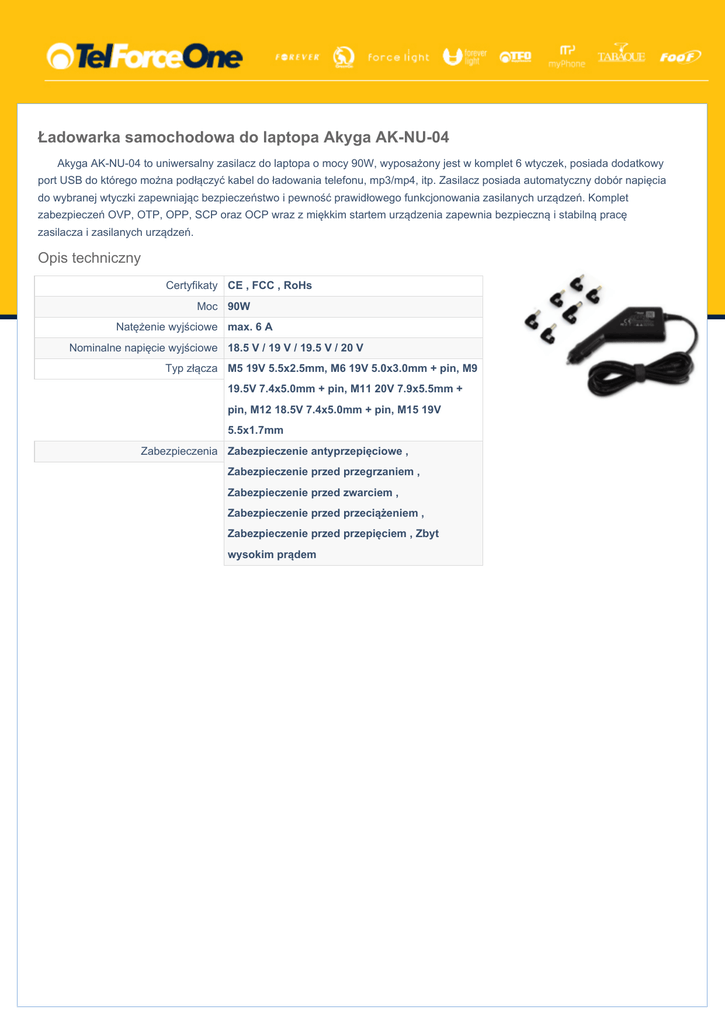 Ładowarka samochodowa do laptopa Akyga AK-NU-04 Akyga AK-NU-04 to uniwersalny zasilacz do laptopa o mocy 90W, wyposażony jest w komplet 6 wtyczek, posiada dodatkowy port USB do którego można podłączyć kabel do ładowania telefonu, mp3/mp4, itp. Zasilacz posiada automatyczny dobór napięcia do wybranej wtyczki zapewniając bezpieczeństwo i pewność prawidłowego funkcjonowania zasilanych urządzeń. Komplet zabezpieczeń OVP, OTP, OPP, SCP oraz OCP wraz z miękkim startem urządzenia zapewnia bezpieczną i stabilną pracę zasilacza i zasilanych urządzeń. Opis techniczny Certyfikaty CE , FCC , RoHs Moc 90W Natężenie wyjściowe max. 6 A Nominalne napięcie wyjściowe 18.5 V / 19 V / 19.5 V / 20 V Typ złącza M5 19V 5.5x2.5mm, M6 19V 5.0x3.0mm + pin, M9 19.5V 7.4x5.0mm + pin, M11 20V 7.9x5.5mm + pin, M12 18.5V 7.4x5.0mm + pin, M15 19V 5.5x1.7mm Zabezpieczenia Zabezpieczenie antyprzepięciowe , Zabezpieczenie przed przegrzaniem , Zabezpieczenie przed zwarciem , Zabezpieczenie przed przeciążeniem , Zabezpieczenie przed przepięciem , Zbyt wysokim prądem