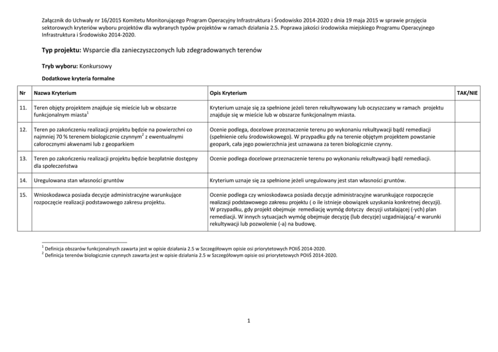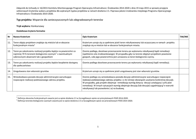 Załącznik do Uchwały nr 16/2015 Komitetu Monitorującego Program Operacyjny Infrastruktura i Środowisko 2014‐2020 z dnia 19 maja 2015 w sprawie przyjęcia sektorowych kryteriów wyboru projektów dla wybranych typów projektów w ramach działania 2.5. Poprawa jakości środowiska miejskiego Programu Operacyjnego Infrastruktura i Środowisko 2014‐2020. Typ projektu: Wsparcie dla zanieczyszczonych lub zdegradowanych terenów Tryb wyboru: Konkursowy Dodatkowe kryteria formalne Nr Nazwa Kryterium Opis Kryterium TAK/NIE 11. Teren objęty projektem znajduje się mieście lub w obszarze funkcjonalnym miasta1 Kryterium uznaje się za spełnione jeżeli teren rekultywowany lub oczyszczany w ramach projektu znajduje się w mieście lub w obszarze funkcjonalnym miasta. 12. Teren po zakończeniu realizacji projektu będzie na powierzchni co najmniej 70 % terenem biologicznie czynnym2 z ewentualnymi całorocznymi akwenami lub z geoparkiem Ocenie podlega, docelowe przeznaczenie terenu po wykonaniu rekultywacji bądź remediacji (spełnienie celu środowiskowego). W przypadku gdy na terenie objętym projektem powstanie geopark, cała jego powierzchnia jest uznawana za teren biologicznie czynny. 13. Teren po zakończeniu realizacji projektu będzie bezpłatnie dostępny dla społeczeństwa Ocenie podlega docelowe przeznaczenie terenu po wykonaniu rekultywacji bądź remediacji. 14. Uregulowana stan własności gruntów Kryterium uznaje się za spełnione jeżeli uregulowany jest stan własności gruntów. 15. Wnioskodawca posiada decyzje administracyjne warunkujące rozpoczęcie realizacji podstawowego zakresu projektu. Ocenie podlega czy wnioskodawca posiada decyzje administracyjne warunkujące rozpoczęcie realizacji podstawowego zakresu projektu ( o ile istnieje obowiązek uzyskania konkretnej decyzji). W przypadku, gdy projekt obejmuje remediację wymóg dotyczy decyzji ustalającej (‐ych) plan remediacji. W innych sytuacjach wymóg obejmuje decyzję (lub decyzje) uzgadniającą/‐e warunki rekultywacji lub pozwolenie (‐a) na budowę. 1 2 Definicja obszarów funkcjonalnych zawarta jest w opisie działania 2.5 w Szczegółowym opisie osi priorytetowych POIiŚ 2014‐2020. Definicja terenów biologicznie czynnych zawarta jest w opisie działania 2.5 w Szczegółowym opisie osi priorytetowych POIiŚ 2014‐2020. 1 Kryteria merytoryczne I stopnia Nr Kryteria Opis kryterium Zasady oceny kryterium 1. Powierzchnia terenu objętego projektem Ocenie podlega wielkość powierzchni objętej rekultywacją/remediacją. 7 pkt ≥ 15 ha; Waga Max. punktacja 6 pkt ≥ 12 ha i < 15 ha; 5 pkt ≥ 9 ha i < 12 ha; 4 pkt ≥ 6 ha i < 9 ha; 2 14 1 12 1 6 3 pkt ≥ 3 ha i < 6 ha; 2 pkt ≥ 1 ha i < 3 ha; 0 pkt < 1ha. 2. Rodzaj substancji powodującej zanieczyszczenie terenu Przyznana liczba punktów zależy od rodzaju/‐ów substancji zanieczyszczającej teren objęty projektem. W przypadku występowania zanieczyszczenia więcej niż jednym rodzajem substancji projekt otrzymuje więcej punktów. Występowanie zagrożenia dla zdrowia ludzi lub stanu środowiska Substancja zanieczyszczająca teren objęty projektem: 2 pkt – metale; 2 pkt – związki nieorganiczne inne niż metale; Rodzaje substancji powodujące zanieczyszczenia ziemi określone są w rozporządzeniu Ministra Środowiska wydanym na podstawie art. 101a ust. 5 ustawy z dnia 27 kwietnia 2001 r. – Prawo ochrony środowiska (do czasu wydania przedmiotowego rozporządzenia – w utrzymanym czasowo w mocy rozporządzeniu Ministra Środowiska3 wydanym na podstawie art. 105 ust. 1 tej ustawy). 3. Przyznane punkty w ramach kryterium sumują się (max. 12 pkt). Ocenie podlega stopień zagrożenia, jaki dla zdrowia ludzi lub stanu środowiska stanowi degradacja terenu planowanego do rekultywacji lub remediacji. 2 pkt – węglowodory; 2 pkt – węglowodory chlorowane; 2 pkt – środki ochrony roślin; 2 pkt – inne. Przyznane punkty w ramach kryterium sumują się (max. 6 pkt). 2 pkt – charakter zanieczyszczenia i warunki gruntowo‐wodne wpływają na możliwość rozprzestrzeniania się zanieczyszczenia; 2 pkt – na terenie zdegradowanym lub w jego bezpośrednim sąsiedztwie (działka bezpośrednio granicząca z działką objętą projektem) znajdują się ujęcia wody, budynki mieszkalne, ogrody, place zabaw, tereny sportowe, szpitale, przychodnie, szkoły; 2 pkt – na terenie zdegradowanym lub w bezpośrednim sąsiedztwie 3 Rozporządzenie Ministra Środowiska z dnia 9 września 2002 r. w sprawie standardów jakości ziemi (Dz. U. z 2002 r, Nr 165, poz. 1359). 2 (działka bezpośrednio granicząca z działką objętą projektem) występują formy ochrony przyrody. 4. Przygotowanie projektu – gotowość do realizacji inwestycji Przyznane punkty w ramach podkryteriów a) – b) sumują się (max. 10 pkt). a) przygotowanie instytucjonalne do wdrażania – powołanie jednostki realizującej projekt; a) powołanie jednostki realizującej projekt b) wartość kontraktów posiadających dokumentację przetargową w stosunku do całkowitej wartości projektu4; 4 pkt – tak; b) zaokrąglając do pełnego procenta: 1 10 1 4 1 1 1 1 6 pkt – 86 – 100 %; 4 pkt – 71 – 85 %; 3 pkt – 56 – 70 %; 2 pkt – 40 – 55 %; 5. 6. 7 Zgodność projektu z lokalnym programem ochrony środowiska i miejscowym planem zagospodarowania przestrzennego W ramach kryterium oceniane będzie, czy projekt wynika z programu ochrony środowiska i jest zgodny z miejscowym planem zagospodarowania przestrzennego. Projekt jest zgodny z lokalnym programem rewitalizacji5 Projekt stanowi element spójnej koncepcji inwestycyjnej zmierzającej do kompleksowej rewitalizacji obszaru wyznaczonego w lokalnym programie rewitalizacji zgodnie z wytycznymi Ministra Infrastruktury i Rozwoju w zakresie rewitalizacji obszarów zdegradowanych Ponadregionalność projektu 6 Zakres projektu jest zgodny z przyjętą przez Radę Ministrów strategią ponadregionalną oraz jest to przedsi