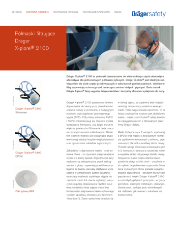 DETEKCJA OCHRONA OSOBISTA TECHNOLOGIE NURKOWE TECHNOLOGIE SYSTEMOWE USŁUGI ST-8869-2005 Półmaski filtrujące Dräger X-plore® 2100 ST-1762-2005 Dräger X-plore® 2100 to półmaski przeznaczone do wielokrotnego użycia stanowiące alternatywę dla jednorazowych półmasek pyłowych. Dräger X-plore® jest idealnym rozwiązaniem dla osób często przebywających w zakurzonych pomieszczeniach. Wymienne filtry zapewniają ochroną przed zanieczyszczeniami stałymi i płynnymi. Seria masek Dräger X-plore® łączy wygodę, bezpieczeństwo i korzystny stosunek wydajności do ceny. ST-1114-2006 Dräger X-plore® 2100 Silikonowa ST-398-2003 Dräger X-plore® 2100 EPDM Filtr pyłowy 882 Dräger X-plore® 2100 gwarantuje świetne dopasowanie do twarzy przy przenikalności znacznie niższej w porównaniu z tradycyjnymi maskami przeciwpyłowmi jednorazowego użycia (FFP). Filtry klasy ochronnej FMP2 i FMP3 charakteryzują się znacznie wyższą wydajnością filtrowania, zaś dzięki znacznie większej powierzchni filtrowania także znacznie niższymi oporami oddechowymi. Dzięki tym cechom możliwe jest osiągnięcie długoterminowej redukcji kosztów eksploatacyjnych oraz ograniczenie nakładów logistycznych. Zakładanie i zdejmowanie masek - oraz wymiana filtrów - to czynności przeprowadzane szybko i w prosty sposób. Ergonomiczne pasy nagłowne są zabezpieczone przed ześlizgnięciem z głowy i zapewniają prawidłowe przyleganie do twarzy, zaś pasy elastyczne wyposażone w zintegrowany system spustowy oznaczają możliwość szybkiego zdjęcia lub założenia maski lub równie szybkiej i precyzyjnej regulacji dopasowania. System spustowy umożliwia także zdjęcie maski bez konieczności zdejmowania kasku ochronnego (system spustowy określany jest terminem "drop-down"). Zawór wydechowy znajduje się w dolnej części, co zapewnia brak wilgoci i redukcję temperatury powietrza wewnątrz maski. Niska waga pozwala zapomnieć, iż na twarzy użytkownika noszona jest jakakolwiek maska - maski z serii X-plore® należą bowiem do najwygodniejszych z oferowanych przez firmę Dräger Safety. Maski dostępne są w 2 wersjach: wykonanej z EPDM oraz masek o zwiększonym komforcie użytkowym wykonanych z silikonu, przeznaczonych dla osób o wrażliwej skórze twarzy. Ponadto wersja silikonowa produkowana jest w 2 rozmiarach: oznacza to szczelność nawet w wypadku bardzo nietypowego kształtu twarzy. Oczywiście maski można zdemontawać i powtórnie złożyć w kilka chwil - umożliwia to ich szybkie, bezproblemowe oczyszczanie. Niska cena wymiennych filtrów pozwala osiągnąć znaczne oszczędności - dowodem tej tezy jest popularność masek Dräger X-plore® 2100 w rozmaitych gałęziach przemysłu - w tym w górnictwie, przemyśle metalowym, drzewnym, chemicznym, podczas prac remontowych lub rozbiórek, jak również i rolnictwie lub budownictwie. DANE TECHNICZNE Tworzywo korpusu: Silikon (niebieskie) lub EPDM (czarne) Rozmiary: Dräger X-plore® 2100 Silikon: mały/średni (s/m) i średni/duży (m/l) Typ mocowania: Szybkozłącze dla filtrów pyłowych firmy Dräger typu 882 Dräger X-plore® 2100 EPDM: rozmiar uniwersalny Waga: Około 110 g Pasy nagłowne: Tekstylny pas elastyczny z polipropylenowym systemem mocowania nagłownego, CE (EN 1827), NIOSH, AS/NZS Części zamienne: Dostępne INFORMACJE Z AMÓWIENIOWE Maski Nr katalogowy Dräger X-plore® 2100, EPDM Dräger X-plore® 2100, Silikonowa rozmiar uniwersalny R 55 881 średnia/duża (m/l) R 55 882 mała/średnia (s/m) R 55 883 Filtry Nr katalogowy Filtr pyłowy 882 FMP2 SLD (EN 1827 i EN 143:2000), 25 szt. w opakowaniu 67 37 352 Filtr pyłowy 882 FMP3 SLD (EN 1827 i EN 143:2000), 25 szt. w opakowaniu 67 36 777 Zestawy przeznaczone do użycia w zapylonych miejscach pracy Nr katalogowy Dräger X-plore® 2100, EPDM, rozmiar uniwersalny z 5 szt. filtrów FMP3 SLD R 55 910 Dräger X-plore® 2100, silikownowe, rozmiar m/l z 5 szt. filtrów FMP3 SLD R 55 915 Uniform Sp. z o. o. ul. Redutowa 25, 01-106 Warszawa tel. (22) 836 94 54, faks (22) 213 89 50 www.uniform.pl AUSTRALIA FRANCE SINGAPORE UNITED KINGDOM Draeger Safety Pacific Pty. Ltd. Axxess Corporate Park Mt. Waverley. Vic 3149 Tel +61 3 92 65 50 00 Fax +61 3 92 65 50 95 Dräger Safety France S.A.S. 3c, Route de la Fédération 67025 Strasbourg Cedex Tel +33 388 40 76 76 Fax +33 388 40 76 67 Draeger Safety Asia Pte. Ltd. 67 Ayer Rajah Crescent # 06 03 139950 Singapore Tel +65 68 72 92 88 Fax +65 67 73 20 33 Draeger Safety UK Ltd. Kitty Brewster Industrial Estate Blyth, Northumberland NE24 4RG Tel +44 1670 352 891 Fax +44 1670 356 266 CANADA MEXICO REP. OF SOUTH AFRICA USA Draeger Canada Ltd. 7555 Danbro Crescent Mississauga, Ontario L5N 6P9 Tel +1 905 821 8988 Fax +1 905 821 2565 Draeger Safety S.A. de C.V. Av. Peñuelas No. 5 Querétaro, Qro México Tel +52 442 246 1113 Fax +52 442 246 1114 Dräger South Africa (Pty) Ltd. P.O.Box 68601 Bryanston 2021 Tel +27 11 465 99 59 Fax +27 11 465 69 53 Draeger Safety, Inc. 101 Technology Drive Pittsburgh, PA 15275 Tel +1 412 787 8383 Fax +1 412 787 2207 P. R. CHINA NETHERLANDS SPAIN Beijing Fortune Draeger Safety Equipment Co., Ltd. Beijing 101300 Tel +86 10 80 49 80 00 Fax +86 10 80 49 80 05 Dräger Safety Nederland B.V. Edisonstraat 53 2700 AH Zoetermeer Tel +31 79 344 46 66 Fax +31 79 344 47 90 Draeger Safety Hispania S.A. Calle Xaudaró 5 28034 Madrid Tel +34 91 728 34 00 Fax +34 91 729 48 99 Dräger Safety AG & Co. KGaA Revalstrasse 1 23560 Luebeck, Germany Tel +49 451 882 0 Fax +49 451 882 2080 www.draeger-safety.com 1180 | PI pl | 048 | PR | Marketing Communications | Zastrzegamy prawo wprowadzenia niezapowiedzianych zmian! system zrzut. "drop-down" Dopuszczenia: