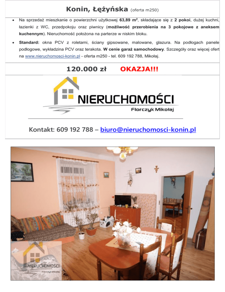 Konin, Łężyńska (oferta m250) 120.000 zł OKAZJA!!! Kontakt: 609