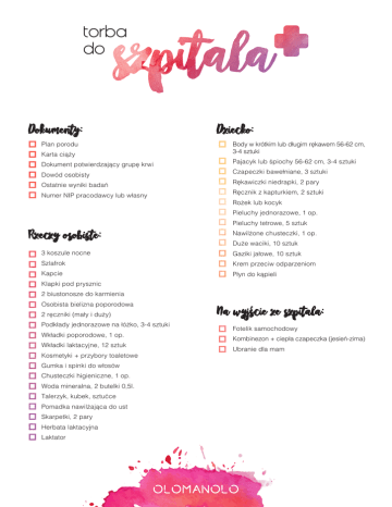 torba do Dokumenty: Plan porodu Karta ciąży Dokument potwierdzający grupę krwi Dowód osobisty Ostatnie wyniki badań Numer NIP pracodawcy lub własny Dziecko: Body w krótkim lub długim rękawem 56-62 cm, 3-4 sztuki Pajacyk lub śpiochy 56-62 cm, 3-4 sztuki Czapeczki bawełniane, 3 sztuki Rękawiczki niedrapki, 2 pary Ręcznik z kapturkiem, 2 sztuki Rożek lub kocyk Pieluchy jednorazowe, 1 op. Rzeczy osobiste: Pieluchy tetrowe, 5 sztuk Nawilżone chusteczki, 1 op. Duże waciki, 10 sztuk 3 koszule nocne Gaziki jałowe, 10 sztuk Szlafrok Krem przeciw odparzeniom Kapcie Płyn do kąpieli Klapki pod prysznic 2 biustonosze do karmienia Osobista bielizna poporodowa 2 ręczniki (mały i duży) Podkłady jednorazowe na łóżko, 3-4 sztuki Wkładki poporodowe, 1 op. Wkładki laktacyjne, 12 sztuk Kosmetyki + przybory toaletowe Gumka i spinki do włosów Chusteczki higieniczne, 1 op. Woda mineralna, 2 butelki 0,5l. Talerzyk, kubek, sztućce Pomadka nawilżająca do ust Skarpetki, 2 pary Herbata laktacyjna Laktator Na wyjście ze szpitala: Fotelik samochodowy Kombinezon + ciepła czapeczka (jesień-zima) Ubranie dla mam