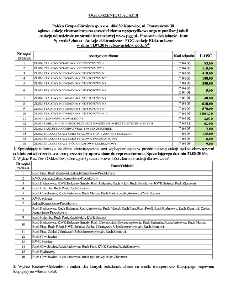 OGŁOSZENIE O AUKCJI Polska Grupa Górnicza sp. z o.o. 40-039 Katowice, ul. Powstańców 30, ogłasza aukcję elektroniczną na sprzedaż złomu wyspecyfikowanego w poniższej tabeli. Aukcja odbędzie się na stronie internetowej www.pgg.pl - Pozostała działalność - Inne Sprzedaż złomu - Aukcje elektroniczne - PGG Aukcje Elektroniczne w dniu 14.07.2016 r. (czwartek) o godz. 800 Nr części zadania Asortyment złomu 1 ZŁOM STALOWY WSADOWY NIESTOPOWY W1-I 2 ZŁOM STALOWY WSADOWY NIESTOPOWY W7-I 3 ZŁOM STALOWY NIEWSADOWY NIESTOPOWY N1 4 ZŁOM STALOWY NIEWSADOWY NIESTOPOWY N2 5 ZŁOM STALOWY NIEWSADOWY NIESTOPOWY N3 6 ZŁOM STALOWY NIEWSADOWY NIESTOPOWY N4 7 Kod odpadu ILOŚĆ 17 04 05 17 04 05 17 04 05 17 04 05 17 04 05 17 04 05 12 01 01 95,00 110,00 410,00 180,00 380,00 ZŁOM STALOWY NIEWSADOWY NIESTOPOWY N4 12 01 01 40,00 8 ZŁOM STALOWY NIEWSADOWY NIESTOPOWY N5 9 ZŁOM STALOWY NIEWSADOWY NIESTOPOWY N7 10 ZŁOM STALOWY NIEWSADOWY NIESTOPOWY N10 11 ZŁOM ALUMINIUM KAWAŁKOWY 12 ZŁOM KABLA MIEDZIANEGO PRZEKRÓJ PONIŻEJ 35MM BEZ TELETECHNICZNYCH 13 ZŁOM ŁAŃCUCHA OGNIWOWEGO f 30 BEZ ZGRZEBEŁ 14 ZŁOM ŻELAZA I STALI-RURA STALOWA SILNIE ZANIECZYSZCZONA 15 ZŁOM ŻELAZA I STALI-RURA STALOWA PREIZOLOWANA 16 ZŁOM ŻELAZA I STALI - NÓŻ OBROTOWY KOMBAJNOWY 17 04 05 17 04 05 17 04 05 17 04 02 17 04 11 17 04 05 17 04 05 17 04 05 17 04 05 620,00 570,00 1 001,30 2,030 0,300 2,00 135,00 18,00 9,00 5,00 1. Sprzedający informuje, że okres obowiązywania cen wylicytowanych w przedmiotowej aukcji będzie obowiązywał od dnia zatwierdzenia ww. cen przez osoby uprawnione do reprezentowania Sprzedającego do dnia 31.08.2016r. 2. Wykaz Ruchów i Oddziałów, które zgłosiły szacunkowe ilości złomu do aukcji dla nw. zadań: Nr części zadania 1 2 3 4 5 6 7 8 9 10 11 12 13 14 15 16 Ruch/Oddział Ruch Piast, Ruch Ziemowit, Zakład Remontowo-Produkcyjny KWK Sośnica, Zakład Remontowo-Produkcyjny Ruch Bielszowice, KWK Bolesław Śmiały, Ruch Halemba, Ruch Pokój, Ruch Rydułtowy, KWK Sośnica, Ruch Ziemowit Ruch Halemba, Ruch Piast, Ruch Ziemowit Ruch Chwałowice, Ruch Jankowice, Ruch Marcel, Ruch Piast, Ruch Rydułtowy, KWK Sośnica KWK Sośnica Zakład Remontowo-Produkcyjny Ruch Bielszowice, Ruch Halemba, Ruch Jankowice, Ruch Marcel, Ruch Piast, Ruch Pokój, Ruch Rydułtowy, Ruch Ziemowit, Zakład Remontowo-Produkcyjny Ruch Halemba, Ruch Piast, Ruch Pokój, KWK Sośnica Ruch Bielszowice, KWK Bolesław Śmiały, Ruch Chwałowice, Elektrociepłownie, Ruch Halemba, Ruch Jankowice, Ruch Marcel, Ruch Piast, Ruch Pokój, KWK Sośnica, Zakład Górniczych Robót Inwestycyjnych, Ruch Ziemowit Ruch Piast, Zakład Górniczych Robót Inwestycyjnych, Ruch Ziemowit Ruch Chwałowice KWK Sośnica Ruch Chwałowice, Ruch Jankowice, Ruch Piast, KWK Sośnica, Ruch Ziemowit Ruch Rydułtowy Ruch Chwałowice, Ruch Jankowice, Ruch Rydułtowy, Ruch Ziemowit 3. Wykaz Ruchów/Oddziałów i zadań, dla których załadunek złomu na środki transportowe Kupującego zapewnia Kupujący na własny koszt: Nr części zadania 3 4 8 9 10 Ruch/Oddział Ruch Halemba, Ruch Pokój Ruch Halemba Ruch Halemba Ruch Halemba Ruch Halemba, Ruch Pokój 4. Sprzedający zastrzega, iż sprzedaż złomu może odbywać się z pozostałych Ruchów/Oddziałów - zgodnie z wykazem Ruchów/Oddziałów Sprzedającego stanowiącym załącznik nr 2 do umowy. 5. Aukcja prowadzona będzie zgodnie z zasadami określonymi w „Regulaminie Aukcji Elektronicznych organizowanych celem sprzedaży złomu metali oraz wybranych rodzajów odpadów przez Polską Grupę Górniczą sp. z o.o. w Katowicach”. 6. Sprzedający informuje o niestosowaniu odroczonego terminu płatności. Dane do kontaktu z Organizatorem i Administratorem Aukcji (PGG sp. z o.o. Katowice): nr tel. 32/757 29 14. INFORMACJA W związku z nabyciem w dniu 29 kwietnia 2016 roku przez Polską Grupę Górniczą sp. z o.o. od Kompanii Węglowej S.A. przedsiębiorstwa obejmującego 11 kopalń i 4 zakłady specjalistyczne Sprzedający informuje, że sprzedaż w PGG sp. z o.o. dla wszystkich kopalń i zakładów będzie odbywała się przez jeden rachunek wpływów w PKO BP SA o nr: 59 1020 1026 0000 1102 0273 8227 na którym należy regulować wszystkie należności za złom zgodnie z zapisami § 4 pkt. 3 ppkt. a i b zawartej umowy ramowej. Jednocześnie informujemy, że z dniem 1 lipca 2016 roku w wyniku zmian organizacyjnych powstają: Kopalnie Zespolone: „RUDA” w skład, której wchodzą Ruchy: Bielszowice, Pokój i Halemba „ROW” w skład, której wchodzą Ruchy: Marcel, Rydułtowy, Jankowice i Chwałowice „Piast-Ziemowit” w skład, której wchodzą Ruchy: Piast i Ziemowit Oddziały: KWK Sośnica KWK Bolesław Śmiały Zakład Elektrociepłownie Zakład Remontowo-Produkcyjny Zakład Górniczych Robót Inwestycyjnych Zakład Informatyki i Telekomunikacji Zasady sprzedaży i odbioru złomu z powyższych jednostek będą realizowane zgodnie z zawartą umową.