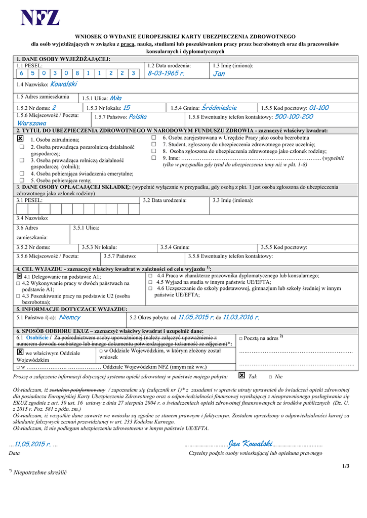 WNIOSEK O WYDANIE EUROPEJSKIEJ KARTY UBEZPIECZENIA ZDROWOTNEGO dla osób wyjeżdżających w związku z pracą, nauką, studiami lub poszukiwaniem pracy przez bezrobotnych oraz dla pracowników konsularnych i dyplomatycznych 1. DANE OSOBY WYJEŻDŻAJĄCEJ: 1.1 PESEL: 1.2 Data urodzenia: 1.3 Imię (imiona): 6 5 0 3 0 8 1 1 2 2 3 8-03-1965 r. Jan 1.4 Nazwisko: Kowalski 1.5.1 Ulica: Miła 1.5 Adres zamieszkania 1.5.2 Nr domu: 2 1.5.6 Miejscowość / Poczta: Warszawa 1.5.3 Nr lokalu: 15 1.5.7 Państwo: Polska 1.5.4 Gmina: Śródmieście 1.5.5 Kod pocztowy: 01-100 1.5.8 Ewentualny telefon kontaktowy: 500-100-200 2. TYTUŁ DO UBEZPIECZENIA ZDROWOTNEGO W NARODOWYM FUNDUSZU ZDROWIA - zaznaczyć właściwy kwadrat: □ 6. Osoba zarejestrowana w Urzędzie Pracy jako osoba bezrobotna 1. Osoba zatrudniona; □ 7. Student, zgłoszony do ubezpieczenia zdrowotnego przez uczelnię; □ 2. Osoba prowadząca pozarolniczą działalność □ 8. Osoba zgłoszona do ubezpieczenia zdrowotnego jako członek rodziny; gospodarczą; □ 9. Inne: …………………………………………………………………. (wypełnić □ 3. Osoba prowadząca rolniczą działalność tylko w przypadku gdy tytuł do ubezpieczenia inny niż w pkt. 1-8) gospodarczą (rolnik); □ □ 4. Osoba pobierająca świadczenia emerytalne; 5. Osoba pobierająca rentę; 3. DANE OSOBY OPŁACAJĄCEJ SKŁADKĘ: (wypełnić wyłącznie w przypadku, gdy osobą z pkt. 1 jest osoba zgłoszona do ubezpieczenia zdrowotnego jako członek rodziny) 3.1 PESEL: 3.2 Data urodzenia: 3.3 Imię (imiona): 3.4 Nazwisko: 3.6 Adres 3.5.1 Ulica: zamieszkania: 3.5.2 Nr domu: 3.5.6 Miejscowość / Poczta: 3.5.3 Nr lokalu: 3.5.7 Państwo: 3.5.4 Gmina: 3.5.5 Kod pocztowy: 3.5.8 Ewentualny telefon kontaktowy: 4. CEL WYJAZDU - zaznaczyć właściwy kwadrat w zależności od celu wyjazdu 1): □ 4.4 Praca w charakterze pracownika dyplomatycznego lub konsularnego; 4.1 Delegowanie na podstawie A1; □ 4.5 Wyjazd na studia w innym państwie UE/EFTA; □ 4.2 Wykonywanie pracy w dwóch państwach na □ 4.6 Uczęszczanie do szkoły podstawowej, gimnazjum lub szkoły średniej w innym podstawie A1; państwie UE/EFTA; □ 4.3 Poszukiwanie pracy na podstawie U2 (osoba bezrobotna); 5. INFORMACJE DOTYCZACE WYJAZDU: 5.1 Państwo /(-a): Niemcy 5.2 Okres pobytu: od 11.05.2015 r. do 11.03.2016 r. 6. SPOSÓB ODBIORU EKUZ – zaznaczyć właściwy kwadrat i uzupełnić dane: 6.1 Osobiście / Za pośrednictwem osoby upoważnionej (należy załączyć upoważnienie z numerem dowodu osobistego lub innego dokumentu potwierdzającego tożsamość ze zdjęciem)*: □ w Oddziale Wojewódzkim, w którym złożony został we właściwym Oddziale wniosek Wojewódzkim □ w …………………. ……………… Oddziale Wojewódzkim NFZ (innym niż ww.) Proszę o załączenie informacji dotyczącej systemu opieki zdrowotnej w państwie mojego pobytu: □ Pocztą na adres 2) ….…………………………………………………. ….………………………………………………….. Tak □ Nie Oświadczam, iż zostałem poinformowany / zapoznałem się (załącznik nr 1)* z zasadami w sprawie utraty uprawnień do świadczeń opieki zdrowotnej dla posiadacza Europejskiej Karty Ubezpieczenia Zdrowotnego oraz o odpowiedzialności finansowej wynikającej z nieuprawnionego posługiwania się EKUZ zgodnie z art. 50 ust. 16 ustawy z dnia 27 sierpnia 2004 r. o świadczeniach opieki zdrowotnej finansowanych ze środków publicznych (Dz. U. z 2015 r. Poz. 581 z późn. zm.) Oświadczam, iż wszystkie dane zawarte we wniosku są zgodne ze stanem prawnym i faktycznym. Zostałem uprzedzony o odpowiedzialności karnej za składanie fałszywych zeznań przewidzianej w art. 233 Kodeksu Karnego. Oświadczam, iż nie podlegam ubezpieczeniu zdrowotnemu w innym państwie UE/EFTA. …11.05.2015 r. … Data *) ……………………… Jan Kowalski…………………………. Czytelny podpis osoby wnioskującej lub opiekuna prawnego 1/3 Niepotrzebne skreślić Zasady wypełniania pkt. 4 i pkt. 6 1) W pkt. 4 należy zaznaczyć cel wyjazdu Pkt. 4.1 zaznacza: pracownik najemny, który został oddelegowany przez pracodawcę do pracy w innym państwie UE/EFTA – na podstawie A1; dotyczy to również pracowników transportu międzynarodowego, żołnierzy zawodowych, tzw. funkcjonariuszy służb mundurowych, tj. m.in. Policji, Straży Granicznej, Służby Celnej, Agencji Wywiadu, Agencji Bezpieczeństwa Wewnętrznego, Biura Bezpieczeństwa Narodowego, Biura Ochrony Rządu, Państwowej Straży Pożarnej oraz Służby Więziennej, jak również sędziów i prokuratorów oraz osoby duchowne. osoba prowadząca działalność gospodarczą na terytorium RP, udająca się do innego państwa wykonywać podobną działalność, tzw. samodelegowanie – na podstawie A1; dotyczy to również osoby prowadzącej działalność gospodarczą z zakresu transportu międzynarodowego, Pkt. 4.2 zaznacza: pracownik najemny lub osoba prowadząca działalność gospodarczą, która wykonuję pracę w dwóch lub więcej państwach UE/EFTA na podstawie A1 np. dwóch pracodawców, dwie działalności; Pkt. 4.3 zaznacza osoba zarejestrowana w Urzędzie Pracy, która udaje się do innego państwa UE/EFTA w celu poszukiwania tam pracy na podstawie formularza U2; Pkt. 4.4 zaznacza pracownik dyplomatyczny lub konsularny oddelegowany do pracy na placówce; Pkt. 4.5 zaznacza student, który udaje się na studia do innego państwa UE/EFTA Pkt. 4.6 zaznacza uczeń, który udaje się szkoły podstawowej, gimnazjum lub szkoły średniej w innym państwie UE/EFTA; 2) Pkt. 6 - EKUZ może być wysłana na adres zamieszkania tylko w przypadku, gdy wniosek złożony był osobiście lub za pośrednictwem poczty. Wniosek złożony za pośrednictwem poczty elektronicznej, który nie zawiera podpisu, wymaga osobistego odbioru. EKUZ odebrałem/łam w dniu ………………………. Po dpis ………………………………… D