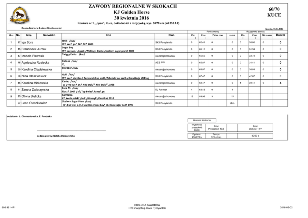 ZAWODY REGIONALNE W SKOKACH KJ Golden Horse 30 kwietnia 2016 60/70 KUCE Konkurs nr 1, „open”, Kuce, dokładności z rozgrywką, wys. 60/70 cm (art.238.1.2) Gospodarz toru: Łukasz Szustorowski Koryta, 30,04,2016 Podstawowy M-ce No. Imię Koń Nazwisko 1 17 Iga Bors 2 15 Franciszek Jurzak 3 47 Izabela Pietrasik 4 46 Agnieszka Rusiecka 5 50 Karolina Ciepielewska 6 26 Nina Oleszkiewicz 7 45 Karolina Mirkowska 8 41 Żaneta Zwierzynska 9 25 Oliwia Bielicka 27 Lena Oleszkiewicz Klub Orlik /kuc/ W \ kuc \ gn.\ Nn\ Nn\ 2003 Sugar Boy W \ kuc wal. \ kaszt.\ Wolling's Dante\ Skellorn sugar plum\ 2009 Twiggy Ewita /kuc/ Kalinka /kuc/ \\ Ekwador /kuc/ Gufi /kuc/ W \ kuc \ siwotar.\ Rumianek kuc szetl./Zebedde kuc szetl.\ Grawitacja kf/King Karino /kuc/ W \ typ kuc \ gn.\ N N brak/ \ N N brak/ \ 1998 Faza AS /kuc/ klacz \ 2007 \ kf\ Top Ewita\ Fanta\ gn. Karmelka K \ konik polski \ buł.\ Himeryk\ Karotka\ 2010 Skellorn Sugar Plum /kuc/ K \ kuc wal. \ gn.\ Skellorn music boy\ Skellorn sugar doll\ 1999 Pkt. Czas Pkt za czas Rozgrywka zwykłą razem Pkt. Czas Pkt za czas Razem SKJ Ponylandia 0 62,41 0 0 0 30,00 0 0 SKJ Ponylandia 0 65,16 0 0 0 31,94 0 0 niezarejestrowany 0 65,50 0 0 0 32,78 0 0 AZS PW 0 65,87 0 0 0 34,41 0 0 niezarejestrowany 0 63,87 0 0 0 36,09 0 0 SKJ Ponylandia 0 67,47 0 0 0 42,67 0 0 niezarejestrowany 0 62,47 0 0 4 39,41 0 4 KJ Aromer 4 63,43 0 4 niezarejestrowany 12 89,93 3 15 SKJ Ponylandia elim. sędziowie: L. Chomentowska, E. Porębska Warunki konkursu ________________________________________________________ sędzia główny: Natalia Doraczyńska 692 991 471 OBSŁUGA ZAWODÓW HTE margeting Jacek Ryczywolski Wysokość przeszkód: 60/70 Ilość Przeszkód: 10/6 Ilość skoków: 11/7 Dystans: 430/270m Tempo: 325 m/min 80/50 s 2016-05-02 ZAWODY REGIONALNE I TOWARZYSKIE W SKOKACH KJ Golden Horse 30 kwietnia 2016 60/70 cm Wyniki konkursu towarzyskiego nr 2; dokładności (art. 238.1.1) Gospodarz toru: Łukasz Szustorowski M-ce Zawodnik 1 31 Barbara Frontczak 1 21 Paulina Kubica 1 22 Iwona Wojdat 4 25 Oliwia Bielicka 5 33 Katarzyna Pierzchlewicz 5 36 Małgorzata Bacia Koryta, 30,04,16 Koń Klub Karino-GB /kuc/ O \ kuc \ izab.\ Figaro\ Klisza\ 1996 Haiti K \ m \ kara\ Harap\ nn\ 2002 Faszyna K \ m \ siwa\ paszkwil \ fasada\ 2004 Karmelka K \ konik polski \ buł.\ Himeryk\ Karotka\ 2010 Detalistka K \ inne \ gn.\ Aramus\ Daraga po Dakota\ 2008 Dragon W \ sp \ siwa\ Rotmistrz\ Dyplomacja\ 2006 Pkt. Czas Pkt za czas Razem niezarejestrowany 0 60,01 0 WKJ Lublin 0 65,53 0 WKJ Lublin 0 59,41 0 niezarejestrowany 4 66,75 4 niezarejestrowany 4 87,68 2 6 niezarejestrowany 4 87,42 2 6 sędziowie: E. Porębska, E. Metera-Zarzycka Warunki konkursu ________________________________________________________ sędzia główny: Natalia Doraczyńska kontakt: 692991471 Wysokość przeszkód: 60/70 cm Ilość Przeszkód: 10 Ilość skoków: 11 Dystans: 430 m Tempo: 325 m/min Norma: 80 s W konkursie startowało: 6 OBSŁUGA ZAWODÓW Jacek Ryczywolski Konkurs ukończyło: 6 godz. wydruku 08:55 ZAWODY REGIONALNE I TOWARZYSKIE W SKOKACH KJ Golden Horse 30 kwietnia 2016 80 cm Wyniki Konkurs nr 3, "open", Debiuty, dokładności, wys. 80 cm (art. 238.1.1) Gospodarz toru: Łukasz Szustorowski M-ce Zawodnik 1 46 Agnieszka Rusiecka 1 50 Karolina Ciepielewska 1 31 Barbara Frontczak 1 48 Oliwia Kamińska 1 21 Paulina Kubica 1 22 Iwona Wojdat 1 30 Małgorzata Jabłońska 1 Karino-GB /kuc/ O \ kuc \ izab.\ Figaro\ Klisza\ 1996 Czejen \\ Haiti K \ m \ kara\ harap\ nn\ 2002 Faszyna K \ m \ siwa\ paszkwil \ fasada\ 2004 Dakota klacz \ sp \ gn.\ nn\ nn\ Mat 1 30 Małgorzata Jabłońska 1 33 Katarzyna Pierzchlewicz 11 45 Karolina Mirkowska 11 40 Żaneta Zwierzyńska 11 48 Oliwia Kamińska 3 Jagoda Wichowska 15 7 Karolina Sujecka 16 42 Aleksandra Ptaszyńska 47 Izabela Pietrasik Klub Kalinka /kuc/ \\ Ekwador /kuc/ Nel Piotrowska 11 Koryta, 30,04,16 Koń Dakota klacz \ sp \ gn.\ nn\ nn\ Detalistka K \ inne \ gn.\ Aramus\ Daraga po Dakota\ 2008 Karino /kuc/ W \ typ kuc \ gn.\ N N brak/ \ N N brak/ \ 1998 Faza AS /kuc/ klacz \ 2007 \ kf\ Top Ewita\ Fanta\ gn. Czejen \\ Jazon W \ sp \ sk.gn.\ Jakobin\ Dama\ 2001 Magda klacz \ sp \ kaszt.\ Scorpio\ Misja\ Leksora /kuc/ K \ kuc \ \ NN\ NN\ 2004 Twiggy Ewita /kuc/ Pkt. Czas Pkt za czas Razem AZS PW 0 67,63 0 0 niezarejestrowany 0 64,76 0 0 niezarejestrowany 0 64,16 0 0 niezarejestrowany 0 61,87 0 0 WKJ Lublin 0 63,14 0 0 WKJ Lublin 0 62,15 0 0 niezarejestrowany 0 73,35 0 0 niezarejestrowany 0 67,34 0 0 niezarejestrowany 0 67,64 0 0 niezarejestrowany 0 68,72 0 0 niezarejestrowany 4 68,12 0 4 KJ Aromer 4 72,38 0 4 niezarejestrowany 4 63,15 0 4 niezarejestrowany 4 69,53 0 4 niezarejestrowany 12 79,19 0 12 niezarejestrowany 12 93,21 3 15 elim. niezarejestrowany sędziowie: E. Porębska, E. Metera-Zarzycka Warunki konkursu ________________________________________________________ sędzia główny: Natalia Doraczyńska kontakt: 692991471 Wysokość przeszkód: 80 cm Ilość Przeszkód: 10 Ilość skoków: 11 Dystans: 460 m Tempo: 325 m/min Norma: 85 s Startowało: 17 OBSŁUGA ZAWODÓW Jacek Ryczywolski Ukończyło: 16 godz. wydruku 08:55 ZAWODY REGIONALNE I TOWARZYSKIE W SKOKACH KJ Golden Horse 30 kwietnia 2016 LL Wyniki Konkurs nr 4, „open”, kl. LL, z trafieniem w normę czasu, wys. 90 cm (Zał. S1 Reg. B) Gospodarz toru: Łukasz Szustorowski M-ce Zawodnik 1 34 Filip Wróblewski 2 23 Dominika Woldan 3 10 Aleksandra Mariańska 4 24 Magdalena Rusiecka 5 Nel Piotrowska 6 40 Żaneta Zwierzyńska 7 13 Karolina Dąbrowska 8 9 9 Julia Stadnicka 42 Aleksandra Ptaszyńska 10 3 Jagoda Wichowska 11 5 Dominika Maruda 12 7 Karolina Sujecka 13 14 Michał Kawecki 14 32 Joanna Petrenko 38 Paweł Spiczonek Koryta, 30,04,16 Koń Klub Henrietta K \ m \ siwa\ Hrubieszów\ Historia\ 2007 Chester Mury Marais Z W \ Z \ siwa\ Carthago Z\ SUNSHINE VAN HET LINDEHOF\ 2006 Zarys O \ sp \ sk.gn.\ Talent BWP/Fortuin Z han.\ Zdrada xx/Lord Hippo xx\ 2005 Burzan W \ xx \ gn.\ All Hands On Deck xx/ brak\ B?yskawica
