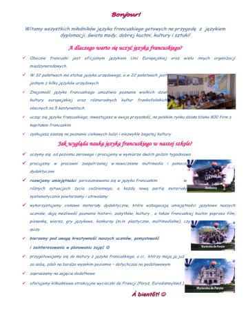 Bonjour! Witamy wszystkich miłośników języka francuskiego gotowych na przygodę z językiem dyplomacji, świata mody, dobrej kuchni, kultury i sztuki! A dlaczego warto się uczyć języka francuskiego?  Obecnie francuski jest oficjalnym językiem Unii Europejskiej oraz wielu innych organizacji międzynarodowych.  W 32 państwach ma status języka urzędowego, a w 22 państwach jest jednym z kilku języków urzędowych  Znajomość języka francuskiego umożliwia poznanie wielkich dzieł kultury europejskiej oraz różnorodnych kultur frankofońskich obecnych na 5 kontynentach.  ucząc się języka francuskiego, inwestujesz w swoja przyszłość, na polskim rynku działa blisko 800 firm z kapitałem francuskim  zyskujesz szansę na poznanie ciekawych ludzi i niezwykle bogatej kultury Jak wygląda nauka języka francuskiego w naszej szkole?  uczymy się od poziomu zerowego i pracujemy w wymiarze dwóch godzin tygodniowo  pracujemy w pracowni zaopatrzonej w nowoczesne multimedia i pomoce dydaktyczne  rozwijamy umiejętności porozumiewania się w języku francuskim w różnych sytuacjach życia codziennego, a każdą nową partię materiału systematycznie powtarzamy i utrwalamy  wykorzystujemy ciekawe materiały dydaktyczne, które wzbogacają umiejętności językowe naszych uczniów, dają możliwość poznania historii, zabytków, kultury , a także francuskiej kuchni poprzez film, piosenkę, wiersz, gry językowe, konkursy (m.in. plastyczne, multimedialne), czy quizy  bierzemy pod uwagę kreatywność naszych uczniów, pomysłowość i zainteresowania w planowaniu zajęć   przygotowujemy się do matury z języka francuskiego, a ci, którzy mają ją już za sobą, zdali na bardzo wysokim poziomie – dotychczas na podstawowym  zapraszamy na zajęcia dodatkowe  oferujemy kilkudniowe atrakcyjne wycieczki do Francji (Paryż, Eurodisneyland ) À bientôt!