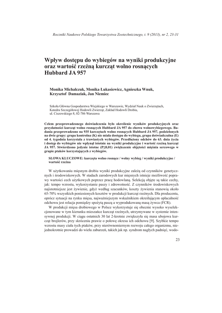 Roczniki Naukowe Polskiego Towarzystwa Zootechnicznego, t. 9 (2013), nr 2, 23-31 Wpływ dostępu do wybiegów na wyniki produkcyjne oraz wartość rzeźną kurcząt wolno rosnących Hubbard JA 957 Monika Michalczuk, Monika Łukasiewicz, Agnieszka Wnuk, Krzysztof Damaziak, Jan Niemiec Szkoła Główna Gospodarstwa Wiejskiego w Warszawie, Wydział Nauk o Zwierzętach, Katedra Szczegółowej Hodowli Zwierząt, Zakład Hodowli Drobiu, ul. Ciszewskiego 8, 02-786 Warszawa Celem przeprowadzonego doświadczenia było określenie wyników produkcyjnych oraz przydatności kurcząt wolno rosnących Hubbard JA 957 do chowu wolnowybiegowego. Badania przeprowadzono na 935 kurczętach wolno rosnących Hubbard JA 957, podzielonych na dwie grupy: grupa kontrolna (K) nie miała dostępu do wybiegu, grupa doświadczalna (E) od 4. tygodnia korzystała z trawiastych wybiegów. Przedłużony odchów do 63. dnia życia i dostęp do wybiegów nie wpłynął istotnie na wyniki produkcyjne i wartość rzeźną kurcząt JA 957. Stwierdzono jedynie istotne (P≤0,01) zwiększenie objętości mięśnia sercowego w grupie ptaków korzystających z wybiegów. SŁOWA KLUCZOWE: kurczęta wolno rosnące / wolny wybieg / wyniki produkcyjne / wartość rzeźna W użytkowaniu mięsnym drobiu wyniki produkcyjne zależą od czynników genetycznych i środowiskowych. W stadach zarodowych kur mięsnych istnieje możliwość poprawy wartości cech użytkowych poprzez pracę hodowlaną. Selekcją objęte są takie cechy, jak: tempo wzrostu, wykorzystanie paszy i zdrowotność. Z czynników środowiskowych najistotniejsze jest żywienie, gdyż według szacunków, koszty żywienia stanowią około 65-70% wszystkich poniesionych kosztów w produkcji kurcząt rzeźnych. Dla producenta, oprócz sytuacji na rynku mięsa, najważniejszym wskaźnikiem określającym opłacalność odchowu jest relacja pomiędzy spożytą paszą a wyprodukowaną masą żywca (FCR). W produkcji mięsa drobiowego w Polsce wykorzystuje się obecnie wysoko wyselekcjonowane w tym kierunku mieszańce kurcząt rzeźnych, utrzymywane w systemie intensywnej produkcji. W ciągu ostatnich 30 lat 2-krotnie zwiększyła się masa ubojowa kurcząt brojlerów, przy skróceniu prawie o połowę okresu ich odchowu [9]. Szybkie tempo wzrostu masy ciała tych ptaków, przy nierównomiernym rozwoju całego organizmu, niejednokrotnie prowadzi do wielu zaburzeń, takich jak np. syndrom nagłych padnięć, wodo- 23 M. Michalczuk i wsp. brzusze, pęcherze piersiowe, schorzenia kończyn – degeneracja kości udowej czy chondrodysplazja kości piszczelowej [28]. Zaburzenia te wpływają negatywnie na zdrowotność kurcząt, a przede wszystkim na jakość mięsa. Poważnym problemem jest obniżona zdolność do produkcji przeciwciał, a w związku z tym zmniejszona odporność na choroby. System intensywnej produkcji uniemożliwia ptakom wyrażanie naturalnych zachowań, znacznie obniżając ich dobrostan. U drobiu grzebiącego do naturalnych zachowań zalicza się m.in. ruch, grzebanie, dziobanie, poszukiwanie pokarmu, trzepotanie skrzydłami, stroszenie piór, kąpiele słoneczne i piaskowe. Ograniczenie możliwości wyrażania tych zachowań może wywoływać u ptaków zaburzenia prowadzące do wzajemnego dziobania się i okaleczania [13]. Kury utrzymywane w systemach alternatywnych mają większą przestrzeń życiową i mogą w większym stopniu przejawiać swoje odruchy behawioralne. Jednak u ptaków utrzymywanych na wybiegu istnieje większe ryzyko wystąpienia infekcji bakteryjnych i wirusowych w porównaniu z utrzymywanymi w zamkniętym, bezokiennym budynku na ściółce. Dobrostan zwierząt jest bardzo istotnym czynnikiem wpływającym na świadomą decyzję konsumentów [20]. Ostatnie badania wykazały, że prawie połowa badanych Brytyjczyków oceniała dobrostan zwierząt jako czynnik „bardzo ważny” [10], natomiast 76% [5] i 85% [4] jako „ważny”, wpływający pośrednio na przydatność i trwałość żywności, szczególnie z punktu widzenia jej zdrowotności i bezpieczeństwa. Ponad 70% badanych obywateli USA wykazało „zaniepokojenie” dobrostanem zwierząt gospodarskich [23]. Konsumenci mięsa drobiowego coraz bardziej interesują się dobrostanem zwierząt oraz jakością i bezpieczeństwem pozyskiwanych od nich produktów [6]. Wielu z nich zwraca uwagę na warunki utrzymania i system chowu. Obecnie również polscy klienci coraz częściej zastanawiają się nad zakupem mięsa kurcząt odchowywanych w mniej intensywnych systemach, z dostępem do wolnych wybiegów, mając przekonanie, że mięso to charakteryzuje się lepszą jakością. Wiodącym systemem utrzymania kurcząt rzeźnych w Polsce jest system intensywny, natomiast wśród systemów alternatywnych spotyka się wolno wybiegowy. Stwarza to możliwości do zwiększenia dbałości o środowisko, zachowania różnorodności biologicznej, jak również rozszerzania metod produkcji przyjaznych środowisku. W opinii wielu konsumentów, wysokie standardy dotyczące dobrostanu kurcząt rzeźnych prowadzą do uzyskania produktów wysokiej jakości [2, 27, 29]. Konwencjonalne zamknięte systemy utrzymania powodują powstawanie stresu u kurcząt [12], a w konsekwencji różne reakcje fizjologiczne i behawioralne [16] oraz wpływają na pogorszenie wyników produkcyjnych [17]. Zmniejszenie stresu, a zwiększenie komfortu oraz poprawa dobrostanu ptaków niewątpliwie powoduje poprawę smaku i aromatu produktów, w porównaniu z wytwarzanymi w tradycyjny sposób [8, 14]. Zdaniem Lichovnikovej i wsp. [15] chów wolno wybiegowy daje możliwość wykorzystania kogutków odrzuconych w drodze seksowania i pozyskania od nich mięsa o właściwościach porównywalnych, a nawet lepszych, z odmianami szybko rosnącymi (mięso tych kogutów zawiera więcej białka i mniej tłuszczu). Celem przeprowadzonego doświadczenia było porównanie wyników produkcyjnych oraz wartości rzeźnej kurcząt Hubbard JA 957 utrz