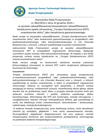 Agencja Oceny Technologii Medycznych Rada Przejrzystości Stanowisko Rady Przejrzystości nr 362/2014 z dnia 22 grudnia 2014 r. w sprawie zakwalifikowania/niezasadności zakwalifikowania świadczenia opieki zdrowotnej „Terapia fotodynamiczna (PDT) nowotworów skóry” jako świadczenia gwarantowanego Rada uznaje za niezasadne zakwalifikowanie „Terapia fotodynamiczna (PDT) nowotworów skóry” jako świadczenia gwarantowanego w przypadkach raka podstawnokomórkowego, raka kolczystokomórkowego in situ (choroba Bowena) oraz u chorych, u których współistnieją te postaci nowotworów. Jednocześnie Rada Przejrzystości uznaje za zasadne zakwalifikowanie stosowania PDT w przypadkach rogowacenia słonecznego, będącego czynnikiem ryzyka rozwoju raka kolczystokomórkowego. W związku z tym Rada proponuje zmianę nazwy świadczenia na „Terapia fotodynamiczna (PDT) stanów przedrakowych skóry”. Rada zwraca uwagę na konieczność obniżenia kosztów substancji fotouczulającej stosowanej w ramach PDT celem zwiększenia efektywności kosztowej tej technologii. Uzasadnienie Terapia fotodynamiczna (PDT) jest stosowaną opcją terapeutyczną w wyselekcjonowanych przypadkach raka podstawnokomórkowego, raka kolczystokomórkowego in situ (choroba Bowena) oraz u chorych, u których współistnieją te postaci nowotworów, a także w przypadkach rogowacenia słonecznego. Dotyczy to szczególnie tych pacjentów, u których zmiany występują na twarzy, małżowinach usznych, nieowłosionej skórze głowy, dolnej wardze lub na grzbietowej części dłoni, a przyjęta metoda leczenia może być wówczas oceniana również z punktu widzenia uzyskanego efektu kosmetycznego. Alternatywą dla PDT jest krioterapia, metody chirurgiczne, z uwzględnieniem również chirurgii mikrograficznej Mohsa, gdy uzasadniają to cechy lub lokalizacja zmian nowotworowych, łyżeczkowanie i kauteryzacja, radioterapia, metody farmakologiczne. O wyborze metody terapeutycznej, poza lokalizacją zmiany, może decydować również jej rozległość, głębokość i inne cechy zaawansowania choroby. W przypadkach wątpliwości diagnostycznych lub przy wyborze metody nieoperacyjnej konieczne jest przeprowadzenie postępowania różnicującego na podstawie badania histopatologicznego. Agencja Oceny Technologii Medycznych ul. I. Krasickiego 26, 02-611 Warszawa, tel. +48 22 56 67 200 fax +48 22 56 67 202 e-mail: [email protected] www.aotm.gov.pl Stanowisko Rady Przejrzystości AOTM nr 362/2014 z dnia 22 grudnia 2014 r. W Polsce w przypadkach zmian powierzchownych i guzkowych, o dobrze widocznych granicach stosowana jest bardzo często krioterapia. Zabiegi kriochirurgiczne przeprowadzane w obrębie środkowej części twarzy mogą się jednak wiązać z powikłaniami czynnościowymi. Alternatywą jest wycięcie chirurgiczne zmian lub w starannie wyselekcjonowanych przypadkach PDT. W przypadkach BCC lub BCC powierzchownego (sBCC) krioterapia wiąże się z wyższymi współczynnikami całkowitej odpowiedzi na leczenie i niższym ryzykiem nawrotów. Odwrotnie jest w przypadkach choroby Bowena lub rogowacenia słonecznego. We wszystkich wskazaniach podnosi się fakt lepszego efektu kosmetycznego PDT oraz zdecydowane w stosunku do tej technologii preferencje pacjentów. Wynika to z mniej nasilonych efektów niepożądanych po PDT v. krioterapia. Efekt kosmetyczny w przypadkach wycięcia chirurgicznego zależy od wskazania, rozległości zmiany i ewentualnej wieloetapowości zabiegów. Wszystkie powyższe wnioski znajdują odzwierciedlenie w badaniach randomizowanych o wysokiej jakości. PDT nie zaleca się w przypadkach o dużym ryzyku nawrotu zmian. Nie ma ona zastosowania również w przypadkach głęboko naciekającego lub nawracającego raka podstawnokomórkowego (BCC). Dostępne dowody naukowe wskazują na znacznie wyższe odległe ryzyko wznowy nowotworu po zastosowaniu PDT, w porównaniu z leczeniem chirurgicznym. PDT jest technologią drogą, o kilkukrotnie wyższych kosztach niż w przypadkach krioterapii. W przypadkach nBCC lub sBCC całkowity koszt PDT może zbliżać się nawet do kosztów chirurgicznego wycięcia zmiany, rozliczanego w JGP, ze względu na kilkukrotne sesje przeprowadzane w ramach tej technologii. W związku z tym Rada proponuje rozważenie możliwości zastosowania mechanizmów wpływających na obniżenie kosztów PDT, w tym przede wszystkim kosztów czynnika fotouczulającego. .................................................................. Wiceprzewodniczący Rady Przejrzystości prof. Michał Myśliwiec Tryb wydania stanowiska Stanowisko wydano na podstawie art. 31c ust. 6 ustawy z dnia 27 sierpnia 2004 r. o świadczeniach opieki zdrowotnej finansowanych ze środków publicznych (Dz. U. z 2008 r. Nr 164, poz.1027 z późn .zm.), z uwzględnieniem raportu „Fotodynamiczna terapia nowotworów skóry (PDT) – sprawa – MZ-OZG-73-23901-11/JC/11”. 2/2