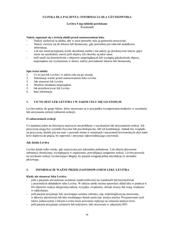 ULOTKA DLA PACJENTA: INFORMACJA DLA UŻYTKOWNIKA Levitra 5 mg tabletki powlekane Wardenafil Należy zapoznać się z treścią ulotki przed zastosowaniem leku. Należy zachować tę ulotkę, aby w razie potrzeby móc ją ponownie przeczytać. Należy zwrócić się do lekarza lub farmaceuty, gdy potrzebna jest rada lub dodatkowa informacja. Lek ten został przepisany ściśle określonej osobie i nie należy go przekazywać innym, gdyż może im zaszkodzić, nawet jeśli objawy ich choroby są takie same. Jeśli nasili się którykolwiek z objawów niepożądanych lub wystąpią jakiekolwiek objawy. niepożądane nie wymienione w ulotce, należy powiadomić lekarza lub farmaceutę. Spis treści ulotki: 1. Co to jest lek Levitra i w jakim celu się go stosuje 2. Informacje ważne przed zastosowaniem leku Levitra 3. Jak stosować lek Levitra 4. Możliwe działania niepożądane 5. Jak przechowywać lek Levitra 6. Inne informacje 1. CO TO JEST LEK LEVITRA I W JAKIM CELU SIĘ GO STOSUJE Levitra należy do grupy leków, które stosowane są w przypadku występowania trudności w uzyskaniu lub utrzymaniu erekcji (zaburzeń erekcji). O zaburzeniach erekcji Co najmniej jeden na dziesięciu mężczyzn ma problemy z uzyskaniem lub utrzymaniem erekcji. Ich przyczyną mogą być czynniki fizyczne lub psychologiczne, lub ich kombinacja. Jednak bez względu na przyczynę, skutek jest ten sam: z powodu zmian w mięśniach i naczyniach krwionośnych zbyt mało krwi dopływa do prącia, by zapewnić i utrzymać odpowiednią jego sztywność. Jak działa Levitra Levitra działa tylko wtedy, gdy mężczyzna jest seksualnie pobudzony. Lek obniża aktywność substancji chemicznej, występującej w organizmie, powodującej ustąpienie erekcji. Levitra pozwala na uzyskanie erekcji wystarczająco długiej, by pacjent osiągnął pełną satysfakcję ze stosunku płciowego. 2. INFORMACJE WAŻNE PRZED ZASTOSOWANIEM LEKU LEVITRA Kiedy nie stosować leku Levitra - jeśli u pacjenta stwierdzono uczulenie (nadwrażliwość) na wardenafil lub którykolwiek z pozostałych składników leku Levitra. W tekście ulotki można sprawdzić skład leku w punkcie 6. Do objawów reakcji alergicznej należą: wysypka, swędzenie, obrzęk twarzy lub warg, trudności w oddychaniu. - jeśli pacjent przyjmuje leki zawierające azotany (nitraty), (np. trójnitroglicerynę stosowaną w dławicy piersiowej) lub leki uwalniające tlenek azotu (np. azotyn amylu). Przyjmowanie tych leków jednocześnie z lekiem Levitra może poważnie wpłynąć na ciśnienie tętnicze krwi. - jeśli pacjent przyjmuje rytonawir lub indynawir, leki stosowane w zakażeniu HIV. 76 - jeśli pacjent jest w wieku powyżej 75 lat i przyjmuje leki przeciwgrzybicze – ketokonazol lub itrakonazol. jeśli u pacjenta stwierdzono ciężką chorobę serca lub wątroby. jeśli pacjent jest poddawany dializie. jeśli pacjent niedawno przebył udar mózgu lub zawał serca. jeśli u pacjenta stwierdzono obecnie lub w przeszłości niskie ciśnienie tętnicze krwi. jeśli w rodzinie pacjenta stwierdzono zwyrodnieniowe choroby oczu (np. barwnikowe zwyrodnienie siatkówki). jeśli u pacjenta stwierdzono kiedykolwiek stan objawiający się utratą wzroku w wyniku uszkodzenia nerwu wzrokowego z powodu niedostatecznego dopływu krwi, zwany nietętniczą przednią niedokrwienną neuropatią nerwu wzrokowego. Kiedy zachować szczególną ostrożność stosując lek Levitra jeśli pacjent ma problemy z sercem. W takiej sytuacji seks może być niebezpieczny. jeśli u pacjenta stwierdzono nieregularny rytm serca (arytmię serca) lub jakąkolwiek wrodzoną chorobę serca, która wpływa na zapis EKG. jeśli u pacjenta stwierdzono schorzenia wpływające na kształt członka (skrzywienie prącia, choroba Peyroniego, zwłóknienie ciał jamistych). jeśli u pacjenta stwierdzono choroby, które mogą spowodować nie ustępujący wzwód (priapizm), takie jak: niedokrwistość sierpowatokrwinkowa, szpiczak mnogi, białaczka. jeśli u pacjenta stwierdzono wrzód żołądka (zwany także wrzodem trawiennym). jeśli u pacjenta stwierdzono zaburzenia krzepnięcia krwi (takie jak hemofilia). jeśli u pacjenta stosowano jakiekolwiek inne leczenie zaburzeń erekcji. jeśli u pacjenta wystąpi nagłe pogorszenie widzenia lub nagła utrata wzroku, należy przerwać stosowanie leku Levitra i niezwłocznie skontaktować się z lekarzem. Levitra jest lekiem dla mężczyzn w wieku 18 lat i starszych Nie należy stosować leku u kobiet, dzieci i mężczyzn w wieku poniżej 18 lat. Stosowanie leku Levitra z innymi lekami Należy powiedzieć lekarzowi o wszystkich przyjmowanych ostatnio lekach, również tych, które wydawane są bez recepty. Lek Levitra może być zazwyczaj stosowany jednocześnie z większością leków, jednakże niektóre z nich mogą powodować problemy, a w szczególności: leki stosowane w leczeniu dławicy piersiowej: azotany (nitraty) lub uwalniające tlenek azotu (takie jak azotyn amylu). Jednoczesne stosowanie tych leków z lekiem Levitra może bardzo niekorzystnie wpłynąć na ciśnienie tętnicze krwi. Należy skonsultować się z lekarzem przed przyjęciem leku Levitra. leki stosowane w leczeniu zaburzeń rytmu serca, takie jak: chinidyna, prokainamid, amiodaron lub sotalol. leki stosowane w leczeniu zakażenia HIV, takie jak rytonawir lub indynawir. Należy skonsultować się z lekarzem przed przyjęciem leku Levitra. ketokonazol lub itrakonazol, leki przeciwgrzybicze. erytromycyna lub klarytromycyna, antybiotyki makrolidowe. leki blokujące receptory alfa-adrenergiczne stosowane w leczeniu nadciśnienia tętniczego i powiększenia gruczołu krokowego (łagodnego przerostu gruczołu krokowego). Zażywanie leku Levitra z jedzeniem i piciem Lek Levitra można zażywać razem z posiłkiem lub niezależnie od niego, jednak, gdy przyjmuje się go z jedzeniem, to lepiej jest unikać posiłków obfitych i tłustych, ponieważ mogą one opóźnić działanie leku. Leku Levitra 