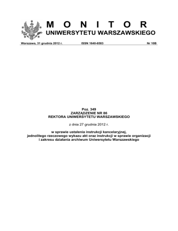 M O N I T O R UNIWERSYTETU WARSZAWSKIEGO Warszawa, 31 grudnia 2012 r. ISSN 1640-6583 Nr 10B Poz. 349 ZARZĄDZENIE NR 86 REKTORA UNIWERSYTETU WARSZAWSKIEGO z dnia 27 grudnia 2012 r. w sprawie ustalenia instrukcji kancelaryjnej, jednolitego rzeczowego wykazu akt oraz instrukcji w sprawie organizacji i zakresu działania archiwum Uniwersytetu Warszawskiego Monitor Uniwersytetu Warszawskiego nr 10B 31 grudnia 2012 r. Poz. 349 ZARZĄDZENIE NR 86 REKTORA UNIWERSYTETU WARSZAWSKIEGO z dnia 27 grudnia 2012 r. w sprawie ustalenia instrukcji kancelaryjnej, jednolitego rzeczowego wykazu akt oraz instrukcji w sprawie organizacji i zakresu działania archiwum Uniwersytetu Warszawskiego Na podstawie art. 66 ust. 2 ustawy z dnia 27 lipca 2005 r. – Prawo o szkolnictwie wyższym (tekst jednolity: Dz. U. z 2012 r. poz. 572 i 742) w związku z art. 6 ust. 1 i 2 ustawy z dnia 14 lipca 1983 r. o narodowym zasobie archiwalnym i archiwach (Dz. U. 2011 r. Nr 123 poz. 698 z późn. zm.) oraz § 3 ust. 3 pkt 2 rozporządzenia Ministra Kultury z dnia 16 września 2002 r. w sprawie postępowania z dokumentacją, zasad jej klasyfikowania i kwalifikowania oraz zasad i trybu przekazywania materiałów archiwalnych do archiwów państwowych (Dz. U. Nr 167, poz. 1375), zarządza się, co następuje: 1) 2) 3) §1 Wprowadza się: Instrukcję kancelaryjną w Uniwersytecie Warszawskim, stanowiącą załącznik nr 1 do niniejszego zarządzenia; Jednolity rzeczowy wykaz akt w Uniwersytecie Warszawskim, stanowiący załącznik nr 2 do niniejszego zarządzenia; Instrukcję w sprawie organizacji i zakresu działania archiwum w Uniwersytecie Warszawskim, stanowiącą załącznik nr 3 do niniejszego zarządzenia. §2 Sprawy niezałatwione do dnia 31 grudnia 2012 r. rejestruje się ponownie, klasyfikując je zgodnie z jednolitym rzeczowym wykazem akt, o którym mowa w § 1 ust. 2. §3 Dokumentacja wytworzona i zgromadzona w Uniwersytecie Warszawskim przed dniem wejście w życie zarządzenia, podlega ponownej kwalifikacji do kategorii archiwalnych, określonych w jednolitym rzeczowym wykazie akt, o którym mowa w § 1 ust. 2, jeżeli dotychczasowe przepisy określały niższą wartość archiwalną tej dokumentacji lub krótszy okres jej przechowywania. §4 Dokumentacja, która przed dniem wejścia w życie zarządzenia nie była w Uniwersytecie Warszawskim kwalifikowana na podstawie obowiązujących wówczas jednolitych rzeczowych wykazów akt, jest kwalifikowana na podstawie jednolitego rzeczowego wykazu akt wprowadzonego niniejszym zarządzeniem. §5 Traci moc zarządzenie nr 14 Rektora Uniwersytetu Warszawskiego z dnia 15 grudnia 2004 r. w sprawie wprowadzenia normatywów kancelaryjno-archiwalnych (Monitor UW z 2004 r., Nr 8A, poz. 134). §6 Zarządzenie wchodzi w życie z dniem 1 stycznia 2013 r. Rektor UW: M. Pałys 2 Monitor Uniwersytetu Warszawskiego nr 10B 31 grudnia 2012 r. Spis treści INSTRUKCJA KANCELARYJNA ........................................................................................................... 4 ROZDZIAŁ 1 Postanowienia wstępne i ogólne ............................................................................................ 5 ROZDZIAŁ 2 Przyjmowanie i rozdział korespondencji (wpływów) ............................................................ 6 ROZDZIAŁ 3 Przekazywanie korespondencji (wpływów) Rektorowi i prorektorom .............................. 7 ROZDZIAŁ 4 Czynności kancelaryjne sekretariatów Rektora i prorektorów ........................................... 8 ROZDZIAŁ 5 Przeglądanie i przydzielanie korespondencji (wpływów) .................................................... 8 ROZDZIAŁ 6 Wewnętrzny obieg akt.............................................................................................................. 8 ROZDZIAŁ 7 System kancelaryjny, rejestracja i znakowanie spraw ........................................................ 9 ROZDZIAŁ 8 Załatwianie spraw ................................................................................................................... 11 ROZDZIAŁ 9 Wysyłanie i doręczanie pism................................................................................................. 13 ROZDZIAŁ 10 Przechowywanie akt ............................................................................................................ 14 ROZDZIAŁ 11 Przekazywanie akt do archiwum zakładowego i państwowego .................................... 14 ROZDZIAŁ 12 Postępowanie z aktami Senatu UW .................................................................................. 16 ROZDZIAŁ 13 Wykorzystanie informatyki w czynnościach kancelaryjnych .......................................... 16 ROZDZIAŁ 14 Nadzór nad wykonywaniem czynności kancelaryjnych .................................................. 17 ROZDZIAŁ 15 Postanowienia końcowe ...................................................................................................... 17 Załącznik do Instrukcji Kancelaryjnej........................................................................................................... 18 JEDNOLITY RZECZOWY WYKAZ AKT ............................................................................................. 19 INSTRUKCJA W SPRAWIE ORGANIZACJI I ZAKRESU DZIAŁANIA ARCHIWUM W UNIWERSYTECIE WARSZAWSKIM ………………………………………………………………………..49 ROZDZIAŁ 1 Postanowienia ogólne ...................................................................................................50 ROZDZIAŁ 2 Organizacja, zadania, miejsce Archiwum UW w strukturze UW ..................................... 50 ROZDZIAŁ 3 Przejmowanie, gromadzenie i przechowywanie akt .......................................................... 51 ROZDZIAŁ 4 Ewidencja i opracowywanie akt........................................................................................... 52 ROZDZIAŁ 5 Udostępnianie akt ...........................