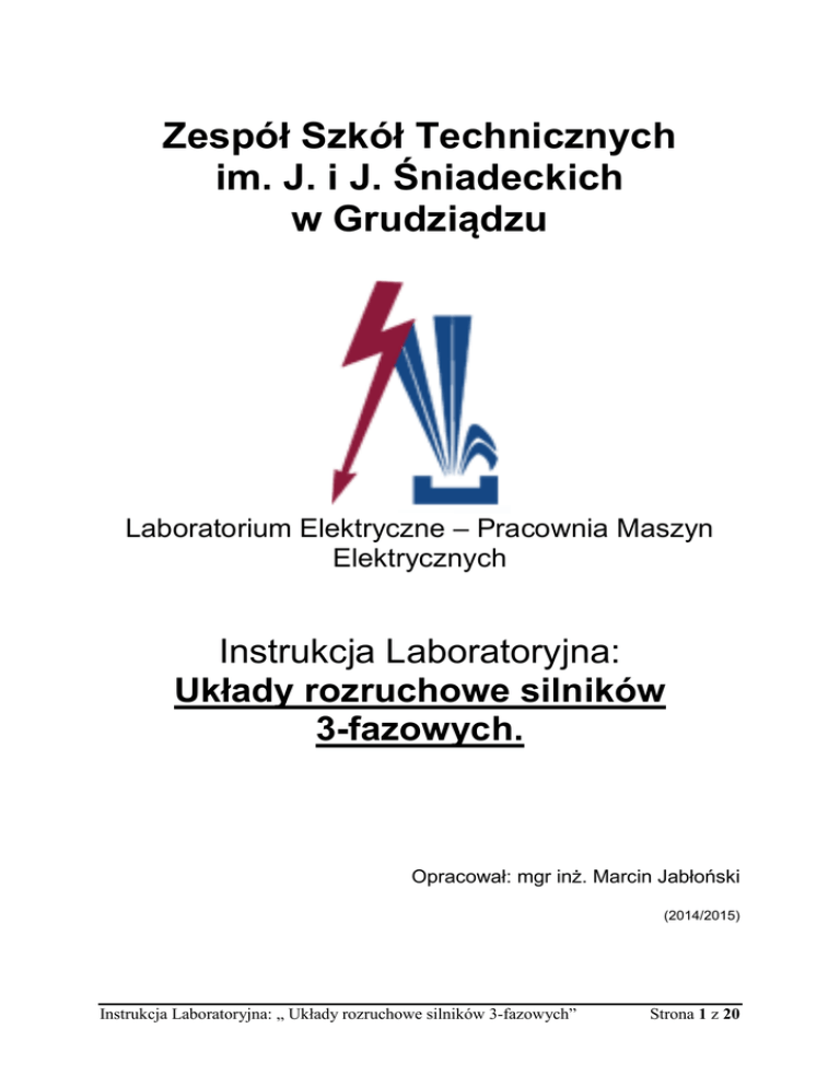 Zespół Szkół Technicznych im. J. i J. Śniadeckich w Grudziądzu Laboratorium Elektryczne – Pracownia Maszyn Elektrycznych Instrukcja Laboratoryjna: Układy rozruchowe silników 3-fazowych. Opracował: mgr inż. Marcin Jabłoński (2014/2015) Instrukcja Laboratoryjna: „ Układy rozruchowe silników 3-fazowych” Strona 1 z 20 Zakres ćwiczenia: Ćwiczenie polega na zapoznaniu się z podstawowymi układami rozruchowymi silników 3-fazowych. Układy rozruchowe oparte są na stycznikach zamontowanych na tablicy z szynami TH-35 (euro szyna) lub w rozdzielnicach natynkowych. Jako obiekt sterowany w przypadku układów załącz – wyłącz (0-1) i lewo – prawo (L-P) stosowany będzie silnik 3-fazowy o mocy 0,55kW a przypadku układu gwiazda – trójkąt ( Y - ) układ 6 żarówek . 1. Przygotowanie teoretyczne do zajęć w laboratorium elektrycznym: Silniki elektryczne - stanowią najliczniejszą grupę maszyn elektrycznych; szeroko stosowanych w przemyśle, komunikacji i transporcie, rolnictwie, a także w napędach urządzeń gospodarstwa domowego. Silniki elektryczne prądu przemiennego są obecnie największą grupą odbiorników energii elektrycznej w świecie. Ze względu na rodzaj prądu i zasadę działania maszyny elektryczne dzieli się na: maszyny prądu przemiennego: o maszyny synchroniczne, o maszyny asynchroniczne (indukcyjne), maszyny komutatorowe prądu przemiennego, maszyny prądu stałego. Każda z maszyn prądu przemiennego może być zarówno 1- fazową jak i 3 fazową. Instrukcja Laboratoryjna: „ Układy rozruchowe silników 3-fazowych” Strona 2 z 20 1.1. Rodzaje maszyn asynchronicznych Maszyny indukcyjne (asynchroniczne) wirujące, można podzielić: ze względu na sposób wykonania obwodów elektrycznych wirnika: o maszyny o wirniku symetrycznym pierścieniowym wielofazowym, z uzwojeniem połączonym za pomocą pierścieni ślizgowych, np. z rozrusznikiem lub ze źródłem zasilania; o maszyny o wirniku klatkowym, w którym obwody elektryczne wielofazowe wykonane są z połączonych prętów oraz pierścieni odlewanych lub spawanych; o maszyny o wirniku pierścieniowo - klatkowym, z uzwojeniem fazowym przyłączonym do pierścieni ślizgowych oraz uzwojeniem klatkowym (stosowane jako silniki o mocy większej niż 1 MW) ze względu na zakres parametrów znamionowych: o niskiego napięcia - o mocy nie większej niż 300 kW, o wysokiego napięcia - o mocy nie mniejszej niż 160 kW, o o częstotliwości 50 - 60 Hz, lub o częstotliwości zwiększonej, o o częstotliwości do 3500 Hz - silniki do technologii wysokoobrotowej. ze względu na sposób zasilania: o maszyny indukcyjne jednofazowe - o mocy do 2 kW; o maszyny indukcyjne dwufazowe - stosowane jako silniki wykonawcze w grupie maszynowych elementów automatyki; Instrukcja Laboratoryjna: „ Układy rozruchowe silników 3-fazowych” Strona 3 z 20 o maszyny indukcyjne trójfazowe - najpowszechniej stosowane; o maszyny indukcyjne o liczbie faz większej niż 3, stosowane w wielofazowych układach przekształtnikowych. ze względu na rodzaj ruchu: o maszyny indukcyjne wirujące; o maszyny indukcyjne liniowe. ze względu na sposób przystosowania do warunków środowiskowych i napędowych, o określonym: o stopniu ochrony, o rodzaju wykonania, o układzie chłodzenia. Silniki indukcyjne o ruchu innym niż obrotowy stosowane są jako silniki: liniowe, oscylacyjne, wahadłowe, lub o stojanie innym niż cylindryczny, np. łukowym, do napędu pieców obrotowych w cementowniach. 1.2. Budowa maszyn asynchronicznych Maszyna indukcyjna [2] składa się z dwóch części (rys. 1): nieruchomej w kształcie walca, zwanej stojanem, części ruchomej zwanej wirnikiem, także w kształcie walca. Instrukcja Laboratoryjna: „ Układy rozruchowe silników 3-fazowych” Strona 4 z 20 Rys. 1. Silnik indukcyjny [3] Obwód magnetyczny maszyny asynchronicznej stanowią rdzenie stojana i wirnika wykonane w formie pakietu z blach odizolowanych od siebie o ok.0,5 mm (rys. 2). Stojan i wirnik są oddzielone od siebie szczeliną powietrzną o grubości rzędu kilku dziesiątych mm w małych maszynach. Na całym obwodzie rdzenia stojana i wirnika wycina się rowki o specjalnym kształcie, zwane żłobkami, w których umieszcza się uzwojenie (rys. 2). Rdzeń stojana umieszcza sie w kadłubie maszyny, natomiast rdzeń wirnika w maszynach małej mocy na wale, natomiast w maszynach o dużych mocach na piaście. Rys. 2. Budowa silnika indukcyjnego [3] Instrukcja Laboratoryjna: „ Układy rozruchowe silników 3-fazowych” Strona 5 z 20 Uzwojenia stojana silnika trójfazowego składa się si z trzech oddzielnych uzwojeń zwanych fazami, które w czasie pracy są połączone ączone w gwiazdę lub w trójkąt (rys. 3). Rys. 3. Połączenia czenia uzwojeń uzwoje silnika: górny w gwiazdę, ę, dolny w trójkąt Uzwojenia stojanów wykonuje się si z izolowanego drutu nawojowego, dodatkowo impregnowanego gnowanego i usztywnionego. Uzwojenia sąą odizolowane od rdzenia izolacjąą żłobkową żłobkową,, zabezpieczone przed wypadaniem ze żłobka za pomocą klinów. W praktyce maszyny asynchroniczne stosowane są są jako silniki o uzwojeniu klatkowym (zwartym) lub pierścieniowe. pier Uzwojenia jenia wirnika klatkowego, mogą być wykonane z nieizolowanych prętów tów (miedzianych, aluminiowych, itp.) o dużym ym przekroju, które całkowicie wypełniają żłobki, łobki, połą połączonych czonych po obu stronach wirnika pier pierścieniami zwierającymi cymi (rys. 4). Obwód magnetyczny wirnika wykonany jest w postaci pakietu blach stalowych z dodatkiem krzemu, wzajemne odizolowanych, Instrukcja Laboratoryjna: „ Układy rozruchowe silników 3-fazowych” 3 Strona 6 z 20 złożonych jedna na drugą. Obwód elektryczny wirnika jest zawsze zwarty (stąd nazwa silnika). Klatka stanowi wielofazowe uzwojenie wirnika, o liczbie faz równej liczbie prętów, z których jest wykonana. Rys. 4. Wirnik klatkowy Uzwojenia wirnika pierścieni