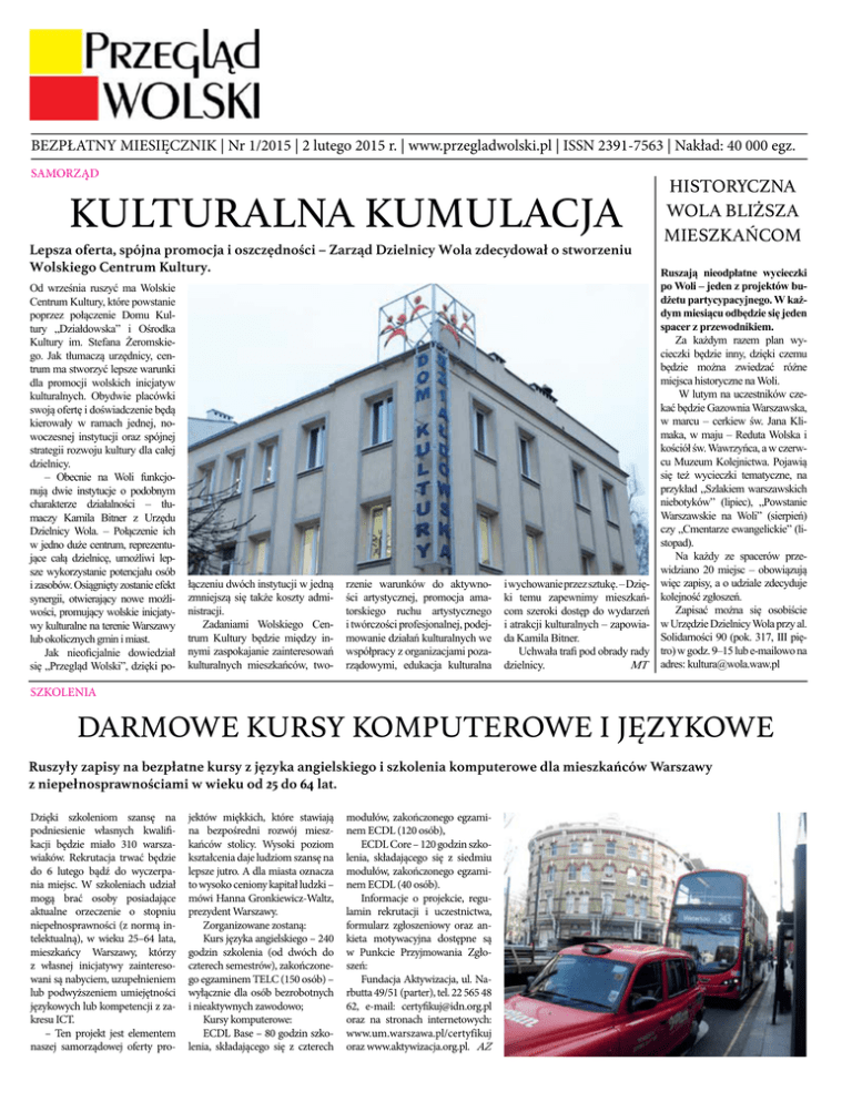 BEZPŁATNY MIESIĘCZNIK | Nr 1/2015 | 2 lutego 2015 r. | www.przegladwolski.pl | ISSN 2391-7563 | Nakład: 40 000 egz. SAMORZĄD KULTURALNA KUMULACJA Lepsza oferta, spójna promocja i oszczędności – Zarząd Dzielnicy Wola zdecydował o stworzeniu Wolskiego Centrum Kultury. Od września ruszyć ma Wolskie Centrum Kultury, które powstanie poprzez połączenie Domu Kultury „Działdowska” i Ośrodka Kultury im. Stefana Żeromskiego. Jak tłumaczą urzędnicy, centrum ma stworzyć lepsze warunki dla promocji wolskich inicjatyw kulturalnych. Obydwie placówki swoją ofertę i doświadczenie będą kierowały w ramach jednej, nowoczesnej instytucji oraz spójnej strategii rozwoju kultury dla całej dzielnicy. ‒ Obecnie na Woli funkcjonują dwie instytucje o podobnym charakterze działalności – tłumaczy Kamila Bitner z Urzędu Dzielnicy Wola. ‒ Połączenie ich w jedno duże centrum, reprezentujące całą dzielnicę, umożliwi lepsze wykorzystanie potencjału osób i zasobów. Osiągnięty zostanie efekt synergii, otwierający nowe możliwości, promujący wolskie inicjatywy kulturalne na terenie Warszawy lub okolicznych gmin i miast. Jak nieoficjalnie dowiedział się „Przegląd Wolski”, dzięki po- łączeniu dwóch instytucji w jedną zmniejszą się także koszty administracji. Zadaniami Wolskiego Centrum Kultury będzie między innymi zaspokajanie zainteresowań kulturalnych mieszkańców, two- rzenie warunków do aktywności artystycznej, promocja amatorskiego ruchu artystycznego i twórczości profesjonalnej, podejmowanie działań kulturalnych we współpracy z organizacjami pozarządowymi, edukacja kulturalna i wychowanie przez sztukę. ‒ Dzięki temu zapewnimy mieszkańcom szeroki dostęp do wydarzeń i atrakcji kulturalnych – zapowiada Kamila Bitner. Uchwała trafi pod obrady rady dzielnicy. MT HISTORYCZNA WOLA BLIŻSZA MIESZKAŃCOM Ruszają nieodpłatne wycieczki po Woli – jeden z projektów budżetu partycypacyjnego. W każdym miesiącu odbędzie się jeden spacer z przewodnikiem. Za każdym razem plan wycieczki będzie inny, dzięki czemu będzie można zwiedzać różne miejsca historyczne na Woli. W lutym na uczestników czekać będzie Gazownia Warszawska, w marcu – cerkiew św. Jana Klimaka, w maju – Reduta Wolska i kościół św. Wawrzyńca, a w czerwcu Muzeum Kolejnictwa. Pojawią się też wycieczki tematyczne, na przykład „Szlakiem warszawskich niebotyków” (lipiec), „Powstanie Warszawskie na Woli” (sierpień) czy „Cmentarze ewangelickie” (listopad). Na każdy ze spacerów przewidziano 20 miejsc – obowiązują więc zapisy, a o udziale zdecyduje kolejność zgłoszeń. Zapisać można się osobiście w Urzędzie Dzielnicy Wola przy al. Solidarności 90 (pok. 317, III piętro) w godz. 9–15 lub e-mailowo na adres: [email protected] SZKOLENIA DARMOWE KURSY KOMPUTEROWE I JĘZYKOWE Ruszyły zapisy na bezpłatne kursy z języka angielskiego i szkolenia komputerowe dla mieszkańców Warszawy z niepełnosprawnościami w wieku od 25 do 64 lat. Dzięki szkoleniom szansę na podniesienie własnych kwalifikacji będzie miało 310 warszawiaków. Rekrutacja trwać będzie do 6 lutego bądź do wyczerpania miejsc. W szkoleniach udział mogą brać osoby posiadające aktualne orzeczenie o stopniu niepełnosprawności (z normą intelektualną), w wieku 25–64 lata, mieszkańcy Warszawy, którzy z własnej inicjatywy zainteresowani są nabyciem, uzupełnieniem lub podwyższeniem umiejętności językowych lub kompetencji z zakresu ICT. – Ten projekt jest elementem naszej samorządowej oferty pro- jektów miękkich, które stawiają na bezpośredni rozwój mieszkańców stolicy. Wysoki poziom kształcenia daje ludziom szansę na lepsze jutro. A dla miasta oznacza to wysoko ceniony kapitał ludzki – mówi Hanna Gronkiewicz-Waltz, prezydent Warszawy. Zorganizowane zostaną: Kurs języka angielskiego – 240 godzin szkolenia (od dwóch do czterech semestrów), zakończonego egzaminem TELC (150 osób) – wyłącznie dla osób bezrobotnych i nieaktywnych zawodowo; Kursy komputerowe: ECDL Base – 80 godzin szkolenia, składającego się z czterech modułów, zakończonego egzaminem ECDL (120 osób), ECDL Core – 120 godzin szkolenia, składającego się z siedmiu modułów, zakończonego egzaminem ECDL (40 osób). Informacje o projekcie, regulamin rekrutacji i uczestnictwa, formularz zgłoszeniowy oraz ankieta motywacyjna dostępne są w Punkcie Przyjmowania Zgłoszeń: Fundacja Aktywizacja, ul. Narbutta 49/51 (parter), tel. 22 565 48 62, e-mail: [email protected] oraz na stronach internetowych: www.um.warszawa.pl/certyfikuj oraz www.aktywizacja.org.pl. AZ 2 Przegląd Wolski nr 1, 2 lutego 2015 r. FELIETON FELIETON Należy się zastanowić, czy podział planu nie usprawniłby procesu jego uchwalenia, zwłaszcza tej części, która jest oczekiwana przez mieszkańców Odolan. Dzielnicowa Komisja Dialogu Społecznego na Woli ma już przewodniczącego. Wkrótce wystąpimy z wieloma ciekawymi propozycjami. PRZYSPIESZYĆ PLAN Jednym z waż-niejszych wyzwań stojących przed Komisją Ładu Przestrzennego m.st. Warszawy jest doprowadzenie do uchwalenia miejscowego planu zagospodarowania przestrzennego obszaru Odolan, do którego sporządzenia Rada Warszawy przystąpiła w dniu 14 kwietnia 2011 r. Obszar Odolan to teren zróżnicowany ze względu na obecne zagospodarowanie. Północna część obszaru, tj. rejon ul. Jana Kazimierza, to pozostałości zabudowy produkcyjno-usługowej, a obecnie przedmiot zainteresowania inwestorów i rosnącego ruchu budowlanego. Ten zdegradowany przestrzennie teren, na którym często bez troski o estetykę i ład przestrzenny stały magazyny, hale czy skła- dy, zmienia dynamicznie swój wizerunek oraz ma szansę zostać nowoczesną częścią Woli. Południowa część obszaru to w ogromnej przewadze tereny kolejowe, których znaczenie funkcjonalne systematycznie maleje. Pośród terenów kolejowych zlokalizowane s