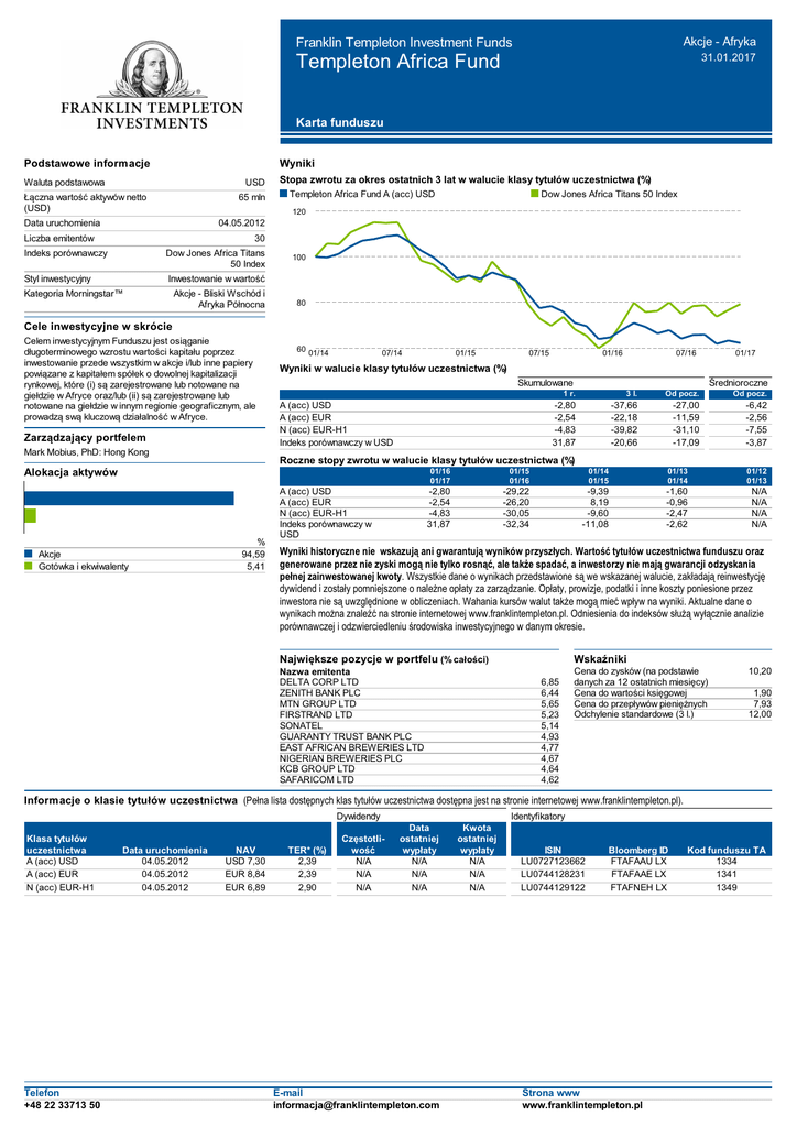 Franklin Templeton Investment Funds Akcje - Afryka Templeton Africa Fund 31.01.2017 Karta funduszu Podstawowe informacje Wyniki Waluta podstawowa USD Łączna wartość aktywów netto (USD) 65 mln Stopa zwrotu za okres ostatnich 3 lat w walucie klasy tytułów uczestnictwa (%) Templeton Africa Fund A (acc) USD Dow Jones Africa Titans 50 Index 120 Data uruchomienia 04.05.2012 Liczba emitentów 30 Indeks porównawczy Dow Jones Africa Titans 50 Index Styl inwestycyjny Inwestowanie w wartość Kategoria Morningstar™ Akcje - Bliski Wschód i Afryka Północna 100 80 Cele inwestycyjne w skrócie Celem inwestycyjnym Funduszu jest osiąganie długoterminowego wzrostu wartości kapitału poprzez inwestowanie przede wszystkim w akcje i/lub inne papiery powiązane z kapitałem spółek o dowolnej kapitalizacji rynkowej, które (i) są zarejestrowane lub notowane na giełdzie w Afryce oraz/lub (ii) są zarejestrowane lub notowane na giełdzie w innym regionie geograficznym, ale prowadzą swą kluczową działalność w Afryce. Zarządzający portfelem Mark Mobius, PhD: Hong Kong 60 01/14 07/14 07/15 01/16 07/16 Skumulowane A (acc) USD A (acc) EUR N (acc) EUR-H1 Indeks porównawczy w USD 01/17 Średnioroczne 1 r. 3 l. Od pocz. Od pocz. -2,80 -2,54 -4,83 31,87 -37,66 -22,18 -39,82 -20,66 -27,00 -11,59 -31,10 -17,09 -6,42 -2,56 -7,55 -3,87 Roczne stopy zwrotu w walucie klasy tytułów uczestnictwa (%) Alokacja aktywów Akcje Gotówka i ekwiwalenty 01/15 Wyniki w walucie klasy tytułów uczestnictwa (%) % 94,59 5,41 A (acc) USD A (acc) EUR N (acc) EUR-H1 Indeks porównawczy w USD 01/16 01/17 01/15 01/16 01/14 01/15 01/13 01/14 01/12 01/13 -2,80 -2,54 -4,83 31,87 -29,22 -26,20 -30,05 -32,34 -9,39 8,19 -9,60 -11,08 -1,60 -0,96 -2,47 -2,62 N/A N/A N/A N/A Wyniki historyczne nie wskazują ani gwarantują wyników przyszłych. Wartość tytułów uczestnictwa funduszu oraz generowane przez nie zyski mogą nie tylko rosnąć, ale także spadać, a inwestorzy nie mają gwarancji odzyskania pełnej zainwestowanej kwoty. Wszystkie dane o wynikach przedstawione są we wskazanej walucie, zakładają reinwestycję dywidend i zostały pomniejszone o należne opłaty za zarządzanie. Opłaty, prowizje, podatki i inne koszty poniesione przez inwestora nie są uwzględnione w obliczeniach. Wahania kursów walut także mogą mieć wpływ na wyniki. Aktualne dane o wynikach można znaleźć na stronie internetowej www.franklintempleton.pl. Odniesienia do indeksów służą wyłącznie analizie porównawczej i odzwierciedleniu środowiska inwestycyjnego w danym okresie. Największe pozycje w portfelu (% całości) Nazwa emitenta DELTA CORP LTD ZENITH BANK PLC MTN GROUP LTD FIRSTRAND LTD SONATEL GUARANTY TRUST BANK PLC EAST AFRICAN BREWERIES LTD NIGERIAN BREWERIES PLC KCB GROUP LTD SAFARICOM LTD Wskaźniki 6,85 6,44 5,65 5,23 5,14 4,93 4,77 4,67 4,64 4,62 Cena do zysków (na podstawie danych za 12 ostatnich miesięcy) Cena do wartości księgowej Cena do przepływów pieniężnych Odchylenie standardowe (3 l.) 10,20 1,90 7,93 12,00 Informacje o klasie tytułów uczestnictwa (Pełna lista dostępnych klas tytułów uczestnictwa dostępna jest na stronie internetowej www.franklintempleton.pl). Dywidendy Klasa tytułów uczestnictwa A (acc) USD A (acc) EUR N (acc) EUR-H1 Telefon +48 22 33713 50 Data uruchomienia 04.05.2012 04.05.2012 04.05.2012 NAV USD 7,30 EUR 8,84 EUR 6,89 TER* (%) 2,39 2,39 2,90 Częstotliwość N/A N/A N/A Identyfikatory Data ostatniej wypłaty N/A N/A N/A E-mail [email protected] Kwota ostatniej wypłaty N/A N/A N/A ISIN LU0727123662 LU0744128231 LU0744129122 Bloomberg ID FTAFAAU LX FTAFAAE LX FTAFNEH LX Strona www www.franklintempleton.pl Kod funduszu TA 1334 1341 1349 Templeton Africa Fund 31.01.2017 Skład portfela Templeton Africa Fund Dow Jones Africa Titans 50 Index Alokacja geograficzna RPA Nigeria Kenia Egipt Zimbabwe Botswana Senegal Mauritius Tanzania Inne Gotówka i ekwiwalenty Rozkład kapitalizacji rynkowej w USD <2,00 miliardów 2,00-5,00 miliardów 5,00-10,00 miliardów 10,00-25,00 miliardów >50,00 miliardów 23,61 16,97 16,58 12,17 6,85 5,15 5,14 3,81 3,17 1,15 5,41 % całości / 23,06 / 9,65 / 4,57 / 9,27 / 0,00 / 0,00 / 0,00 / 0,00 / 0,00 / 53,45 / 0,00 Alokacja sektorowa Finanse Dobra podstawowe Usługi telekomunikacyjne Dobra wyższego rzędu Ochrona zdrowia Przemysł Surowce Energia Nieruchomości Gotówka i ekwiwalenty 36,94 27,49 16,03 9,28 2,77 2,08 0,00 0,00 0,00 5,41 % całości / 33,68 / 6,05 / 8,91 / 11,08 / 0,98 / 0,00 / 27,63 / 9,75 / 1,90 / 0,00 % akcji 46,65 28,83 9,02 13,10 2,40 Ważne informacje Franklin Templeton Investment Funds ('Fundusz') to spółka SICAV z siedzibą w Luksemburgu. O ile nie zaznaczono inaczej, źródłem danych i informacji zawartych w niniejszym dokumencie jest Franklin Templeton Investments, a dane są aktualne na dzień wydania niniejszego dokumentu. O ile nie zaznaczono inaczej, dane dotyczące indeksów porównawczych pochodzą od FactSet i są aktualne na dzień wydania niniejszego dokumentu. Niniejszy dokument nie stanowi porady prawnej, podatkowej ani inwestycyjnej ani oferty tytułów uczestnictwa Funduszu. Decyzje o zapisach na tytuły uczestnictwa Funduszu należy podejmować wyłącznie w oparciu o informacje zawarte w aktualnym prospekcie Funduszu oraz w „Kluczowych informacjach dla inwestorów” (o ile taki dokument jest dostępny), a także w ostatnim poddanym audytowi sprawozdaniu rocznym lub półrocznym, które można znaleźć na naszej stronie internetowej www.franklintempleton.pl lub otrzymać bezpłatnie od Templeton Asset Management (Poland) TFI S.A., Rondo ONZ 1; 00-124 Warszawa, tel.: 48 22 337 13 50, faks: 48 22 337 13 70. Tytuły uczestnictwa Funduszu nie mogą być bezpośrednio ani pośrednio oferowane ani sprzedawane rezydentom Stanów Zjednoczonych Ameryki. Tytuły uczestnictwa Funduszu mogą nie być dopuszczone do obrotu pod niektórymi jurysdykcjami, a inwestor zainteresowany tym Funduszem powinien sprawdzić