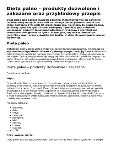 Dieta paleo – produkty dozwolone i zakazane oraz przykładowy przepis Dieta paleo jako sposób żywienia powinna charakteryzować się pewnymi cechami diety naszych praprzodków. Polega ona na jedzeniu produktów, które dostępne były wiele lat przed naszą erą. Nie znaczy to bezpośrednio, że należy żywić się tym, co sami upolujemy – jednakże jako świadomi konsumenci możemy dokonywać właściwych wyborów z szerokiej puli produktów dostępnych na rynku. Ważne jest, aby unikać produktów modyfikowanych przez człowieka lub takich, w których powstawaniu miał on ingerencję. Dieta paleo Ostatnimi czasy dieta paleo staje się coraz bardziej popularna. Inspiracją do jej stworzenia była dieta człowieka paleolitycznego – stąd jej nazwa. Głównymi założeniami jest wybór jak najmniej przetworzonych produktów. Dużą rolę odgrywa w niej mięso. Twórcy diety podkreślają wagę nie tylko odpowiednich posiłków bogatych w białko i błonnik, ale także odpowiednie nawodnienie organizmu i aktywność fizyczną. Dzięki temu zyskamy szczupłą sylwetkę i świetne samopoczucie. Dieta paleo – produkty dozwolone i zakazane Produkty dozwolone Mięso Człowiek paleolityczny spożywał to, co upolował – w pierwszej kolejności jedząc podroby oraz tłuszcz. Najbardziej wartościowa pod względem odżywczym w diecie paleo jest dziczyzna. Dlaczego? Zwierzęta wolnożyjące spożywają naturalną żywność znajdującą się w ich ekosystemie. Zapewnia to najwyższą jakość odżywczą mięsa. Zalecane w diecie paleo są więc: dziki, sarny, jelenie, dzikie kaczki, przepiórki i bażanty. Z mięs hodowlanych warto spożywać mięsa takie jak: jagnięcina, cielęcina, wołowina, rzadziej wieprzowina i drób. Produkty zalecane: baranina, dzik, indyk, cielęcina, jagnięcina, jeleń, kaczka, konina, kurczak, królik. Ryby i owoce morza Dieta paleo zakłada spożywanie ryb i owoców morza kilka razy w tygodniu. Te drugie, dzięki zmniejszonej zdolności akumulowania metali ciężkich oraz dużej dawce kwasów tłuszczowych z rodziny omega-3 potrafią być bardziej wartościowe niż ryby hodowane masowo. Najbardziej pożądane są ryby pochodzące z naturalnych łowisk, niedokarmiane sztucznymi mieszankami na bazie mączki kukurydzianej czy też zboża. Jak doskonale wiemy, nie jest to naturalny pokarm ryb, ma on na celu szybkie zwiększenie masy zwierząt hodowlanych. Ryby w diecie paleo zalecane są w formie surowej, gotowanej, duszonej czy pieczonej. Konserwy rybne, produkty mrożone, gotowe posiłki zawierające w swoim składzie ryby czy owoce morza powinny być odstawione lub spożywane maksymalnie dwa razy w miesiącu. Produkty zalecane: dorsz, flądra, halibut, łosoś, makrela, śledź, pstrąg, sardynki, tuńczyk, homar, krewetki, małże, raki, ośmiorniczki, ślimaki. Jaja Jaja są źródłem pełnowartościowego białka w diecie paleo, można je spożywać bez większych ograniczeń. Stanowią idealne źródło wielu witamin, lecytyny, luteiny i żelaza. Jednak tutaj też obowiązują zasady – chodzi o staranne wybranie produktu. Jaja w diecie paleo powinny pochodzić z chowu wolnoklatkowego, tzw. jaja ekologiczne. Obecnie na rynku można zauważyć dużą różnorodność sprzedawanych jaj – nie jest więc problemem znalezienie na sklepowych półkach jaj przepiórczych, kaczych, gęsich a nawet strusich. Warto więc zadbać o zapewnienie różnorodności. Tłuszcze Tłuszcze w diecie paleo są jednym z podstawowych składników diety, warto więc przywiązać szczególną uwagę do tego, które z nich najlepiej spożywać. Wiele diet alternatywnych odradza spożywanie NKT (nasyconych kwasów tłuszczowych) pochodzenia zwierzęcego. Dieta paleo różni się tym od innych, że odsuwa na bok większość tłuszczów pochodzenia roślinnego uważając je za nienaturalne dla człowieka. Argumentem, który przemawia na ich niekorzyść jest również zdolność do szybkiego utleniania, co może mieć destrukcyjny wpływ na błony komórkowe człowieka. Jednym z niewielu zalecanych tłuszczów pochodzenia roślinnego jest olej z wiesiołka – ze względu na bogatą zawartość kwasów tłuszczowych GLA – wspomagających pracę naszego układu nerwowego i mózgu. Świetnym źródłem tłuszczu w diecie paleo są: ziarna, pestki i orzechy – mają one jednak wysoką zawartość substancji antyodżywczych – fitynianów. Aby zablokować ich szkodliwe działanie, zaleca się moczenie pestek, ziaren i orzechów przez noc przed spożyciem. Produkty zalecane: olej kokosowy, olej MCT, olej palmowy, oliwa z oliwek, smalec i łój, masło, masło kokosowe, olej z wiesiołka, ghee, awokado, orzechy macadamia, pestki dyni, orzeszki piniowe, orzechy laskowe, orzechy włoskie, słonecznik, kokos, kasztany jadalne. Warzywa i owoce Pierwszą i najważniejszą zasadą diety paleo jest unikanie warzyw bogatych w skrobię. Bez obaw natomiast możemy włączyć do jadłospisu wszystkie inne warzywa, zarówno w formie surowej jak i gotowanej. Są one niezastąpionym źródłem witamin, składników mineralnych, a także przeciwutleniaczy i stanoli roślinnych. Dieta paleo na szczycie swojej piramidy żywieniowej ma owoce – oznacza to, że na te słodkości można pozwolić sobie rzadziej niż na warzywa. Owoce o wysokiej zawartości fruktozy mogą powodować hiperglikemię poprzez nasilenie insulinooporności. Jednak przy uprawianiu regularnej aktywności fizycznej nie należy restrykcyjnie podchodzić do tej zasady. Produkty zalecane: bakłażan, buraczki, bób, cykoria, cebula, dynia, jarmuż, brokuły, kalafior, koper włoski, seler, marchew, por, rzepa, sałata, szparagi, szpinak, agrest, ananas, brzoskwinia, borówka, gruszka, malina, liczi, pigwa, jabłko, poziomka, śliwka, banan, cytryna. Produkty zakazane Dieta paleo to, jak już nam wiadomo, dieta bazująca na naturalnych składnikach. Należy więc wyeliminować wszystkie wysokoprzetworzone produkty spożywcze, pr