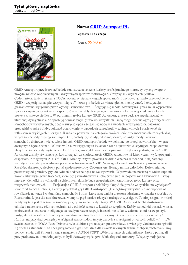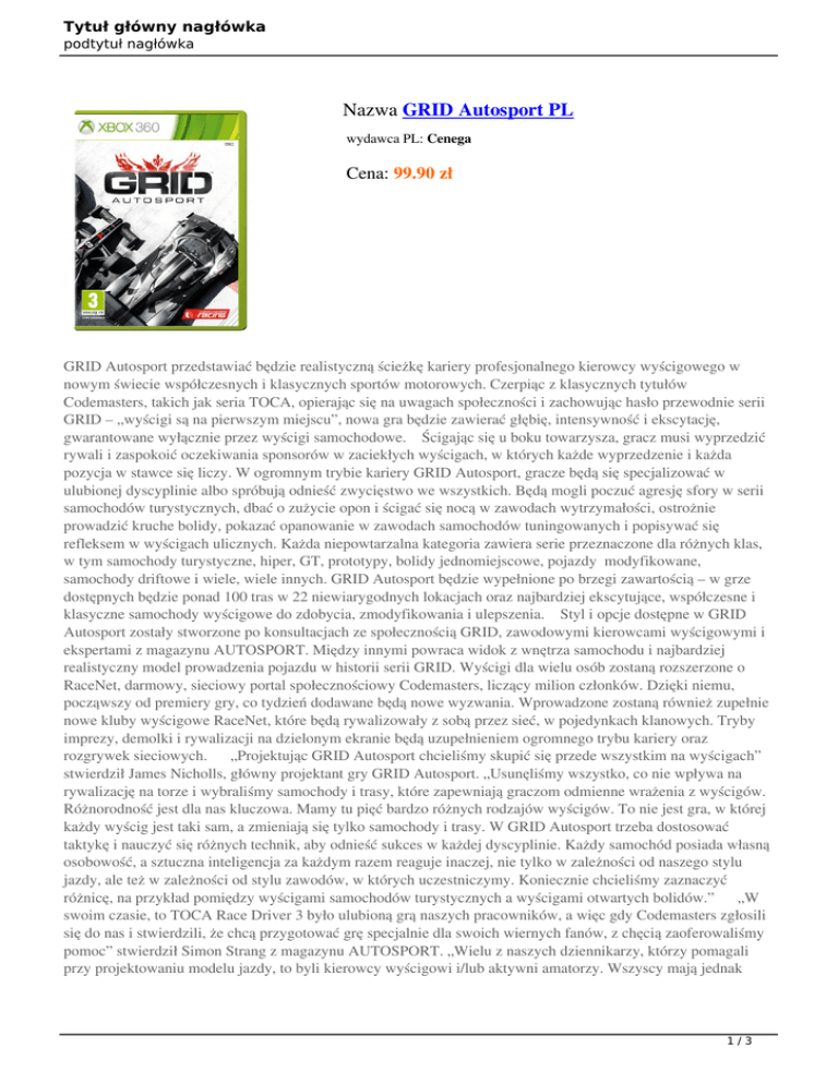 Tytuł główny nagłówka podtytuł nagłówka Nazwa GRID Autosport PL wydawca PL: Cenega Cena: 99.90 zł GRID Autosport przedstawiać będzie realistyczną ścieżkę kariery profesjonalnego kierowcy wyścigowego w nowym świecie współczesnych i klasycznych sportów motorowych. Czerpiąc z klasycznych tytułów Codemasters, takich jak seria TOCA, opierając się na uwagach społeczności i zachowując hasło przewodnie serii GRID – „wyścigi są na pierwszym miejscu”, nowa gra będzie zawierać głębię, intensywność i ekscytację, gwarantowane wyłącznie przez wyścigi samochodowe. Ścigając się u boku towarzysza, gracz musi wyprzedzić rywali i zaspokoić oczekiwania sponsorów w zaciekłych wyścigach, w których każde wyprzedzenie i każda pozycja w stawce się liczy. W ogromnym trybie kariery GRID Autosport, gracze będą się specjalizować w ulubionej dyscyplinie albo spróbują odnieść zwycięstwo we wszystkich. Będą mogli poczuć agresję sfory w serii samochodów turystycznych, dbać o zużycie opon i ścigać się nocą w zawodach wytrzymałości, ostrożnie prowadzić kruche bolidy, pokazać opanowanie w zawodach samochodów tuningowanych i popisywać się refleksem w wyścigach ulicznych. Każda niepowtarzalna kategoria zawiera serie przeznaczone dla różnych klas, w tym samochody turystyczne, hiper, GT, prototypy, bolidy jednomiejscowe, pojazdy modyfikowane, samochody driftowe i wiele, wiele innych. GRID Autosport będzie wypełnione po brzegi zawartością – w grze dostępnych będzie ponad 100 tras w 22 niewiarygodnych lokacjach oraz najbardziej ekscytujące, współczesne i klasyczne samochody wyścigowe do zdobycia, zmodyfikowania i ulepszenia. Styl i opcje dostępne w GRID Autosport zostały stworzone po konsultacjach ze społecznością GRID, zawodowymi kierowcami wyścigowymi i ekspertami z magazynu AUTOSPORT. Między innymi powraca widok z wnętrza samochodu i najbardziej realistyczny model prowadzenia pojazdu w historii serii GRID. Wyścigi dla wielu osób zostaną rozszerzone o RaceNet, darmowy, sieciowy portal społecznościowy Codemasters, liczący milion członków. Dzięki niemu, począwszy od premiery gry, co tydzień dodawane będą nowe wyzwania. Wprowadzone zostaną również zupełnie nowe kluby wyścigowe RaceNet, które będą rywalizowały z sobą przez sieć, w pojedynkach klanowych. Tryby imprezy, demolki i rywalizacji na dzielonym ekranie będą uzupełnieniem ogromnego trybu kariery oraz rozgrywek sieciowych. „Projektując GRID Autosport chcieliśmy skupić się przede wszystkim na wyścigach” stwierdził James Nicholls, główny projektant gry GRID Autosport. „Usunęliśmy wszystko, co nie wpływa na rywalizację na torze i wybraliśmy samochody i trasy, które zapewniają graczom odmienne wrażenia z wyścigów. Różnorodność jest dla nas kluczowa. Mamy tu pięć bardzo różnych rodzajów wyścigów. To nie jest gra, w której każdy wyścig jest taki sam, a zmieniają się tylko samochody i trasy. W GRID Autosport trzeba dostosować taktykę i nauczyć się różnych technik, aby odnieść sukces w każdej dyscyplinie. Każdy samochód posiada własną osobowość, a sztuczna inteligencja za każdym razem reaguje inaczej, nie tylko w zależności od naszego stylu jazdy, ale też w zależności od stylu zawodów, w których uczestniczymy. Koniecznie chcieliśmy zaznaczyć różnicę, na przykład pomiędzy wyścigami samochodów turystycznych a wyścigami otwartych bolidów.” „W swoim czasie, to TOCA Race Driver 3 było ulubioną grą naszych pracowników, a więc gdy Codemasters zgłosili się do nas i stwierdzili, że chcą przygotować grę specjalnie dla swoich wiernych fanów, z chęcią zaoferowaliśmy pomoc” stwierdził Simon Strang z magazynu AUTOSPORT. „Wielu z naszych dziennikarzy, którzy pomagali przy projektowaniu modelu jazdy, to byli kierowcy wyścigowi i/lub aktywni amatorzy. Wszyscy mają jednak 1/3 Tytuł główny nagłówka podtytuł nagłówka dogłębną wiedzę na temat wszystkich sportów motorowych. Spędzili oni mnóstwo weekendów w padokach, dzięki czemu Codemasters mogli skorzystać z ich wiedzy i poznać drobne szczegóły, które w przeciwnym wypadku mogłyby im umknąć. W tej grze, choć model jazdy jest niezwykle realistyczny, nie trzeba spędzić wielu godzin, by go opanować - i o to właśnie chodzi w prawdziwych wyścigach. Po prostu chcemy poczuć, jak to jest się ścigać. Mamy nadzieję, że Codemasters udało się osiągnąć odpowiednią równowagę w GRID Autosport i właśnie w tym chcieliśmy pomóc. Różnorodność samochodów i tras to kolejny element, w którym z chęcią pomogliśmy. Bardzo się cieszymy, że powracają tradycyjne serie samochodów turystycznych i klasyczne trasy to świetna wiadomość dla fanów gier wyścigowych.” GRID Autosport będzie też najbardziej skalowalną grą Codemasters na PC. Na zaawansowanych systemach, GRID Autosport wykorzystywać będzie tekstury w rozdzielczości 4K, obsługiwać wyjście 4K i dostarczać wrażeń wyścigowych 1080p w 60 klatkach na sekundę. Gra została też zoptymalizowana, by doskonale działać na jak największej ilości systemów i dotrzeć do jak najszerszego grona użytkowników PC. Zespół producencki Codemasters na PC skorzystał także ze współpracy z firmą Intel®, dzięki czemu posiadacze sprzętu tej firmy skorzystają z wielu ulepszeń i po raz pierwszy w historii będą mogli zagrać na tabletach. „Dzięki ścisłej współpracy z Codemasters, bijemy nowe rekordy optymalizacji gry GRID Autosport, działającej na architekturze Intela” stwierdził Richard Huddy, główny promotor gier w firmie Intel. „Mówiąc w skrócie, rozszerzyliśmy ilość urządzeń, obsługiwanych przez GRID Autosport. Gra świetnie działa na komputerach PC ze zintegrowanymi procesorami graficznymi i po raz pierwszy również na tabletach, opartych o procesory Intel Atom™. Pod tym względem to a