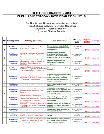 STAFF PUBLICATIONS - 2010 PUBLIKACJE PRACOWNIKÓW IFPAN Z ROKU 2010 Publikacje opublikowne w czasopismach z listy Filadelfijskiego Instytutu Informacji Naukowej (Science - Thomson Reuters) (Journal Citation Report) Nr Czasopismo 1 Acta Physica Polonica A 4 Acta Physica Polonica A vol. 117 (4), 607610 (2010) Gajda D. , Zaleski A. , Dyakonov V. , Pinning force in superconducting Matrosov N.I. , Szymczak H. , Beloshenko wires Nb-Ti V.A. , Spuskanyuk V.Z. , Chishko V.V. vol. 118 (2), 364365 (2010) Acta Physica Polonica A Karpio K. , Orłowski A. , Łukasiewicz P. Stock Indices for Emerging Markets Acta Physica Polonica A Kulik M. , Kobzew A. , Misiuk A. , Wierzchowski W. , Wieteska K. , BąkMisiuk J. Composition and structure of Czochralski silicon implanted with vol. 117 (2), 332335 (2010) H2+ and annealed under enhanced hydrostatic pressure Acta Physica Polonica A 8 11 12 Structure and superconductivity of FeSe1-x and FeTe1-ySey crystals: Gawryluk D. , Fink-Finowicki J. , vol. 118 (2), 331Wiśniewski A. , Puźniak R. , Domukhovski dependence on the synthesis 335 (2010) V. , Diduszko R. , Berkowski M. methods, starting composition, and growth conditions Acta Physica Polonica A 7 10 vol. 118, 396-398 (2010) Dyakonov V. , Szytuła A. , Baran S. , Magnetic properties of the Kravchenko Z. , Zubov E. , Iesenchuk O. , nanocrystalline DyMnO3 Bazela W. , Dul M. , Zarzycki A. , compound Szymczak H. 5 9 Inhomogeneous Magnetic Field Penetration in Superconducting Niobium Films vol., pp, rok From Cuprate to Nickelate: Bezusyy V. , Malinowski A. , Minikayev R. Evolution of the Normal State vol. 118 (2), 402, Paszkowicz W. , Dziawa P. , Gorzelniak 405 (2010) Properties with Ni from La1.85 R. Sr0.15 CuO4 to La1.85 Sr0.15 NiO4 Acta Physica Polonica A 6 Abal'osheva I. , Abal'oshev O. , Cieplak M.Z. , Zhu L.Y. , Chien C.L. Tytuł publikacji Acta Physica Polonica A 2 3 Autorzy publikacji Acta Physica Polonica A Lewandowski S.J. , Berkowski M. , Tarenkov V.Y. , D'yachenko A.I. , Abal'oshev O. , Abal'osheva I. , Gawryluk D. , Domukhovski V. , Sidorov S.L. , Boichenko D.I. Malinowski A. , Bezusyy V. , Minikayev R. , Paszkowicz W. , Dziawa P. , Syryanyy Y. , Sawicki M. Magnetic Properties of FeSeTe Compound Crystallized from Liquid Phase vol. 117, 619-622 (2010) Impact factor Uwagi 0,433 [3/5, KK] 0,433 [5/6, KK] 0,433 [3/10, KK] 0,433 [2/8, KK] 0,433 [7/7, KK] 0,433 [1/3, KK] 0,433 [1/6, KK] 0,433 [6/10, KK] 0,433 [7/7, KK] 0,433 [1/3, KK] 0,433 [3/5, KK] 0,433 [1/8, KK] vol. 118 (2), 289291 (2010) Magnetic Nature of a Ni Dopant in La1.85 Sr0.15 CuO4: Spin- Glass Behavior vol. 118 (2), 244248 (2010) Genetic Algorithms Approach to Community Detection vol. 117, 703-705 (2010) Equation of state of zircon-type TbVO4 vol. 117 (2), 319322 (2010) Acta Physica Polonica A Mazur P. , Zmarzłowski K. , Orłowski A. Acta Physica Polonica A Minikayev R. , Paszkowicz W. , WernerMalento E. , Lathe C. , Dąbkowska H. Acta Physica Polonica A Misiuk A. , Wierzchowski W. , Wieteska K. Defect structure of nitrogen doped vol. 117 (2), 344, Londos C.A. , Andrianakis A. , BąkCzochralski silicon annealed 347 (2010) Misiuk J. , Yang D. , Surma B.. under enhanced pressure Acta Physica Polonica A 13 14 15 16 17 Acta Physica Polonica A Lattice parameter of Paszkowicz W. , Piszora P. , Łasocha W. , vol. 117 (2), 323polycrystalline diamond in the lowMargiolaki I. , Brunelli M. , Fitch A. 327 (2010) temperature range Paszkowicz W. , Sikora M. , Szuszkiewicz vol. 117 (2), 256Preface W. 257 (2010) Acta Physica Polonica A Paszkowicz W. , Wolska A. , Klepka M. , Abd El All S. , Ezz-Eldin F. Acta Physica Polonica A Combined x-ray diffraction and absorption study of crystalline vanadium-doped lithium disilicate vol. 117 (2), 315318 (2010) Pełka J. , Tybor K. , Nietubyć R. , Wrochna G. Applications of free electron lasers in biology and medicine vol. 117 (2), 427432 (2010) Pietrzyk M. , Kowalski B. , Orłowski B. , Knoff W. , Story T. , Dobrowolski W. , Slynko V.E. , Slynko E.I. , Johnson R.L. A Comparison of the Valence Band Structure of Bulk and Epitaxial GeTe-based Diluted Magnetic Semiconductors vol. 117 (2), 293295 (2010) Acta Physica Polonica A Przysłupski P. , Dybko K. , WernerMalento K. , Aleshkevych P. , Wójcik M. , Sawicki M. Signature of the spin triplet phase in vol. 118 (2), 313 (2010) La0.7Sr0.3MnO3/Yba2Cu3O7/La0.7 Sr0.3MnO3 trilayers Acta Physica Polonica A Romanowski P. , Bąk-Misiuk J. , Dynowska E. , Domagała J.Z. , Sadowski J. , Wojciechowski T. , Barcz A. , Jakieła R. , Caliebe W. Defect Structure of HighTemperature-Grown GaMnSb/GaSb Acta Physica Polonica A Acta Physica Polonica A 18 19 20 The influence of magnetic history Nabiałek A. , Vasiliev S. , Chabanenko V. , on the stability of critical state and vol. 118 (2), 343Perez-Rodriguez F. , Piechota S. , 345 (2010) the dynamics of flux jumps in Szymczak H. conventional NbTi superconductor Acta Physica Polonica A 21 Identification of the domain walls Savytskii D.I. , Paulmann C. , Bismayer U. configuration in the ferroelastic , Berkowski M. nanosize material La0.95Sr0.05Ga0.9Mg0.1O3-x Syryanyy Y. , Zhu L.Y. , Cieplak M.Z. , Chien C.L. Acta Physica Polonica A Szymczak R. , Bludov A.N. , Gnatchenko S.L. , Barilo S.N. , Jezierski A. , Szymczak H. Szymczak R. , Kolano R. , Kolano-Burian A. , Dyakonov V. , Szymczak H. Ubizskii S.B. , Vasylechko L.O. , Zhydachevskii Y.. , Suchocki A. , Sugak D.Y. Field-induced magnetic order in frustrated TbBaCo4O7 single crystals Giant magnetocaloric effect in manganites 24 25 Vasiliev S. , Nabiałek A. , Rusakov V.F. , Belevtsov L.V. , Chabanenko V. , Szymczak H. The influence of the magnetic field vol. 118 (2), 340on the dynamics of the flux jumps 342 (2010) in the flux flow model 26 Acta Physica Polonica A Werner-Malento E. , Paszkowicz W. , Fidelus J.D. , Godlewski M. , Yatsunenko S. Effect of annealing on the crystal vol. 117 (1), 91-97 structure and microstructure of Pr (2010) doped Zr)2-Y2O3 nanocrystals 27 Acta Physica Polonica A Wols